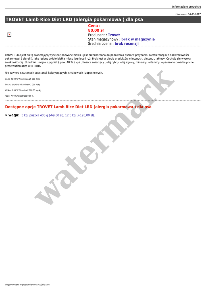 Informacje o produkcie Utworzono 06-03-2017 TROVET Lamb Rice Diet LRD (alergia pokarmowa ) dla psa Cena : 80,00 zł Producent : Trovet Stan magazynowy : brak w magazynie Średnia ocena : brak recenzji TROVET LRD jest dietą zawierającą wyselekcjonowane białka i jest przeznaczona do podawania psom w przypadku nietolerancji lub nadwrażliwości pokarmowej ( alergii ). Jako jedyne źródło białka mięso jagnięce i ryż. Brak jest w diecie produktów mlecznych, glutenu , laktozy. Cechuje się wysoką smakowitością. Składniki : mięso z jagniąt ( pow. 40 % ), ryż , tłuszcz zwierzęcy , olej rybny, olej sojowy, minerały, witaminy, wysuszone drożdże piwne, przeciwutleniacze BHT i BHA. Nie zawiera sztucznych substancji koloryzujących, smakowych i zapachowych. Tłuszcz 14,00 % Witamina D 2 000 IU/kg Włókno 1,00 % Witamina E 100.00 mg/kg Popiół 7,00 % Wilgotność 9,00 % er m ar k Białka 20,00 % Witamina A 25 000 IU/kg Dostępne opcje TROVET Lamb Rice Diet LRD (alergia pokarmowa ) dla psa w at » waga: 3 kg, puszka 400 g (-69,00 zł), 12,5 kg (+195,00 zł). Wygenerowano w programie www.oscGold.com