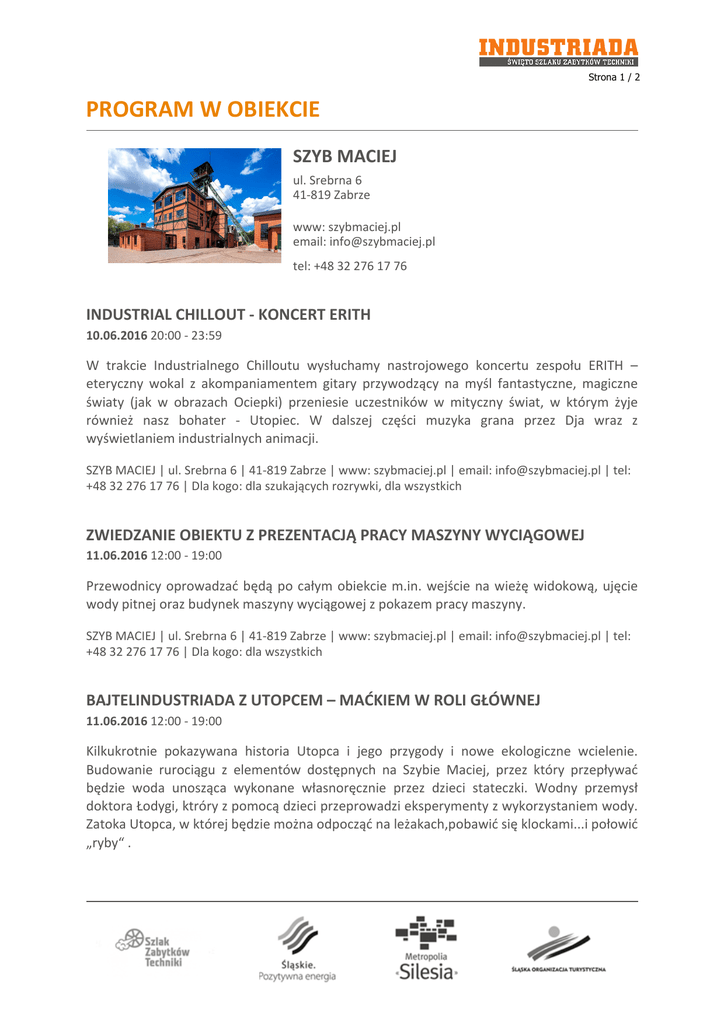 Strona 1 / 2 PROGRAM W OBIEKCIE SZYB MACIEJ ul. Srebrna 6 41-819 Zabrze www: szybmaciej.pl email: [email protected] tel: +48 32 276 17 76 INDUSTRIAL CHILLOUT - KONCERT ERITH 10.06.2016 20:00 - 23:59 W trakcie Industrialnego Chilloutu wysłuchamy nastrojowego koncertu zespołu ERITH – eteryczny wokal z akompaniamentem gitary przywodzący na myśl fantastyczne, magiczne światy (jak w obrazach Ociepki) przeniesie uczestników w mityczny świat, w którym żyje również nasz bohater - Utopiec. W dalszej części muzyka grana przez Dja wraz z wyświetlaniem industrialnych animacji. SZYB MACIEJ | ul. Srebrna 6 | 41-819 Zabrze | www: szybmaciej.pl | email: [email protected] | tel: +48 32 276 17 76 | Dla kogo: dla szukających rozrywki, dla wszystkich ZWIEDZANIE OBIEKTU Z PREZENTACJĄ PRACY MASZYNY WYCIĄGOWEJ 11.06.2016 12:00 - 19:00 Przewodnicy oprowadzać będą po całym obiekcie m.in. wejście na wieżę widokową, ujęcie wody pitnej oraz budynek maszyny wyciągowej z pokazem pracy maszyny. SZYB MACIEJ | ul. Srebrna 6 | 41-819 Zabrze | www: szybmaciej.pl | email: [email protected] | tel: +48 32 276 17 76 | Dla kogo: dla wszystkich BAJTELINDUSTRIADA Z UTOPCEM – MAĆKIEM W ROLI GŁÓWNEJ 11.06.2016 12:00 - 19:00 Kilkukrotnie pokazywana historia Utopca i jego przygody i nowe ekologiczne wcielenie. Budowanie rurociągu z elementów dostępnych na Szybie Maciej, przez który przepływać będzie woda unosząca wykonane własnoręcznie przez dzieci stateczki. Wodny przemysł doktora Łodygi, ktróry z pomocą dzieci przeprowadzi eksperymenty z wykorzystaniem wody. Zatoka Utopca, w której będzie można odpocząć na leżakach,pobawić się klockami...i połowić „ryby“ . Strona 2 / 2 SZYB MACIEJ | ul. Srebrna 6 | 41-819 Zabrze | www: szybmaciej.pl | email: [email protected] | tel: +48 32 276 17 76 | Dla kogo: dla rodzin z dziećmi SILESIA FOLK DESIGN – PREZENTACJA TRADYCYJNYCH ŚLĄSKICH STROJÓW W NOWOCZESNEJ ODSŁONIE 11.06.2016 12:00 - 19:00 Podziwiać będzie można wystawę tradycyjnych śląskich żakietów – jakli – w zupełnie nowej, odświeżonej formie. Dzięki projektowi Silesia Folk Design oraz pomysłodawczyni i projektantce Aleksandrze Malczyk, powstały stroje nawiązujące do regionalnej tradycji, które z powodzeniem mogą być noszone współcześnie. SZYB MACIEJ | ul. Srebrna 6 | 41-819 Zabrze | www: szybmaciej.pl | email: [email protected] | tel: +48 32 276 17 76 | Dla kogo: dla rodzin z dziećmi TAJEMNICA UTOPCA I SZTYGARA - GRA TERENOWA OBEJMUJĄCA SZYB MACIEJ ORAZ SZYB PREZYDENT W CHORZOWIE 11.06.2016 12:00 - 19:00 „Tajemnica Utopca i Sztygara” gra na orientacje dla młodzieży i dorosłych. Uczestnicy otrzymują busolę oraz mapę topograficzną, na której zaznaczone są punkty patrolowe wraz z ich współrzędnymi, oraz azymuty, na które należy się kierować. Gracze otrzymują karty gry z 10 punktami kontrolnymi i w każdym z nich odznaczają przybycie a także muszą rozwiązać zadania dotyczące Utopca i Sztygara. Celem gry jest odwiedzenie wszystkich punktów zaznaczonych na mapie. Teren gry obejmuje zarówno Szyb Maciej, jak i Szyb Prezydent. Gra przeznaczona jest dla starszych uczestników Industriady, oraz dla całych rodzin, chcących spędzić aktywnie dzień Święta Szlaku Zabytków Techniki. SZYB MACIEJ | ul. Srebrna 6 | 41-819 Zabrze | www: szybmaciej.pl | email: [email protected] | tel: +48 32 276 17 76 | Dla kogo: dla rodzin z dziećmi HIT! GÓRNICZE LEGENDY HADYNY W TAŃCU I ŚPIEWIE – WYSTĘP ZESPOŁU PIEŚNI I TAŃCA ŚLĄSK IM. ST. HADYNY 11.06.2016 19:30 - 21:00 Występ – będącego legendą regionu zespołu Pieśni i Tańca – Śląsk, ukazujący tradycje stroju, muzyki i tańca naszego obszaru kulturowego. Zespołu, którego historia utrwala od zapomnienia śląską kulturę. SZYB MACIEJ | ul. Srebrna 6 | 41-819 Zabrze | www: szybmaciej.pl | email: [email protected] | tel: +48 32 276 17 76 | Dla kogo: dla rodzin z dziećmi