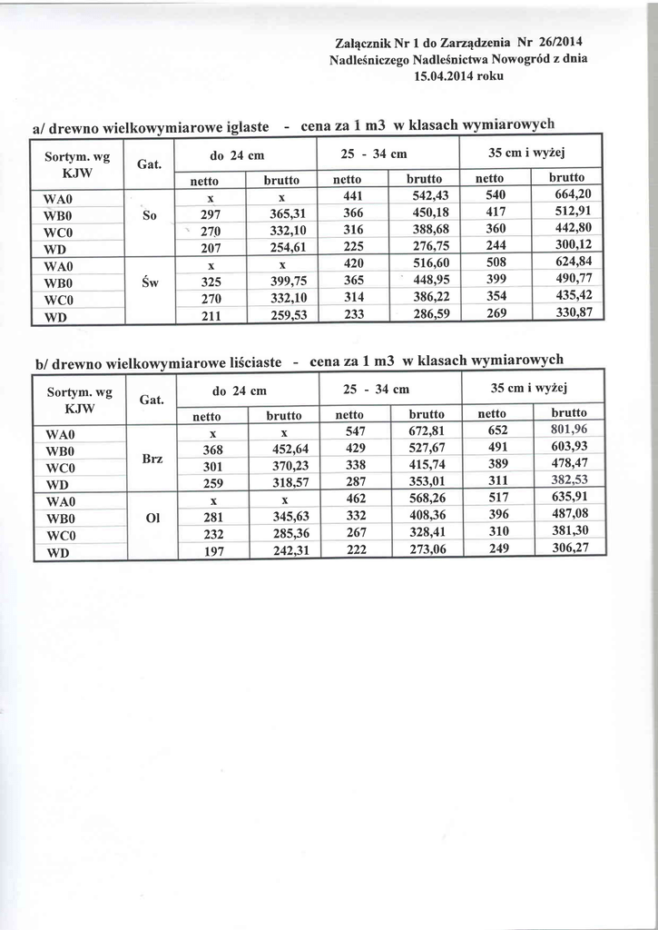 l do Zanqdzenia Nr 2612011 NadleSniczego Nadle5nictwa Nowogr6d z dnia 15.04.2014 roku ZalqcznikNr a/ drewno wielkowymiarowe Sortym. wg KJW wA0 wB0 Gat. WD 297 279 207 wA0 wB0 x 325 Sw wc0 brutto 270 2tl WD x 365,31 332,10 254,61 x KJW Gat. 35 cm i wyiej brutto netto 332,r0 259,53 - 540 664,,20 366 450,18 388,68 276.75 516,60 448,95 386,22 286,59 4t7 512,91 360 442,80 244 300.12 624,84 490,77 435,42 330,87 316 225 365 314 233 cena za 508 399 354 269 I m3 w klasach wYmiarowYch 35 cm i wy2ej netto brutto 547 672,81 452,64 429 527,67 netto 652 491 301 370,23 338 415,74 389 WD 259 287 353,01 311 wA0 wB0 x 281 318.57 x 345,63 285,36 242,31 462 332 267 568,26 408.36 328,41 273.06 517 wA0 wB0 wc0 Brz ol netto x 368 wc0 232 WD t97 brutto x brutto 542,43 25 - 34cm do 24 cm netto 441 420 399,75 b/ drewno wielkowymiarowe liSciaste Sortym. wg I ms w Ktasacn klasach wymrarowyc 25-34cm x wc0 cena zz do 24 cm netto So - iglaste ))) 396 310 249 bruffo 801,96 603,93 478,47 382.53 635,91 487.08 381.30 306,27 c / drewno Sredniowvmiarowe i malowvmiarowe glaste Sort. w/g KJW Rodz. gat. Jedn. miary Cena netto - m3 Cena brutto Uwagi 52a So m3 200 246,00 52a Sw m3 196 241,08 s2b So m3 273 335,79 s2b .Sw .m3 )<) 309,96 s3b igl m3 160 196,80 S3A+M1 igt m3 45 55,35 S4 igl m3 105 113,40 S4 igl m3 77 83,16 vAT 8% (PKN) M2 igl m3 30 32,40 Drobnica opalowa vAT 8% (PKN) ' d/ drewno Sredn vAT 23o (PKN) vAT 23oh (PKN) VAT 8% mla "owe i malowvmiarowe liSciaste - m3 Brz r90 233,70 r82 223,86 Db 190 233,70 os 167 205,41 Brz 2t2 260,76 267 328,41 ol 217 266,91 os 212 260,76 110 118,80 VAT 8% 100 108,00 VAT 8% ol m3 S2a Db s2b m3 liSciaste twarde m3 S4 liSciaste migkkie S4 Ii6ciaste m3 82 88,56 vAT 8% (PKN) M2 liSciaste m3 30 32,40 Drobnica opalowa VAT 8% (PKN) Sporz4dzil: ObjaSnienia: PKN - drewno pozyskane kosztem nabywcy. 54 - drewno opalowe. Normy i warunki techniczne dostgpne s4 w biurze NadleSnictwa.