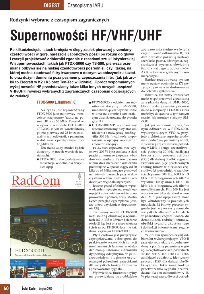 DIGEST Czasopisma IARU Rodzynki wybrane z czasopism zagranicznych Supernowości HF/VHF/UHF Po kilkudziesięciu latach brnięcia w ślepy zaułek pierwszej przemiany częstotliwości w górę, nareszcie Japończycy poszli po rozum do głowy i zaczęli projektować odbiorniki zgodnie z zasadami sztuki inżynierskiej. W supernowościach, takich jak FTDX-5000 czy TS-590, pierwsza przemiana odbywa się na niskiej częstotliwości pośredniej, czyli takiej, na której można zbudować filtry kwarcowe o dobrym współczynniku kształtu oraz dużym tłumieniu poza pasmem przepuszczania filtru (tak jak zrobił to Elecraft w K2 i K3 oraz Ten-Tec w Orionie). Oprócz wspomnianych wyżej nowości HF przedstawiamy także kilka innych nowych urządzeń VHF/UHF, również wybranych z zagranicznych czasopism docierających do redakcji. FTDX-5000 („RadCom” 6) Na rynek jest wprowadzany FTDX-5000 jako najnowszy transceiver stacjonarny Yaesu na pasma HF oraz 50 MHz. Powstał on w oparciu o modele FTDX-9000 i FT-2000, z tym że konstruktorzy po raz pierwszy od 25 lat zastosowali w nim odbiornik z przemianą w dół, wraz z przełączanymi roofing-filtrami. Ten najnowszy model będzie dostępny w trzech wersjach (zestawach): FTDX-5000 jako podstawowa radiostacja wspólna dla wszystkich opcji 60 Świat Radio Sierpień 2010 FTDX-5000D z oddzielnym mo- nitorem stacyjnym SM-5000, umożliwiającym wyświetlenie widma na ekranie i zawierającym dwa skierowane do przodu głośniki F T D X- 5 0 0 0 M P w y p o s a ż o n y w termostatowany oscylator odniesienia i najwęższy roofing-filtr 300 Hz (możliwość wyposażenia w opcyjny roofing-filtr i monitor stacyjny) FTDX-5000 zapewnia moc wyjściową 200 W i jest zasilany z sieci prądu zmiennego poprzez wbudowany zasilacz. Przewidziano w nim dwa niezależne odbiorniki przestrajane w sposób ciągły od 30 kHz do 60 MHz, mogące pracować na różnych pasmach przy wykorzystaniu oddzielnych anten i oddzielnych wyjść akustycznych. Jeszcze przed oficjalnym wprowadzeniem sprzętu na rynek europejski autor miał szczęście przeprowadzić z pomocą firmy Martin Lynch przegląd egzemplarza (jeszcze przed uzyskaniem dopuszczenia CE). Testowany model FTDX-5000 miał solidną obudowę o wymiarach 462 × 135 × 389 mm i ciężarze około 21 kg. Jest ona nieco większa i cięższa od FT-2000, lecz nie tak duża i ciężka jak FTDX-9000D. Płyta czołowa jest przejrzyście zaprojektowana, z dostępem do praktycznie wszystkich funkcji uruchamianych łatwymi w obsłudze manipulatorami. Odbiorniki dysponują odrębnymi, w pełni zrozumiałymi i logicznie usytuowanymi pokrętłami i przyciskami dla wszystkich funkcji filtrowania i przetwarzania sygnału. Wyświetlacz fluorescencyjny ma przewidziane trzy oddzielne zobrazowania (jedno wyświetla częstotliwość odbiornika B, zaś dwa pozostałe pokazują nastawy szerokości pasma, odstrojenia, częstotliwości wycięcia, obwiednię itp. dla każdego z odbiorników A i B, w formacie graficznym i numerycznym). Bardzo rozbudowany system menu nastaw obejmuje aż 176 pozycji, co pozwala na dostosowanie do potrzeb użytkownika. Również ten nowy transceiver może współpracować z jednostką zarządzania danymi DMU-2000, która została uprzednio opracowana do współpracy z FT-2000 i która może być dołączona w tym samym czasie, jak monitor stacyjny SM-5000. Jak już wspomniano, w głównym odbiorniku w FTDX-5000, wykorzystującym VFO-A, przyjęto architekturę superheterodyny z podwójną przemianą w dół, z pierwszą częstotliwością pośrednią 9 MHz i drugą częstotliwością pośrednią 30 kHz, zasilającą bezpośrednio procesor cyfrowy (DSP) dla dalszej obróbki sygnału. Przewidziano pięć przełączanych roofing-filtrów w pierwszej częstotliwości pośredniej, o szerokościach pasma 300 Hz, 600 Hz i 3 kHz dla 6-biegunowych filtrów wysokiej klasy oraz 6 kHz i 15 kHz dla 4-biegunowych filtrów monolitycznych. Filtr 300 Hz jest wbudowany jako standard w modelu MP i jako opcja ekstra może być wbudowany w pozostałych modelach. 32-bitowy procesor sygnału jest wykorzystywany do wszystkich filtrowań w kanałach w pośredniej częstotliwości, do demodulacji, redukcji szumów, obróbki sygnału akustycznego i do funkcji automatycznej regulacji wzmocnienia. W drugim (pomocniczym) odbiorniku wykorzystującym VFO-B przyjęto architekturę superheterodyny z potrójną przemianą w górę, o częstotliwościach pośrednich 40,455 MHz, 455 kHz i 30 kHz, zasilającej oddzielny, identyczny procesor DSP dla dalszej obróbki sygnału. Takie same funkcje przetwarzania sygnału przewidziano dla obu odbiorników A i B. W pierwszej częstotliwości pośred- niej przewidziano roofing-filtry 15 kHz, 6 kHz i 3 kHz, dodatkową selektywność zapewnia druga częstotliwość pośrednia. Nadajnik zawiera wzmacniacz mocy 200 W z możliwością redukcji mocy do około 10 W. Istnieje możliwość pracy w klasie A dla SSB o małych zniekształceniach przy maksymalnym poziomie mocy wyjściowej 75 W. Przy emisjach głosowych przewidziano VOX, procesor mowy i monitor nadawania, szerokość pasma nadawania może być regulowana w celu uzyskania bądź wysokiej jakości dźwięku, bądź – przy węższym paśmie – większej czytelności podczas pracy kontestowej. Przewidziano konfigurowany trzyzakresowy parametryczny equalizer mikrofonowy, pozwalający na przystosowanie wielu charakterystyk mikrofonów. Przy pracy CW istnieje zwykła możliwość pełnego lub częściowego break-in, jak też regulacji podsłuchu dla dokładnego zgrania z regulowaną na płycie czołowej wysokością tonu. Przewidziano cyfrową pamięć głosową, sterowaną z klawiatury FH-2, bardzo użyteczną w pracy kontestowej. Urządzenie ma wbudowany układ automatycznego dostrajania anteny (ATU), pracujący tylko przy nadawaniu na pasmach od 1,8 do 50 MHz i dopasowujący anteny o współczynniku fali stojącej (SWR) do 3:1 Jeśli chodzi o monitor stacyjny SM-5000, to