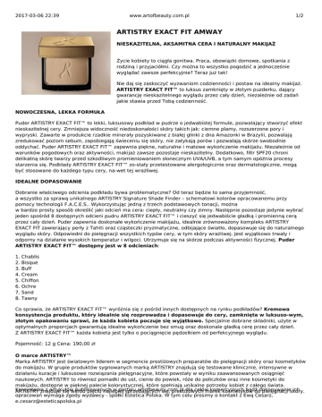 2017-03-06 22:39 www.artofbeauty.com.pl 1/2 ARTISTRY EXACT FIT AMWAY NIESKAZITELNA, AKSAMITNA CERA I NATURALNY MAKIJAŻ Życie kobiety to ciągła gonitwa. Praca, obowiązki domowe, spotkania z rodziną i przyjaciółmi. Czy można to wszystko pogodzić a jednocześnie wyglądać zawsze perfekcyjnie? Teraz już tak! Nie daj się zaskoczyć wyzwaniom codzienności i postaw na idealny makijaż. ARTISTRY EXACT FIT™ to luksus zamknięty w złotym puzderku, dający gwarancję nieskazitelnego wyglądu przez cały dzień, niezależnie od zadań jakie stawia przed Tobą codzienność. NOWOCZESNA, LEKKA FORMUŁA Puder ARTISTRY EXACT FIT™ to lekki, luksusowy podkład w pudrze o jedwabistej formule, pozwalający stworzyć efekt nieskazitelnej cery. Zmniejsza widoczność niedoskonałości skóry takich jak: ciemne plamy, rozszerzone pory i wypryski. Zawarte w produkcie rzadkie minerały pozyskiwane z białej glinki z dna Amazonki w Brazylii, pozwalają zredukować poziom sebum, zapobiegają świeceniu się skóry, nie zatykają porów i pozwalają skórze swobodnie oddychać. Puder ARTISTRY EXACT FIT™ zapewnia piękne, naturalne i matowe wykończenie makijażu. Niezależnie od warunków pogodowych oraz aktywności, makijaż zawsze pozostaje nieskazitelny. Dodatkowo, filtr SPF20 chroni delikatną skórę twarzy przed szkodliwym promieniowaniem słonecznym UVA/UVB, a tym samym opóźnia procesy starzenia się. Podkłady ARTISTRY EXACT FIT™ zo-stały przetestowane alergologicznie oraz dermatologicznie, mogą być stosowane do każdego typu cery, na-wet tej wrażliwej. IDEALNE DOPASOWANIE Dobranie właściwego odcienia podkładu bywa problematyczne? Od teraz będzie to sama przyjemność, a wszystko za sprawą unikalnego ARTISTRY Signature Shade Finder – schematowi kolorów opracowanemu przy pomocy technologii F.A.C.E.S.. Wykorzystując jedną z trzech podstawowych tonacji, można w bardzo prosty sposób określić jaki odcień ma cera: ciepły, neutralny czy zimny. Następnie pozostaje jedynie wybrać jeden spośród 8 dostępnych odcieni pudru ARTISTRY EXACT FIT™ i cieszyć się jedwabiście gładką i promienną cerą przez cały dzień. Puder zapewnia doskonałe wykończenie makijażu, idealnie zrównoważony kompleks ARTISTRY EXACT FIT zawierający perły z Tahiti oraz cząsteczki pryzmatyczne, odbijające światło, dopasowuje się do naturalnego wyglądu skóry. Odpowiedni do pielęgnacji wszystkich typów cery, w tym skóry wrażliwej. Jest wyjątkowo trwały i odporny na działanie wysokich temperatur i wilgoci. Utrzymuje się na skórze podczas aktywności fizycznej. Puder ARTISTRY EXACT FIT™ dostępny jest w 8 odcieniach: 1. 2. 3. 4. 5. 6. 7. 8. Chablis Bisque Buff Cream Chiffon Ochre Sand Tawny Co sprawia, że ARTISTRY EXACT FIT™ wyróżnia się z pośród innych dostępnych na rynku podkładów? Kremowa konsystencja produktu, który idealnie się rozprowadza i dopasowuje do cery, zamknięta w luksuso-wym, złotym opakowaniu sprawi, że każda kobieta poczuje się wyjątkowo. Specjalnie dobrane składniki, użyte w optymalnych proporcjach gwarantują idealne wykończenie bez smug oraz doskonale gładką cerę przez cały dzień. Z ARTISTRY EXACT FIT™ każda kobieta jest tylko o pociągnięcie pędzelkiem od perfekcyjnego wyglądu. Pojemność: 12 g Cena: 190,00 zł O marce ARTISTRY™ Marka ARTISTRY jest światowym liderem w segmencie prestiżowych preparatów do pielęgnacji skóry oraz kosmetyków do makijażu. W grupie produktów sygnowanych marką ARTISTRY znajdują się testowane klinicznie, intensywne w działaniu kuracje i luksusowe rozwiązania pielęgnacyjne, które powstały w wyniku zaawansowanych osiągnięć naukowych. ARTISTRY to również pomadki do ust, cienie do powiek, róże do policzków oraz inne kosmetyki do makijażu, dostępne w pięknej palecie kolorystycznej, które spełniają unikalne potrzeby kobiet z całego świata. Korzystanie z artykułów publikowanych w portalu artofbeauty.com.pl dla celów komercyjnych bądź ich ARTISTRY znajduje się wśród pięciu najlepiej sprzedających się, prestiżowych marek kosmetyków dodokonywanie pielęgnacji skóry. opracowań wymaga zgody wydawcy - spółki Estetica Polska. W tym celu prosimy o kontakt z Ewą Cesarz, [email protected] 2017-03-06 22:39 www.artofbeauty.com.pl 2/2 Produkty ARTISTRY sprzedawane są poprzez sieć ponad trzech milionów dystrybutorów na całym świecie. O firmie Amway Amway (www.amway.com) jest jedną z największych w świecie firm działających w sektorze sprzedaży bezpośredniej, która według informacji podanej przez Direct Selling News, Global 100, w 2013 roku wygenerowała sprzedaż na poziomie 11,8 miliarda dolarów amerykańskich. Firma została założona w 1959 roku w Ada w stanie Michigan (Stany Zjednoczone). Amway oferuje produkty konsumenckie i możliwości biznesowe poprzez sieć ponad 3 milionów dystrybutorów pracujących w ponad 100 państwach i terytoriach na całym świecie. Najlepiej sprzedające się marki Amway to: NUTRILITE™ (preparaty witaminowe i mineralne - suplementy diety), ARTISTRY™ (produkty pielęgnacyjne oraz kosmetyki do makijażu) oraz eSpring™ (system oczyszczania wody). www.amway.pl Korzystanie z artykułów publikowanych w portalu artofbeauty.com.pl dla celów komercyjnych bądź dokonywanie ich opracowań wymaga zgody wydawcy - spółki Estetica Polska. W tym celu prosimy o kontakt z Ewą Cesarz, [email protected]