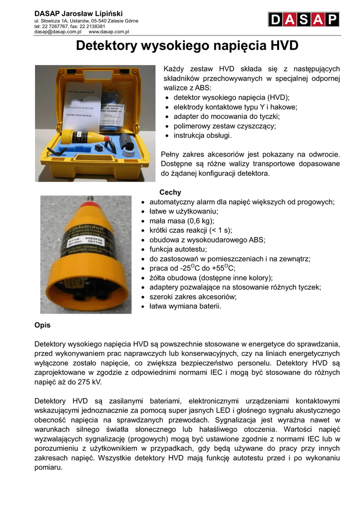 DASAP Jarosław Lipiński ul. Słowicza 1A, Ustanów, 05-540 Zalesie Górne tel: 22 7267767, fax: 22 2138381 [email protected] www.dasap.com.pl Detektory wysokiego napięcia HVD Każdy zestaw HVD składa się z następujących składników przechowywanych w specjalnej odpornej walizce z ABS: detektor wysokiego napięcia (HVD); elektrody kontaktowe typu Y i hakowe; adapter do mocowania do tyczki; polimerowy zestaw czyszczący; instrukcja obsługi. Pełny zakres akcesoriów jest pokazany na odwrocie. Dostępne są różne walizy transportowe dopasowane do żądanej konfiguracji detektora. Cechy automatyczny alarm dla napięć większych od progowych; łatwe w użytkowaniu; mała masa (0,6 kg); krótki czas reakcji (< 1 s); obudowa z wysokoudarowego ABS; funkcja autotestu; do zastosowań w pomieszczeniach i na zewnątrz; praca od -25OC do +55OC; żółta obudowa (dostępne inne kolory); adaptery pozwalające na stosowanie różnych tyczek; szeroki zakres akcesoriów; łatwa wymiana baterii. Opis Detektory wysokiego napięcia HVD są powszechnie stosowane w energetyce do sprawdzania, przed wykonywaniem prac naprawczych lub konserwacyjnych, czy na liniach energetycznych wyłączone zostało napięcie, co zwiększa bezpieczeństwo personelu. Detektory HVD są zaprojektowane w zgodzie z odpowiednimi normami IEC i mogą być stosowane do różnych napięć aż do 275 kV. Detektory HVD są zasilanymi bateriami, elektronicznymi urządzeniami kontaktowymi wskazującymi jednoznacznie za pomocą super jasnych LED i głośnego sygnału akustycznego obecność napięcia na sprawdzanych przewodach. Sygnalizacja jest wyraźna nawet w warunkach silnego światła słonecznego lub hałaśliwego otoczenia. Wartości napięć wyzwalających sygnalizację (progowych) mogą być ustawione zgodnie z normami IEC lub w porozumieniu z użytkownikiem w przypadkach, gdy będą używane do pracy przy innych zakresach napięć. Wszystkie detektory HVD mają funkcję autotestu przed i po wykonaniu pomiaru. Wskaźniki LED Testowanie linii napowietrznej Detektory wysokiego napięcia (HVD’s) Wskazanie braku napięcia – zielona LED mruga 2 Hz Obecność napięcia (alarm) – czerwona LED mruga 2 Hz i sygnał dźwiękowy 3,1 kHz, modulowany, -70 dBA dla 1,5 m. Czas reakcji: <1s Zasilanie: bateria 6LF22 9 V Adaptery do tyczek Adaptery umożliwiające montowanie do różnych drążków pomiarowych (od lewej: Bowthorpe, KP (Karl Pfisterer) i Universal Starwheel). Elektrody kontaktowe Z urządzeniem mogą być dostarczone trzy rozmiary aluminiowych haków 40, 60 i 100 mm lub zamiennie stalowa elektroda prosta 40 mm lub elektroda typu Y. Przedłużacze elektrod kontaktowych Przedłużacze o długości 100, 250, 650 i 1000 mm służące do odsunięcia detektora od źródła zakłóceń. Jednostka probiercza Dodatkowo, oprócz funkcji Autotest, dostępna jest zasilana bateryjnie jednostka probiercza umożliwiająca sprawdzenie całego skompletowanego zestawu. Napięcie wyjściowe: 1100 VP-P ± 100 V na obciążeniu 20 MΩ High Voltage Instruments Ltd. ciągle ulepsza swoje Produkty dlatego podane dane techniczne mogą ulec zmianie bez wcześniejszego powiadomienia. Dystrybucja: DASAP Jarosław Lipiński ul. Słowicza 1A, Ustanów, 05-540 Zalesie Górne tel: 22 7267767, fax: 22 2138381 [email protected] www.dasap.com.pl