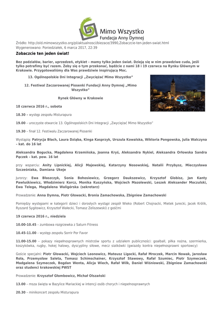 Źródło: http://old.mimowszystko.org/pl/aktualnosci/biezace/3990,Zobaczcie-ten-jeden-swiat.html Wygenerowano: Poniedziałek, 6 marca 2017, 22:39 Zobaczcie ten jeden świat! Bez podziałów, barier, uprzedzeń, etykiet – mamy tylko jeden świat. Dzieją się w nim prawdziwe cuda, jeśli tylko potrafimy być razem. Żeby się o tym przekonać, bądźcie z nami 18 i 19 czerwca na Rynku Głównym w Krakowie. Przygotowaliśmy dla Was prawdziwie inspirującą Moc. 13. Ogólnopolskie Dni Integracji „Zwyciężać Mimo Wszystko” 12. Festiwal Zaczarowanej Piosenki Fundacji Anny Dymnej „Mimo Wszystko” Rynek Główny w Krakowie 18 czerwca 2016 r., sobota 18.30 – występ zespołu Misturapura 19.00 – uroczyste otwarcie 13. Ogólnopolskich Dni Integracji „Zwyciężać Mimo Wszystko” 19.30 – finał 12. Festiwalu Zaczarowanej Piosenki Wystąpią: Patrycja Błach, Laura Dziąba, Kinga Kasprzyk, Urszula Kowalska, Wiktoria Pongowska, Julia Walczyna – kat. do 16 lat Aleksandra Bogucka, Magdalena Krzemińska, Joanna Kryś, Aleksandra Nykiel, Aleksandra Orłowska Sandra Pączek – kat. pow. 16 lat przy wsparciu: Anity Lipnickiej, Alicji Majewskiej, Katarzyny Nosowskiej, Natalii Przybysz, Mieczysława Szcześniaka, Damiana Ukeje Jurorzy: Ewa Błaszczyk, Sonia Bohosiewicz, Grzegorz Daukszewicz, Krzysztof Globisz, Jan Kanty Pawluśkiewicz, Włodzimierz Korcz, Monika Kuszyńska, Wojciech Mazolewski, Leszek Aleksander Moczulski, Ewa Telega, Magdalena Waligórska (sekretarz) Prowadzenie: Anna Dymna, Piotr Głowacki, Bronia Zamachowska, Zbigniew Zamachowski Pomiędzy występami w kategorii dzieci i dorosłych wystąpi zespół Wieko (Robert Chojnacki, Mietek Jurecki, Jacek Królik, Ryszard Sygitowicz, Krzysztof Wałecki, Tomasz Zeliszewski) z gośćmi 19 czerwca 2016 r., niedziela 10.00-10.45 – zumbowa rozgrzewka z Saturn Fitness 10.45-11.00 – występ zespołu Sorrir Por Favor 11.00-15.00 – pokazy niepełnosprawnych mistrzów sportu z udziałem publiczności: goalball, piłka nożna, szermierka, koszykówka, rugby, hokej halowy, dyscypliny siłowe, mecz siatkówki (gwiazdy kontra niepełnosprawni sportowcy) Goście specjalni: Piotr Głowacki, Wojciech Leonowicz, Mateusz Ligocki, Rafał Mroczek, Marcin Nowak, Jarosław Rola, Przemysław Saleta, Tomasz Schimschainer, Krzysztof Stawowy, Rafał Szumiec, Piotr Szymeczek, Madgalena Szymeczek, Bogdan Wenta, Alicja Wiech, Rafał Wilk, Daniel Wiśniowski, Zbigniew Zamachowski oraz studenci krakowskiej PWST Prowadzenie: Krzysztof Głombowicz, Michał Olszański 13.00 – msza święta w Bazylice Mariackiej w intencji osób chorych i niepełnosprawnych 20.30 – minikoncert zespołu Misturapura 21.00 – koncert „Jeden świat” Wystąpią laureaci Festiwalu Zaczarowanej Piosenki oraz: Monika Kuszyńska, Mieczysław Szcześniak, Andrzej Piaseczny, Halina Mlynkova, Katarzyna Cerekwicka Goście specjalni: Krzysztof Globisz, Agnieszka Jankowska z małżonkiem, Anna Krupa, Janusz Świtaj oraz podopieczni ośrodka terapeutyczno-rehabilitacyjnego „Dolina Słońca” w Radwanowicach i Warsztatów Terapii Zajęciowej w Lubiatowie Prowadzenie: Anna Dymna, Piotr Polk 18-19 czerwca, Planty przy Bunkrze Sztuki, 10.00-20.00 „Galeria pod Gołym Niebem” – zbiórka publiczna prowadzona przez wolontariuszy Tweet