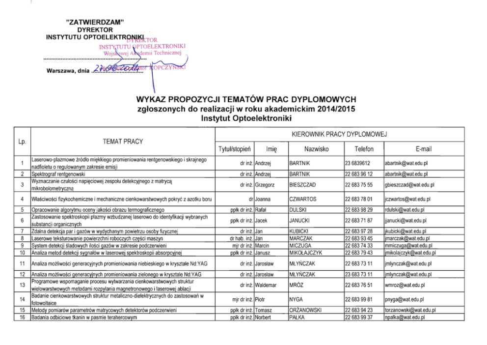 "ZATWIERDZAM" DYREKTOR INSTYTUTU OPTOELEKTR~ TOR INSTY.TUTU PTOELEKTRONIKI WOJs ' wej A demii Technicznej 2 " 0 Warszawa, dnia ................................ . WYKAZ PROPOZYCJI TEMATOW PRAC DYPLOMOWYCH zgloszonych do realizacji w roku akademickim 2014/2015 Instytut Optoelektroniki KIEROWf\lIK PRACY DYPLOMOWEJ Lp. TEMAT PRACY Imi~ T ytuVstopieri 1 2 3 Laserowo-plazmowe zr6dlo mi~kkiego promieniowania rentgenowskiego i skrajnego nadfioletu 0 reQulowanym zakresie emisii Spektrograf rentgenowski Wyznaczanie czulosci napi~ciowej zespolu detekcyjnego z matrycq mikrobolometrycznq Nazwisko Telefon E-mail dr inz. Andrzej BARTNIK 236839612 [email protected] dr inz. Andrzej BARTNIK 226839612 [email protected] dr inz. Grzegorz BIESZCZAD 226837555 [email protected],pl CZWARTOS 226837801 [email protected] pplk dr inz. Rafal DULSKI 226839829 [email protected] pplk dr inz. Jacek JANUCKI 226837187 [email protected] dr inz. dr hab. inz. mjr dr inz. pplk dr inz. KUBICKI MARCZAK MICZUGA MIKOlAJCZYK 226839728 226839345 226837433 226837943 '[email protected] [email protected] [email protected] ·[email protected] 4 Wlasciwosci fizykochemiczne i mechaniczne cienkowarstwowych pokryc z azotku boru 5 7 8 9 10 Opracowanie alQorytmu oceny jakosci obrazu termoQraficzneQo Zastosowanie spektroskopii plazmy wzbudzanej laserowo do identyfikacji wybranych substancii orQanicznych Zdalna detekcja par i gaz6w w wydychanym powietrzu osoby fizycznej Laserowe teksturowanie powierzchni roboczych cz~sci maszyn System detekcji sladowych ilosci gaz6w w zakresie podczerwieni Analiza metod detekcii sYQnal6w w laserowej spektroskopii absorpcyjnej 11 Analiza mozliwosci generacyjnych promieniowania niebieskiego w krysztale Nd:YAG dr inz. Jaroslaw MlYNCZAK 226837311 [email protected] 12 Analiza mozliwosci Qeneracyjnych promieniowania zieloneQo w krysztale Nd:YAG Programowe wspomaganie procesu wytwarzania cienkowarstwowych struktur wielowarstwowych metodami rozpylania magnetronowego i laserowej ablacji Badanie cienkowarstwowych struktur metaliczno-dielektrycznych do zastosowari w fotowoltaice Metody pomiar6w parametr6w matrycowych detektor6w podczerwieni Badania odbiciowe tkanin w pasmie terahercowym dr inz. Jaroslaw MlYNCZAK 236837311 ·[email protected] dr inz. Waldemar MROZ 226837651 [email protected] NYGA 226839981 [email protected] ORlANOWSKI PALKA 226839423 226839937 [email protected] [email protected] 6 13 14 15 16 dr Joanna Jan Jan Marcin Janusz mjr dr inz. Piotr pplk dr inz. Tomasz pplk dr inz. Norbert 17 Analiza metod detekcji synchronicznej promieniowania podczerwonego zmodulowanego mechanicznie dr inz. Tadeusz PIATKOWSKI 226839876 [email protected] .pl 18 Analiza pracy spektrofotometru podczerwieni z uzyciem strefowych filtr6w spektralnych dr inz. Tadeusz PIATKOWSKI 226839876 [email protected] 19 Op!ymalizacia filtracii spektralnei w kamerach i pirometrach podczerwieni Zastosowanie systemu wizyjnego do analiz i statystyk w grach zespotowych Ujawnianie ukrytych emocji "mikroekspresji" przy uzyciu technik wizyjnych Zastosowanie znacznik6w graficznych do pozycjonowania obiekt6w w ~zestrzeni Technika rozszerzonej rzeczywistosci w wizyjnym systemie informacyjrlym Smartkamera w systemie widzenia maszynowego Wyznaczanie wplywu promieniowania tla na wyniki pomiar6w temperatury kamerami termowizYinymi Badanie i modelowania dynamiki generacji w laserze z wirujqcym zwierciadlem Uklady zasilania kwantowych laser6w kaskadowych stosowanych w spektroskopii Wytwarzanie za pomocq wiqzki jonowej i zastosowanie transmisyjnej siatki dyfrakcyjnej na potrzeby speklroskopii w zakresie skrajnego nadfioletu EUV i mifi!kkiego Ipromieniowania rentgenowskiego SXR dr inz. Tadeusz PIATKOWSKI 226839876 [email protected] pplk dr inz. Marek PISZCZEK 216839630 [email protected] pplk dr inz. Marek pplk dr inz. Marek pplk dr inz. Marek pp/k dr inz. Marek PISZCZEK PISZCZEK PISZCZEK PISZCZEK 226839630 236839630 246839630 256839630 [email protected] [email protected] [email protected] [email protected] POLAKOWSKI 226837676 [email protected] SK6RCZAKOWSKI SZABRA 226837558 226837677 [email protected] [email protected] WACHULAK 226839540 [email protected] WOJTAS 226837943 [email protected] .pl dr inz. Przemyslaw ZAGRAJEK 226837459 [email protected] dr inz. Przemyslaw ZAG RAJ EK 236837459 pzag [email protected] .pl ZYGMUNT 226839205 [email protected] ZAJAC 226837398 [email protected] .pl ZENDZIAN 226837153 [email protected] .pl 20 21 22 23 24 25 26 27 28 29 30 31 32 33 34 Analiza mozliwosci zastosowania mini-spektrometru do r6znicowej optycznej spektroskopii absorpcyjnej opracowanie procedury pomiarowej oraz projekt ukladu Analiza czasowo-czfi!slotliwosciowa sygnal6w szumowych detektor6w terahercowych na bazie tranzystor6w FET Badanie detektor6 promieniowania terahercowego Analiza wplywu parametr6w detektora APD na jakosc toru odbiorczego ukladu teledetekcyjnego Analiza numeryczna wybranych przypadk6w koagulacji tkanek w zakresie widmowym VIS-IR Analiza i badania lasera z osrodkiem aktywnym typu slab pompowanego poprzecznie matrycq diod laserowych dr inz. Henryk dr inz. Marek mjr dr inz. Dariusz mjr dr hab. inz. Przemyslaw mjr dr inz. Jacek plk dr inz. Marek prof. dr hab. inz. Andrzej dr hab. inz. Waldemar