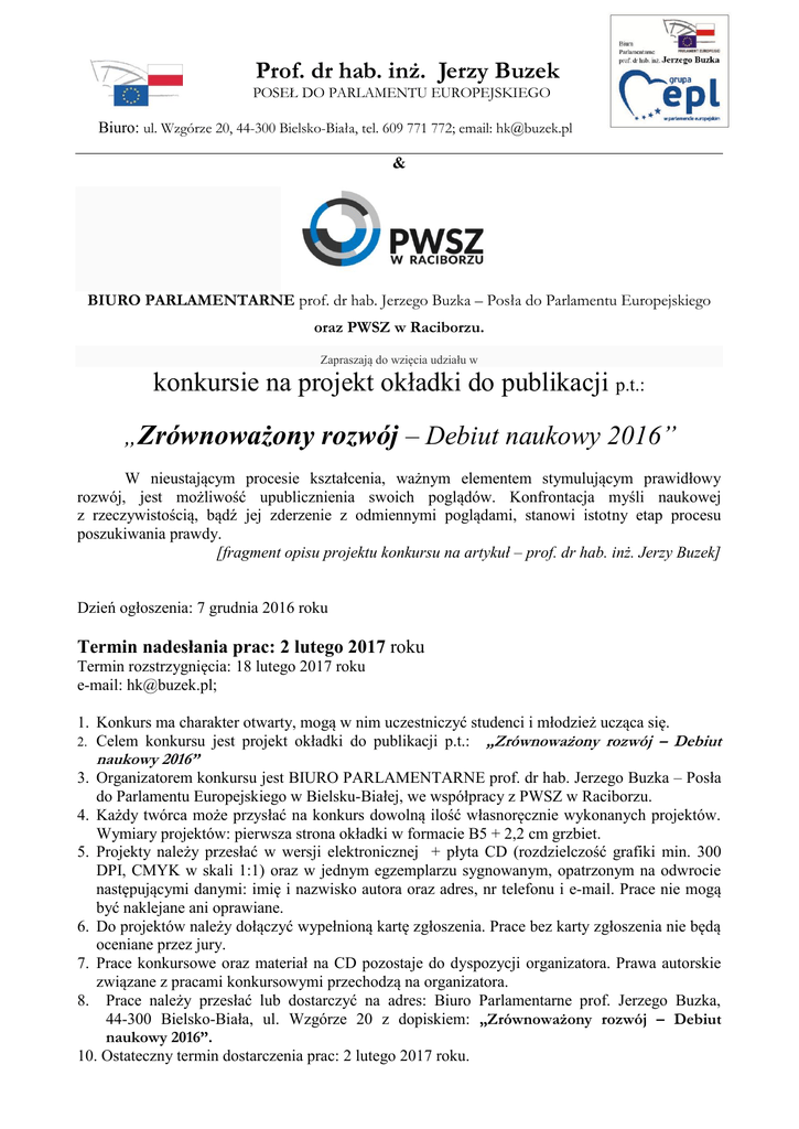 Prof. dr hab. inż. Jerzy Buzek POSEŁ DO PARLAMENTU EUROPEJSKIEGO Biuro: ul. Wzgórze 20, 44-300 Bielsko-Biała, tel. 609 771 772; email: [email protected] & BIURO PARLAMENTARNE prof. dr hab. Jerzego Buzka – Posła do Parlamentu Europejskiego oraz PWSZ w Raciborzu. Zapraszają do wzięcia udziału w konkursie na projekt okładki do publikacji p.t.: „Zrównoważony rozwój – Debiut naukowy 2016” W nieustającym procesie kształcenia, ważnym elementem stymulującym prawidłowy rozwój, jest możliwość upublicznienia swoich poglądów. Konfrontacja myśli naukowej z rzeczywistością, bądź jej zderzenie z odmiennymi poglądami, stanowi istotny etap procesu poszukiwania prawdy. [fragment opisu projektu konkursu na artykuł – prof. dr hab. inż. Jerzy Buzek] Dzień ogłoszenia: 7 grudnia 2016 roku Termin nadesłania prac: 2 lutego 2017 roku Termin rozstrzygnięcia: 18 lutego 2017 roku e-mail: [email protected]; 1. Konkurs ma charakter otwarty, mogą w nim uczestniczyć studenci i młodzież ucząca się. 2. Celem konkursu jest projekt okładki do publikacji p.t.: „Zrównoważony rozwój – Debiut naukowy 2016” 3. Organizatorem konkursu jest BIURO PARLAMENTARNE prof. dr hab. Jerzego Buzka – Posła do Parlamentu Europejskiego w Bielsku-Białej, we współpracy z PWSZ w Raciborzu. 4. Każdy twórca może przysłać na konkurs dowolną ilość własnoręcznie wykonanych projektów. Wymiary projektów: pierwsza strona okładki w formacie B5 + 2,2 cm grzbiet. 5. Projekty należy przesłać w wersji elektronicznej + płyta CD (rozdzielczość grafiki min. 300 DPI, CMYK w skali 1:1) oraz w jednym egzemplarzu sygnowanym, opatrzonym na odwrocie następującymi danymi: imię i nazwisko autora oraz adres, nr telefonu i e-mail. Prace nie mogą być naklejane ani oprawiane. 6. Do projektów należy dołączyć wypełnioną kartę zgłoszenia. Prace bez karty zgłoszenia nie będą oceniane przez jury. 7. Prace konkursowe oraz materiał na CD pozostaje do dyspozycji organizatora. Prawa autorskie związane z pracami konkursowymi przechodzą na organizatora. 8. Prace należy przesłać lub dostarczyć na adres: Biuro Parlamentarne prof. Jerzego Buzka, 44-300 Bielsko-Biała, ul. Wzgórze 20 z dopiskiem: „Zrównoważony rozwój – Debiut naukowy 2016”. 10. Ostateczny termin dostarczenia prac: 2 lutego 2017 roku. 11. Zebranie jury nastąpi do 18.02.2017 r. Oceny prac i podziału nagród dokona jury powołane przez organizatora. 12. Ustanawia się następującą regulaminową nagrodę: I miejsce – kilkudniowy wyjazd do Parlamentu Europejskiego na zaproszenie prof. Jerzego Buzka. 13. Werdykt jury jest ostateczny. 14. Wyniki konkursu zostaną ogłoszone 18 lutego 2017 roku na stronie internetowej www.buzek.pl, oraz na stronie PWSZ w Raciborzu, wraz z reprodukcjami nagrodzonych prac. Zwycięzcy zostaną powiadomieni drogą e-mailową lub pocztą. 15. Projekty zakwalifikowane przez jury będą wyeksponowane na wystawie pokonkursowej. (Wernisaż oraz ekspozycję wystawy organizuje PWSZ w Raciborzu). 16. Organizatorzy nie ponoszą odpowiedzialności za zaginięcie lub uszkodzenie prac podczas przesyłki. 17. Uczestnictwo w niniejszym konkursie jest równoznaczne z akceptacją przez autorów wszystkich postanowień tego regulaminu. 19. Zespół Organizacyjny: dr Henryk A. Kretek – (Biuro Posła do PE prof. Jerzego Buzka; ) tel. (+48) 609 771 772; [email protected], dr hab. inż. architekt Ewa Stachura, prof. PWSZ w Raciborzu. Karta zgłoszenia: Tytuł pracy: Imię i nazwisko: data urodzenia: Adres zamieszkania: Nazwa uczelni lub szkoły, rok studiów, kierunek, itp. Telefon kom.: Adres E-mail: Notka biograficzna o autorze. [do 500 znaków] Potwierdzenie uczestnictwa w konkursie oraz oświadczenie opatrzone własnoręcznym podpisem: Oświadczam, że jestem autorem zgłoszonej pracy. …………………………………………………………………………………. Własnoręczny – czytelny podpis Kartę zgłoszenia w wersji WORD, będzie można pobrać ze strony www.buzek.pl z zakładki: „Debiut Naukowy 2016 – Zrównoważony rozwój”
