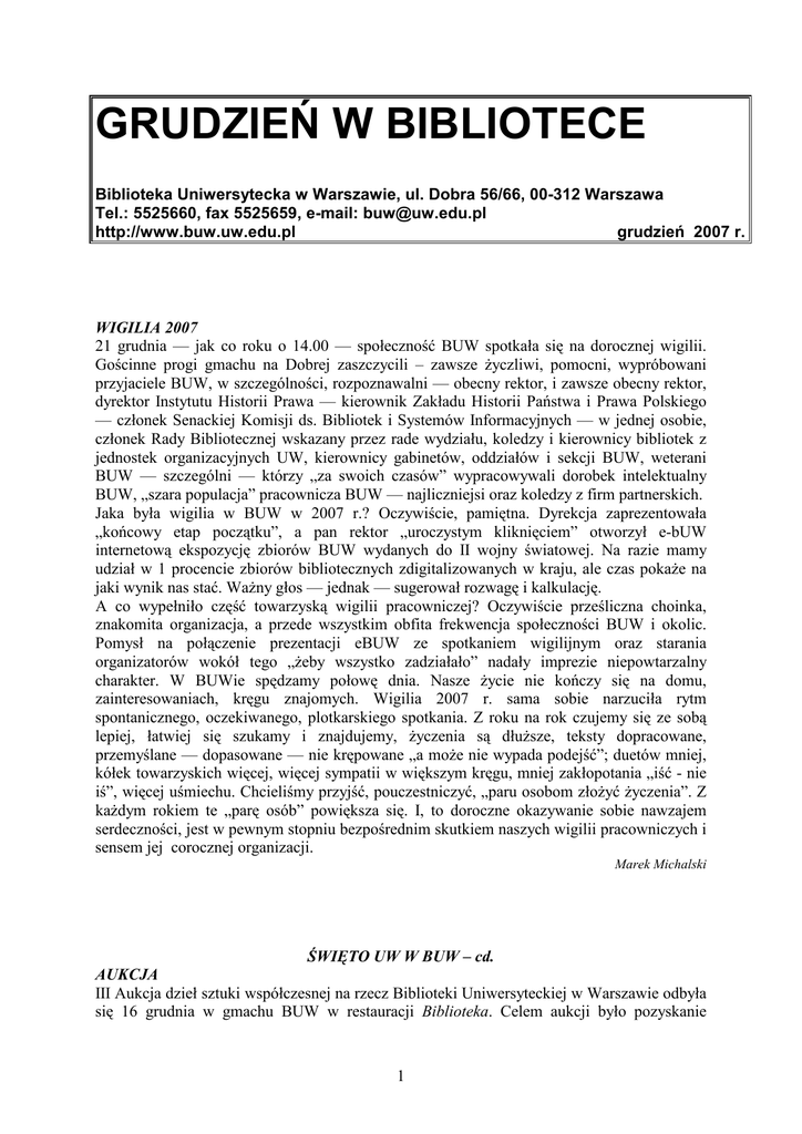 GRUDZIEŃ W BIBLIOTECE Biblioteka Uniwersytecka w Warszawie, ul. Dobra 56/66, 00-312 Warszawa Tel.: 5525660, fax 5525659, e-mail: [email protected] http://www.buw.uw.edu.pl grudzień 2007 r. WIGILIA 2007 21 grudnia — jak co roku o 14.00 — społeczność BUW spotkała się na dorocznej wigilii. Gościnne progi gmachu na Dobrej zaszczycili – zawsze Ŝyczliwi, pomocni, wypróbowani przyjaciele BUW, w szczególności, rozpoznawalni — obecny rektor, i zawsze obecny rektor, dyrektor Instytutu Historii Prawa — kierownik Zakładu Historii Państwa i Prawa Polskiego — członek Senackiej Komisji ds. Bibliotek i Systemów Informacyjnych — w jednej osobie, członek Rady Bibliotecznej wskazany przez rade wydziału, koledzy i kierownicy bibliotek z jednostek organizacyjnych UW, kierownicy gabinetów, oddziałów i sekcji BUW, weterani BUW — szczególni — którzy „za swoich czasów” wypracowywali dorobek intelektualny BUW, „szara populacja” pracownicza BUW — najliczniejsi oraz koledzy z firm partnerskich. Jaka była wigilia w BUW w 2007 r.? Oczywiście, pamiętna. Dyrekcja zaprezentowała „końcowy etap początku”, a pan rektor „uroczystym kliknięciem” otworzył e-bUW internetową ekspozycję zbiorów BUW wydanych do II wojny światowej. Na razie mamy udział w 1 procencie zbiorów bibliotecznych zdigitalizowanych w kraju, ale czas pokaŜe na jaki wynik nas stać. WaŜny głos — jednak — sugerował rozwagę i kalkulację. A co wypełniło część towarzyską wigilii pracowniczej? Oczywiście prześliczna choinka, znakomita organizacja, a przede wszystkim obfita frekwencja społeczności BUW i okolic. Pomysł na połączenie prezentacji eBUW ze spotkaniem wigilijnym oraz starania organizatorów wokół tego „Ŝeby wszystko zadziałało” nadały imprezie niepowtarzalny charakter. W BUWie spędzamy połowę dnia. Nasze Ŝycie nie kończy się na domu, zainteresowaniach, kręgu znajomych. Wigilia 2007 r. sama sobie narzuciła rytm spontanicznego, oczekiwanego, plotkarskiego spotkania. Z roku na rok czujemy się ze sobą lepiej, łatwiej się szukamy i znajdujemy, Ŝyczenia są dłuŜsze, teksty dopracowane, przemyślane — dopasowane — nie krępowane „a moŜe nie wypada podejść”; duetów mniej, kółek towarzyskich więcej, więcej sympatii w większym kręgu, mniej zakłopotania „iść - nie iś”, więcej uśmiechu. Chcieliśmy przyjść, pouczestniczyć, „paru osobom złoŜyć Ŝyczenia”. Z kaŜdym rokiem te „parę osób” powiększa się. I, to doroczne okazywanie sobie nawzajem serdeczności, jest w pewnym stopniu bezpośrednim skutkiem naszych wigilii pracowniczych i sensem jej corocznej organizacji. Marek Michalski ŚWIĘTO UW W BUW – cd. AUKCJA III Aukcja dzieł sztuki współczesnej na rzecz Biblioteki Uniwersyteckiej w Warszawie odbyła się 16 grudnia w gmachu BUW w restauracji Biblioteka. Celem aukcji było pozyskanie 1 dodatkowych środków na konserwację zabytkowych obiektów ze zbiorów specjalnych Biblioteki. Na aukcji wystawiono 55 prac przekazanych bezpłatnie przez 38 artystów. Wśród artystów, którzy kolejny raz przekazali swoje prace byli m.in. Edward Dwurnik, Beata Murawska, prof. Janusz Stanny, Katarzyna Stanny, Rafał Olbiński, Agnieszka Skopińska. Dominowały głównie róŜnego rodzaju grafiki, były równieŜ prace olejne oraz fotografie. W aukcji, którą poprowadził Marek Pietkiewicz z galerii Art&Design, wzięło udział ok.100 osób, w tym 40 licytujących. W sumie udało się uzyskać 31 600 zł. Prawie wszystkie dzieła zostały sprzedane. Praca przekazana przez Wojciecha Fangora (za pośrednictwem galerii aTAK) pt. 4 fale uzyskała najwyŜszą cenę (3 800 zł,). Natomiast trzy plakaty (z serii plakatów operowych) Rafała Olbińskiego sprzedano za łączną kwotę 1700 zł,. Ze środków (20 tys. zł) uzyskanych z II aukcji, która odbyła się w 2005 r. udało się odrestaurować 6 obiektów ze zbiorów specjalnych, w tym dwa dokumenty rękopiśmienne na pergaminie z XIV i XV w., trzy mapy z XIX w. oraz księgę Dziennik z podróŜy do Turcji Edwarda Raczyńskiego (XIX w.), którą zaprezentowano na wystawie towarzyszącej III aukcji. Beata Feliszewska *** RADA BIBLIOTECZNA... ... zebrała się na posiedzeniu w dniu 7 grudnia. Rada zaakceptowała kandydaturę dr Jolanty Talbierskiej na stanowisko kierownika Gabinetu Rycin. W kolejnej części posiedzenia podkomisja Rady powołana do sprawy przeprowadzenia badania systemu bibliotecznoinformacyjnego UW przedstawiła efekty swoich prac — ankiety w wersji dla BUW, bibliotek wydziałowych i dla bibliotekarzy UW. Procedura zbierania danych oraz sam kształt ankiety będą przedmiotem dalszych prac. Anna Wołodko SENACKA KOMISJA DS. BIBLIOTEK I SYSTEMÓW INFORMACYJNYCH UW... .... zebrała się na posiedzeniu w dniu 17 grudnia. Wysłuchała informacji dyr. Krystyny Kocznorowskiej, Agnieszki Wróbel i Tomasza Trynkowskiego na temat e-bUW oraz informacji Przewodniczącego Komisji na temat prac nad portalem wewnętrznym UW. aw KONFERENCJE, SEMINARIA, WARSZTATY W dniach 6-7 grudnia odbyła się we Wrocławiu międzynarodowa konferencja zorganizowana przez Instytut Informacji Naukowej i Bibliotekoznawstwa Uniwersytetu Wrocławskiego Świat w obrazach: zbiory graficzne w instytucjach kultury; ich typologia, organizacja i funkcje. Kierownikiem naukowym projektu była dr hab. prof. UWr. Małgorzata Komza. W sesji uczestniczyły z referatami dwie osoby z Gabinetu Rycin BUW: dr Jolanta Talbierska (Zbiory artystyczne, zbiory specjalne czy zbiory ikonograficzne? Typologia i funkcje) i mgr Małgorzata Biłozór-Salwa (Gabinet Rycin Biblioteki Uniwersyteckiej w Warszawie – zbiór artystyczny w bibliotece naukowej). Była to pierwsza w Polsce konferencja poświęcona wyłącznie zbiorom graficznym. Wzięli w niej udział historycy sztuki (w większości), bibliotekarze, historycy kultury, filolodzy i in. przedstawiciele uniwersyteckich środowisk naukowych, bibliote