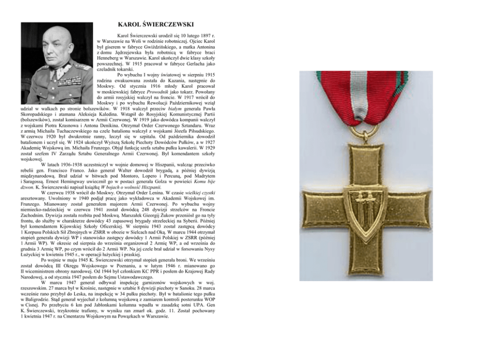 KAROL ŚWIERCZEWSKI Karol Świerczewski urodził się 10 lutego 1897 r. w Warszawie na Woli w rodzinie robotniczej. Ojciec Karol był giserem w fabryce Gwiździńskiego, a matka Antonina z domu Jędrzejewska była robotnicą w fabryce braci Henneberg w Warszawie. Karol ukończył dwie klasy szkoły powszechnej. W 1915 pracował w fabryce Gerlacha jako czeladnik tokarski. Po wybuchu I wojny światowej w sierpniu 1915 rodzina ewakuowana została do Kazania, następnie do Moskwy. Od stycznia 1916 młody Karol pracował w moskiewskiej fabryce Prowodnik jako tokarz. Powołany do armii rosyjskiej walczył na froncie. W 1917 wrócił do Moskwy i po wybuchu Rewolucji Październikowej wziął udział w walkach po stronie bolszewików. W 1918 walczył przeciw białym generała Pawła Skoropadskiego i atamana Aleksieja Kaledina. Wstąpił do Rosyjskiej Komunistycznej Partii (bolszewików), został komisarzem w Armii Czerwonej. W 1919 jako dowódca kompanii walczył z wojskami Piotra Krasnowa i Antona Denikina. Otrzymał Order Czerwonego Sztandaru. Wraz z armią Michaiła Tuchaczewskiego na czele batalionu walczył z wojskami Józefa Piłsudskiego. W czerwcu 1920 był dwukrotnie ranny, leczył się w szpitalu. Od października dowodził batalionem i uczył się. W 1924 ukończył Wyższą Szkołę Piechoty Dowódców Pułków, a w 1927 Akademię Wojskową im. Michaiła Frunzego. Objął funkcję szefa sztabu pułku kawalerii. W 1929 został szefem IV Zarządu Sztabu Generalnego Armii Czerwonej. Był komendantem szkoły wojskowej. W latach 1936-1938 uczestniczył w wojnie domowej w Hiszpanii, walcząc przeciwko rebelii gen. Francisco Franco. Jako generał Walter dowodził brygadą, a później dywizją międzynarodową. Brał udział w bitwach pod Montoro, Lopero i Percuną, pod Madrytem i Saragossą. Ernest Hemingway uwiecznił go w postaci generała Golza w powieści Komu bije dzwon. K. Świerczewski napisał książkę W bojach o wolność Hiszpanii. W czerwcu 1938 wrócił do Moskwy. Otrzymał Order Lenina. W czasie wielkiej czystki aresztowany. Uwolniony w 1940 podjął pracę jako wykładowca w Akademii Wojskowej im. Frunzego. Mianowany został generałem majorem Armii Czerwonej. Po wybuchu wojny niemiecko-radzieckiej w czerwcu 1941 został dowódcą 248 dywizji strzelców na Froncie Zachodnim. Dywizja została rozbita pod Moskwą. Marszałek Gieorgij Żukow przeniósł go na tyły frontu, do służby w charakterze dowódcy 43 zapasowej brygady strzeleckiej na Syberii. Później był komendantem Kijowskiej Szkoły Oficerskiej. W sierpniu 1943 został zastępcą dowódcy 1 Korpusu Polskich Sił Zbrojnych w ZSRR w obozie w Sielcach nad Oką. W marcu 1944 otrzymał stopień generała dywizji WP i stanowisko zastępcy dowódcy 1 Armii Polskiej w ZSRR (później 1 Armii WP). W okresie od sierpnia do września organizował 2 Armię WP, a od września do grudnia 3 Armię WP, po czym wrócił do 2 Armii WP. Na jej czele brał udział w forsowaniu Nysy Łużyckiej w kwietniu 1945 r., w operacji łużyckiej i praskiej. Po wojnie w maju 1945 K. Świerczewski otrzymał stopień generała broni. We wrześniu został dowódcą III Okręgu Wojskowego w Poznaniu, a w lutym 1946 r. mianowano go II wiceministrem obrony narodowej. Od 1944 był członkiem KC PPR i posłem do Krajowej Rady Narodowej, a od stycznia 1947 posłem do Sejmu Ustawodawczego. W marcu 1947 generał odbywał inspekcję garnizonów wojskowych w woj. rzeszowskim. 27 marca był w Krośnie, następnie w sztabie 8 dywizji piechoty w Sanoku. 28 marca wcześnie rano przybył do Leska, na inspekcję w 34 pułku piechoty. Był w batalionie tego pułku w Baligrodzie. Stąd generał wyjechał z kolumną wojskową z zamiarem kontroli posterunku WOP w Cisnej. Po przebyciu 6 km pod Jabłonkami kolumna wpadła w zasadzkę sotni UPA. Gen K. Świerczewski, trzykrotnie trafiony, w wyniku ran zmarł ok. godz. 11. Został pochowany 1 kwietnia 1947 r. na Cmentarzu Wojskowym na Powązkach w Warszawie. ZWIĄZEK WETERANÓW I REZERWISTÓW WOJSKA POLSKIEGO DOLNOŚLĄSKI ODDZIAŁ WOJEWÓDZKI imienia 2 Armii Wojska Polskiego DRUGA ARMIA WOJSKA POLSKIEGO Wydano staraniem Zarządu Dolnośląskiego Związku Weteranów i Rezerwistów Wojska Polskiego imienia 2 Armii Wojska Polskiego Trzydziesty siódmy tomik w historycznym cyklu wydawniczym Wybór tekstów, skróty, skład i redakcja: kpt. dr inż. Janusz Fuksa Nakład: 100 egz. ______________________________________ WROCŁAW, 2016 DRUGA ARMIA WOJSKA POLSKIEGO WSTĘP Już 70 lat dzieli nas od zwycięstwa nad niemieckim faszyzmem. W tym doniosłym akcie dziejowym obok Armii Czerwonej i zachodnich sojuszników wielką rolę odegrało odrodzone Wojsko Polskie. Ziemia Dolnośląska stała się miejscem pobytu i drogą przemarszu 2 Armii Wojska Polskiego nad Nysę Łużycką, gdzie żołnierze płacili własnym życiem za spokojne życie następnych pokoleń Polaków na Dolnym Śląsku. Prochy żołnierzy leżą na cmentarzu w Zgorzelcu, który ostatnio udało się uporządkować i odnowić, między innymi dzięki aktywowi naszego Związku. Ci żołnierze, którzy wrócili z operacji łużyckiej i praskiej, w dużej części osiadli na naszej ziemi, by pełnić tu pokojową wartę. Tak więc 2 Armia WP wpisała się w nowoczesne dzieje Dolnego Śląska, a pamięć o jej żołnierzach ma dla nas, dziś tu żyjących, szczególne znaczenie. Uzasadniona jest więc potrzeba przypomnienia żołnierskich losów tamtych krwawych dni. Jest to ważne, zarówno dla członków Związku, z których wielu pamięta zawieruchę wojenną, jak i ich dzieci i wnuków, szukających dziś wzorców patriotyzmu. Bohaterzy wojenni, którzy przeszli w kwietniu 1945 r. przez ziemię dolnośląską by walczyć, przybliżając dzień zwycięstwa, mogą być takim wzorcem. Dla współczesnego Polaka postać żołnierza walczącego w imię własnego narodu o lepsze życie dla innych może i powinna stanowić wzorzec patriotyzmu i oddania Ojczyźnie. Mając
