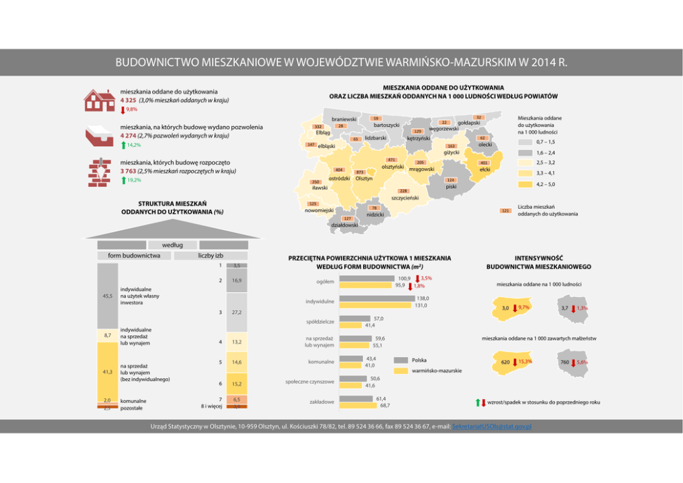 BUDOWNICTWO MIESZKANIOWE W WOJEWÓDZTWIE WARMIŃSKO-MAZURSKIM W 2014 R. MIESZKANIA ODDANE DO UŻYTKOWANIA ORAZ LICZBA MIESZKAŃ ODDANYCH NA 1 000 LUDNOŚCI WEDŁUG POWIATÓW mieszkania oddane do użytkowania 4 325 (3,0% mieszkań oddanych w kraju) 9,8% 147 14,2% 129 Elbląg 65 Mieszkania oddane do użytkowania na 1 000 ludności 22 bartoszycki 28 332 32 59 braniewski mieszkania, na których budowę wydano pozwolenia 4 274 (2,7% pozwoleń wydanych w kraju) lidzbarski gołdapski węgorzewski 62 kętrzyński 163 elbląski 0,7 – 1,5 olecki giżycki 471 mieszkania, których budowę rozpoczęto 3 763 (2,5% mieszkań rozpoczętych w kraju) 19,2% 404 250 Olsztyn 1,6 – 2,4 2,5 – 3,2 401 olsztyński mrągowski 873 ostródzki 205 ełcki 3,3 – 4,1 124 iławski 4,2 – 5,0 piski 228 szczycieński STRUKTURA MIESZKAŃ ODDANYCH DO UŻYTKOWANIA (%) 125 78 nowomiejski 127 121 nidzicki Liczba mieszkań oddanych do użytkowania działdowski według form budownictwa 45,5 liczby izb 1 3,5 2 16,9 indywidualne na użytek własny inwestora 8,7 41,3 2,0 2,5 na sprzedaż lub wynajem (bez indywidualnego) komunalne pozostałe 3,5% 100,9 95,9 1,8% ogółem 138,0 131,0 indywidulne 3 indywidualne na sprzedaż lub wynajem PRZECIĘTNA POWIERZCHNIA UŻYTKOWA 1 MIESZKANIA WEDŁUG FORM BUDOWNICTWA (m2) 27,2 spółdzielcze 57,0 41,4 59,6 55,1 4 13,2 na sprzedaż lub wynajem 5 14,6 komunalne 43,4 41,0 INTENSYWNOŚĆ BUDOWNICTWA MIESZKANIOWEGO mieszkania oddane na 1 000 ludności 3,0 9,7% 3,7 1,3% mieszkania oddane na 1 000 zawartych małżeństw Polska 620 15,3% 760 5,6% warmińsko-mazurskie 6 15,2 społeczne czynszowe 7 8 i więcej 6,5 2,9 zakładowe 50,6 41,6 61,4 68,7 wzrost/spadek w stosunku do poprzedniego roku Urząd Statystyczny w Olsztynie, 10-959 Olsztyn, ul. Kościuszki 78/82, tel. 89 524 36 66, fax 89 524 36 67, e-mail: [email protected]