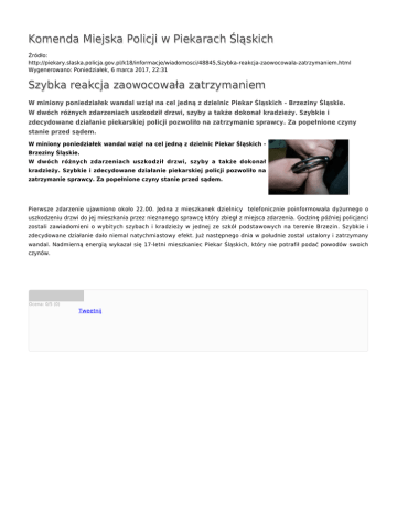 Komenda Miejska Policji w Piekarach Śląskich Źródło: http://piekary.slaska.policja.gov.pl/k18/informacje/wiadomosci/48845,Szybka-reakcja-zaowocowala-zatrzymaniem.html Wygenerowano: Poniedziałek, 6 marca 2017, 22:31 Szybka reakcja zaowocowała zatrzymaniem W miniony poniedziałek wandal wziął na cel jedną z dzielnic Piekar Śląskich - Brzeziny Śląskie. W dwóch różnych zdarzeniach uszkodził drzwi, szyby a także dokonał kradzieży. Szybkie i zdecydowane działanie piekarskiej policji pozwoliło na zatrzymanie sprawcy. Za popełnione czyny stanie przed sądem. W miniony poniedziałek wandal wziął na cel jedną z dzielnic Piekar Śląskich Brzeziny Śląskie. W dwóch różnych zdarzeniach uszkodził drzwi, szyby a także dokonał kradzieży. Szybkie i zdecydowane działanie piekarskiej policji pozwoliło na zatrzymanie sprawcy. Za popełnione czyny stanie przed sądem. Pierwsze zdarzenie ujawniono około 22.00. Jedna z mieszkanek dzielnicy telefonicznie poinformowała dyżurnego o uszkodzeniu drzwi do jej mieszkania przez nieznanego sprawcę który zbiegł z miejsca zdarzenia. Godzinę później policjanci zostali zawiadomieni o wybitych szybach i kradzieży w jednej ze szkół podstawowych na terenie Brzezin. Szybkie i zdecydowane działanie dało niemal natychmiastowy efekt. Już następnego dnia w południe został ustalony i zatrzymany wandal. Nadmierną energią wykazał się 17-letni mieszkaniec Piekar Śląskich, który nie potrafił podać powodów swoich czynów. Ocena: 0/5 (0) Tweetnij