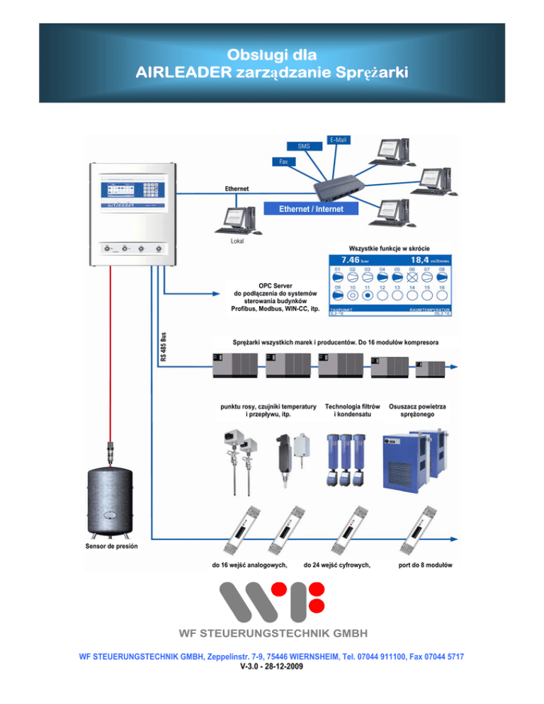 Obsługi dla AIRLEADER zarządzanie Sprężarki Ethernet / Internet Wszystkie funkcje w skrócie OPC Server do podłączenia do systemów sterowania budynków Profibus, Modbus, WIN-CC, itp. Sprężarki wszystkich marek i producentów. Do 16 modułów kompresora punktu rosy, czujniki temperatury i przepływu, itp. Technologia filtrów i kondensatu Osuszacz powietrza sprężonego Sensor de presión do 16 wejść analogowych, do 24 wejść cyfrowych, port do 8 modułów WF STEUERUNGSTECHNIK GMBH WF STEUERUNGSTECHNIK GMBH, Zeppelinstr. 7-9, 75446 WIERNSHEIM, Tel. 07044 911100, Fax 07044 5717 V-3.0 - 28-12-2009 Dzięki poniższym uwagom można zaoszczędzić mnóstwo energii biegu jałowego To może zaoszczędzić dużo energii bezczynności m³/min Load energy saving 25 in g sa v 13 l o ad 25 25 Un- Load Energy - wprowadzić moc sprężarek - wprowadzić moc sprężarek - zamontować przetwornik ciśnienia - przyłączyć kable i stacja sprężarek już pracuje w zależności od zużycia w obrębie jednej różnicy ciśnień 7 Pmax Pmin Prasa wersji programu i numer seryjny klucz ◄► 1 Spis treści CZĘŚĆ 1 Strona 1 Strona 2 Strona 3 AIRLEADER MODUŁ Master Spis treści Opis funkcji Wyświetlacz i funkcje przycisków Strona 4 Strona 5 Strona 6 Strona 7 SPRĘŻARKA Z REGULOWANĄ PRĘDKOŚCIĄ OBROTOWĄ Sterowanie i rozplanowanie regulowanych sprężarek Konfiguracja zakresu regulacji max i bufor regulacji Minimalny strumień przepływu i dostarczone ciśnienie rzeczywiste Stacja z 2 regulowanymi częstotliwościowo sprężarkami Strona 8 Strona 9 Strona 10 Strona 11 Strona 12 Strona 13 PROGRAMOWANIE STEROWANIA SPRĘŻARKI Programowanie sprężarki typu obciążenie/bieg jałowy Programowanie regulowanych sprężarek Programowanie profili ciśnienia i sekwencji kolejności Programowanie wejść analogowych urządzenia sterującego Programowanie wejść analogowych modułów przyłączeniowych z adresem 17-24 Wejścia cyfrowe i wyjście analogowe adresu modułu przyłączeniowego 17-24 Strona 14 Strona 15 ZEGAR STERUJĄCY CZASU RZECZYWISTEGO Programowanie zegara sterującego czasu rzeczywistego Notatki programowania zegara sterującego czasu rzeczywistego Strona 16 Strona 17 Strona 18 Strona 19 DANE STATUSU i URUCHOMIENIE Dane statusu i stan modułów przyłączeniowych Wskazania ekranu naciskanie przycisków Programowanie adresu IP i ustawienia sieciowe Uruchomienie i mostki załączeniowe CZĘŚĆ 2 Strona 22 Strona 23 Strona 24 Strona 25 Strona 26 Strona 27 Strona 28 Strona 29 Strona 30 Strona 31 Strona 32 Strona 33 Strona 34 Wymiary, konfiguracja i schematy połączeń Obudowa obsługa Rysunek wymiarów modułu Master Oznaczenie klem zaciskowych Schemat przyłączeniowy RS-485 schemat przyłączeniowy Konfiguracja modułu przyłączenia i wymiary Wejścia cyfrowe i analogowe modułu przyłączeniowego Przyłączenie sprężarki typu obciążenie/bieg jałowy Przyłączenie sprężarki z załączaniem zdalnym/miejscowym Wejścia analogowe modułu przyłączeniowego Wyjście analogowe modułu przyłączeniowego Wejścia i wyjścia cyfrowe modułu Master Wejścia i wyjścia analogowe modułu Master CZĘŚĆ 3: Strona 36 Strona 37 Strona 38 Strona 39 Strona 40 Strona 41 OPCJA tylko AIRLEADER w metalowej szafie sterowniczej Przyłączenie napięcia, przełącznik kluczykowy, RS-485 Przyłączenie wejścia i wyjścia analogowe Przyłączenie wyjścia cyfrowe Przyłączenie wejścia cyfrowe Lista urządzeń Układ urządzeń CZĘŚĆ 4: Strona 43 Strona 44 Strona 45 Moduły przyłączeniowe typ 4700 (szare) Konfiguracja modułu przyłączeniowego Rysunek wymiarów modułu przyłączeniowego RS-485 schemat przyłączeniowy 2 Opis funkcji AIRLEADER łączy ze sobą sprężarki o różnej wielkości w jedną jednostkę, która dopasowuje się automatycznie, zgodnie z aktualnym poborem powietrza sprężonego, do produkcji. Jest ustalane, iż zawsze tylko najbardziej wydajna kombinacja sprężarek wytwarza sprężone powietrze, które niezbędne jest do produkcji, niezależnie od ich producenta i mocy. Ciśnienie sieci pozostaje w zakresie najniższych granic. Szczególną uwagę zwraca się na to, aby powstałe koszty kształtowały się na możliwie najniższym poziomie. Moce sprężarek oraz ich wspólna różnica ciśnień dla wszystkich sprężarek są programowane. Dzięki tym informacjom AIRLEADER oblicza w sposób ciągły aktualne zużycie sprężonego powietrza oraz objętość sieci. Samoucząca się 8-krotna krzywa obliczeniowa dopasowuje sprężarki w sposób dynamiczny do zużycia powietrza sprężonego. Automatyczna zmiana pracy sprężarek wg zużycia powietrza sprężonego: Gdy wszystkie sprężarki posiadają tę samą rangę, pracują całkowicie automatycznie i zależnie od zużycia. Kolejność pracy sprężarek dopasowywana jest do przebiegu procesu produkcji w czasie rzeczywistym z uwzględnieniem obliczenia histerezy. Zawsze pracuje zespół sprężarek o minimalnej częstotliwości taktowania i o najniższych czasach biegu jałowego. Duże sprężarki pracują tylko wtedy, kiedy jest zapotrzebowanie. Zamiast biegu jałowego dużych sprężarek, pracują mniejsze pod obciążeniem. Maks. ilość dopuszczalnych startów silnika/h podawana jest przez wewnętrzny system sterowania sprężarki. Sprężarki są nieustannie kontrolowane pod względem ich statusu: Gdy pracująca sprężarka w ciągu pasma ciśnienia przejdzie w tryb zakłócenia lub zostanie wyłączona celem konserwacji, jej moc zostanie zastąpiona. Gdy do powyższego niezbędna będzie większa ilość sprężarek, wówczas ich załączenie nastąpi z przesunięciem czasowym. Obciążenie i łączne czasy pracy dla każdej sprężarki są zapisywane. Możliwe jest skasowanie czasu pracy, gdy zajdzie taka konieczność (np. przy zmianie konfiguracji sprężarek) Sterowanie sprężarek następuje poprzez moduły przyłączeniowe, które montowane są na prowadnicy w szafie sterowniczej sprężarki. Połączenie z