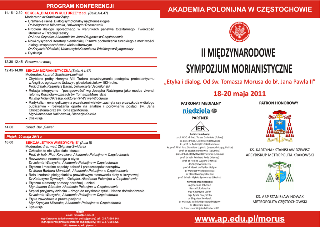 PROGRAM KONFERENCJI 11.15-12.30 SEKCJA „DIALOG W KULTURZE” 2 cd. (Sala: A 4.47) Moderator: dr Stanis³aw Zaj¹c · Brzmienie i sens. Dialog symptonalny na phonos i logos Dr Ma³gorzata Klisowska, Uniwersytet Rzeszowski · Problem dialogu spo³ecznego w warunkach pañstwa totalitarnego. Twórczoœæ literacka w Trzeciej Rzeszy Dr Anna Szyndler, Akademia im. Jana D³ugosza w Czêstochowie · Nowi dysydenci literatury niemieckiej. Pisarze pochodzenia tureckiego a mo¿liwoœci dialogu w spo³eczeñstwie wielokulturowym Dr Krzysztof Okoñski, Uniwersytet Kazimierza Wielkiego w Bydgoszczy · Dyskusja 12.30-12.45 Przerwa na kawê 12.45-14.00 SEKCJA MORIANISTYCZNA (Sala: A 4.47) Moderator: ks. prof. Stanis³aw £upiñski · Chybione próby Henryka VIII Tudora powstrzymania postêpów protestantyzmu w Anglii po og³oszeniu Ustawy o g³owie koœcio³a w 1534 roku. Prof. dr hab. Kazimierz Baran, Uniwersytet Jagielloñski · Relacja integryzmu i "postêpowoœci" wg Josepha Ratzingera jako modus vivendi reformy Koœcio³a w czasach œw. Tomasza More i dziœ Ks. mgr Roland Kraska, doktorant PWT we Wroc³awiu · Radykalizm ewangeliczny na przestrzeni wieków; zachêta czy przeszkoda w dialogu publicznym - rozwa¿ania oparte na analizie i porównaniu postaci œw. Jana Chryzostoma oraz œw. Tomasza Morusa. Mgr Aleksandra Kalinowska, Diecezja Kaliska · Dyskusja 14.00 II MIÊDZYNARODOWE SYMPOZJUM MORIANISTYCZNE „Etyka i dialog. Od œw. Tomasza Morusa do b³. Jana Paw³a II” 18-20 maja 2011 PATRONAT MEDIALNY PATRON HONOROWY PARTNER Obiad, Bar „Sawa” Pi¹tek, 20 maja 2011 r. 16.00 AKADEMIA POLONIJNA W CZÊSTOCHOWIE SEKCJA „ETYKA W MEDYCYNIE” (Aula B) Moderator: dr n. med. Zbigniew Œwiderek · Cz³owiek to nie tylko cia³o i dusza Prof. dr hab. Piotr Korzekwa, Akademia Polonijna w Czêstochowie · Rozwa¿ania neonatologa o etyce Dr Jolanta Warzycha, Akademia Polonijna w Czêstochowie · Etyczne i moralne aspekty pobrañ i przeszczepów narz¹dów Dr Maria Barbara Marciniak, Akademia Polonijna w Czêstochowie · Rola i zadania pielêgniarki w prawid³owym stosowaniu diety cukrzycowej Dr Katarzyna Dymczyk – Ociepka, Akademia Polonijna w Czêstochowie · Etyczne elementy pomocy doraŸnej u dzieci Mgr Joanna Górecka, Akademia Polonijna w Czêstochowie · Szpital przyjazny dziecku – droga do uzyskania tytu³u. Nasze doœwiadczenia Dr Jolanta Warzycha, Akademia Polonijna w Czêstochowie · Etyka zawodowa a prawa pacjenta Mgr Krystyna Mizerska, Akademia Polonijna w Czêstochowie · Dyskusja Kontakt email: [email protected] mgr Katarzyna £adoñ (sekretariat polskojêzyczny) tel.: 034 / 3684 248 mgr Agata Porêbiñska (sekretariat anglojêzyczny) tel.: 034 / 3684 226 http://www.ap.edu.pl/morus Komitet naukowy: prof. WSO. dr hab. Teresa Grabiñska (Polska) ks. prof. dr hab. Ciril Hiszem (S³owacja) ks. prof. dr Andrzej Kryñski (Kamerun) ks. prof. AP dr hab. Stanis³aw £upiñski (przewodnicz¹cy, Polska) prof. dr Bogdan Piotrkowski (Kolumbia) prof. dr hab. Rostys³aw Radyszewski (Ukraina) prof. dr hab. Reinhard Rode (Niemcy) prof. dr Helene Suzanne (Francja) dr Zbigniew Œwiderek prof. dr Gerrit de Vylder (Belgia) dr Mateusz Wiliñski (Polska) dr Stanis³aw Zaj¹c (Polska) prof. dr hab. Myko³a Zymomrya (Ukraina) Komitet organizacyjny: mgr Susane Johnson Beata Ko³odziejska mgr Katarzyna £adoñ mgr Agata Porêbiñska dr Zbigniew Œwiderek dr Mateusz Wiliñski (przewodnicz¹cy) dr Stanis³aw Zaj¹c dr Franciszek Wojciech Podlecki ZP KS. KARDYNA£ STANIS£AW DZIWISZ ARCYBISKUP METROPOLITA KRAKOWSKI KS. ABP STANIS£AW NOWAK METROPOLITA CZÊSTOCHOWSKI www.ap.edu.pl/morus PROGRAM KONFERENCJI PROGRAM KONFERENCJI Œroda, 18 maja 2011 r. od 9.15 · Aksjologia w etyce ks. prof. Józefa Tischnera Ks. dr Aleksy Kowalski, Archidiecezja Czêstochowska · Jaen-Marc Ela i teologia dialogu. Czy teologia afrykañska jest teologi¹ zamkniêt¹? Ks. dr Brice Megnono, Archidiecezja Bertoua · Dialog krêgów kulturowych Dr Dariusz Wiêcek, Akademia Polonijna w Czêstochowie · Dialog miêdzyreligijny na przyk³adzie £ódzkiego Festiwalu Dialogu Czterech Kultur O. dr Franciszek W. Podlecki, Akademia Polonijna w Czêstochowie · Dyskusja Rejestracja uczestników 10.00-10.30 Inauguracja Sympozjum (Centrum Kongresowe, aula A 1.20) 10.30-12.00 SESJA PAPIESKA (Centrum Kongresowe, Sala 1.20) Moderator: dr Mateusz Wiliñski · Dialog miêdzyreligijny w nauczaniu Jana Paw³a II Dr Ewa Sa³kiewicz, Wy¿sza Szko³a Biznesu w D¹browie Górniczej · Sprawiedliwoœæ spo³eczna w encyklikach Jana Paw³a II Prof. WSO dr hab. Teresa Grabiñska, WSO Wroc³aw · Jan Pawe³ II jako cz³owiek dialogu Ks. prof. AP dr hab. Stanis³aw £upiñski, Akademia Polonijna w Czêstochowie · Dyskusja 12.00-12.15 Przerwa na kawê 12.15-14.00 SEKCJA „DIALOG W KULTURZE” 1 (Centrum Kongresowe, Sala 1.20) Moderator: dr Ewa Sa³kiewicz · More and Holbein the Young: when literary theory can continue the dialogue Prof. AP dr Helene Suzanne, Akademia Polonijna w Czêstochowie · Spiritual message and the aspect of human life based on “Utopia” by Thomas More and on Encyclical of Pope John Paul II: “The Gospel of Life” Mgr Katarzyna Bachniak, Akademia Polonijna w Czêstochowie · Dialogue of Comfort Against Tribulation" (1534) and "On the Christian Meaning of Human Suffering" *(1984) Mgr Susanna Johnson, Akademia Polonijna w Czêstochowie · Thomas More and Oriental Utopias during Enlightenment Prof. dr Gerrit De Vylder, Lessius Hoge School Antwerpen · Dyskusja 14.00-14.30 Obiad Bar „Sawa” 18.00-19.30 SEKCJA „ETYKA W EDUKACJI I BIZNESIE” (Sala: A 4.47) Moderator: dr Maciej Thorz · Akademicka edukacja etyczna a kszta³towanie po¿¹danych postaw menad¿erskich Dr Stanis³aw Ka³u¿ny, Wy¿sza Szko³a Ekonomiczno-Informatyczna w Warszawie mgr Hanna Ka³u¿na, Polski Instytut Kontroli i Audytu i Kontrolingu w Warszawie · Konflikt interesów obywatela i pañstwa a moralnoœæ podatkowa Dr Olesyna Radyszewska, Narodowy Uniwersytet Pa