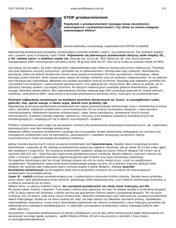 2017-03-06 22:40 www.artofbeauty.com.pl 1/3 STOP przebarwieniom Pojedynek z przebarwieniami wymaga dużej cierpliwości, samozaparcia i systematyczności. Czy mimo to można osiągnąć zadawalające efekty? Kamila Osowska, kosmetolog, współwłaściciel ESTIYO CLINIQUE Najczęstszą powakacyjną pamiątką, przybierającą rozmaite kształty i kolory, są przebarwienia. Ten problem spędza sen z powiek coraz liczniejszej części Polek. Pojawienie się pierwszych przebarwień dotyczy osób między 20., a 30. rokiem życia i z wiekiem nasila się. Szacuje się, że już ok. 30% kobiet po 30. roku życia zauważa występowanie plam ciemniejszych od koloru skóry. W grupie osób po 50. roku życia liczba ta wzrasta nawet do 90%. Zacznijmy od początku. Za kolor naszej skóry odpowiedzialna jest melanina wytwarzana przez melanocyty. Powstaje ona pod wpływem enzymu tyrozynazy i gromadzi się w melanosomach. Istnieją dwa typy melaniny: feomelanina, jaśniejsza, która nie potrafi skutecznie chronić skóry przed promieniami UV oraz eumelanina, ciemniejsza i lepiej broniąca przed słońcem. Kolor naszej skóry zależy od rodzaju melaniny oraz od wielkości melanosomów. Im są większe, tym karnacja jest ciemniejsza. Melanina ma przede wszystkim funkcje ochronne. Powstaje pod wpływem promieni UV, czynników hormonalnych i uwarunkowań genetycznych i ma zabezpieczać naszą skórę. Nie znaczy to jednak, że im jesteśmy bardziej opaleni, tym lepiej chronieni. W naszych melanocytach powstaje głównie feomelanina, zdolna przyjąć niewielką dawkę słońca. Bez odpowiedniej ochrony większa jego ilość powoduje poparzenia, rozwój wolnych rodników, uszkodzenie DNA i zaburzenia w procesie powstawania barwnika skóry, kończące się przebarwieniami. Partiami najbardziej narażonymi na działanie promieni słonecznych są: twarz, w szczególności czoło, policzki, nos, górna warga, a także szyja, dekolt oraz grzbiety rąk. Najczęstszą przyczyną powstawania przebarwień jest wpływ promieniowania słonecznego wraz z niewłaściwą ochroną skóry. Jednakże, wiążącym problemem z promieniowaniem UV są zmiany hormonalne związane z zaburzeniami miesiączkowania, stosowanie doustnej antykoncepcji, ciąża, okres menopauzy, stosowanie innych kuracji hormonalnych, przebyte choroby wątroby, nadnerczy i tarczycy oraz działanie substancji fitotoksycznych lub fotoalergizujących, znajdujących się w lekach, kosmetykach, mydłach. Problem rozjaśniania skóry staje się wyzwaniem zarówno dla producentów preparatów kosmetycznych, jak i gabinetów kosmetycznych oraz dermatologii estetycznej. Najlepsze efekty usuwania przebarwień uzyskuje się w przypadku terapii skojarzonej, polegającej na usunięciu już istniejących przebarwień oraz na hamowaniu, zachodzących z udziałem tyrozynazy wczesnych reakcji enzymatycznych, które prowadzą do produkcji melaniny. Jedną z bardzo skutecznych metod usuwania przebarwień jest laseroterapia. Światło lasera rozgrzewa komórki barwnikowe i uszkadza je. Po zabiegu przebarwienie zazwyczaj najpierw ciemnieje, ale po około 10-14 dni znika, gdyż jest wydalane z organizmu. Do usuwania przebarwień najlepiej nadają się lasery, których długość fali mieści się w zakresie 500-532 nm – taka fala jest najmocniej pochłaniana przez melaninę. Bardzo dobrym, mocnym laserem do walki z trudnymi i głębokimi plamami pigmentacyjnymi jest Q-Swich oraz laser bromkowo-miedziowy. Szczególnie interesujący jest ten drugi, którego prawie nie ma na rynku medycznym, a jest on wyjątkowym urządzeniem. Wyjątkowość lasera bromkowo-miedziowego polega na tym, że w jednym impulsie aplikuje dwie długości fal, podczas gdy tradycyjne lasery emitują wiązkę o jednej długości. Zabiegi laserem bromkowo-miedziowym są szczególnie polecane w przypadku trudnych do usunięcia lub nawracających przebarwień, na przykład ostudy. Laser Q – switch emituje wysokoenergetyczne, a jednocześnie niezwykle krótkie impulsy. Światło lasera przenika przez skórę i jest absorbowane przez barwnik, powodując efekt fotoakustyczny, czyli rozbicie otorbionego barwnika, a w efekcie usunięcie go ze skóry. Wbrew temu, co głoszą niektóre salony, do usuwania przebarwień nie służy laser frakcyjny ani IPL. IPL bywa często mylony z laserem. Tymczasem różnica jest ogromna, bo laser to wiązka światła o konkretnej długości, a IPL to duży zakres fali świetlnej, z której wycina się specjalnymi filtrami wiązki o pożądanej długości. IPL ma dużo mniejszą moc od lasera, stąd dużo niższa skuteczność. Również niewłaściwym jest zalecanie do usuwania przebarwień lasera frakcyjnego. Działa on na skórę wybiórczo, więc nie daje szansy na całkowite usunięcie zmiany. Dodatkowo, nieprawidłowo stosowany, może wręcz stymulować pojawianie się nowych przebarwień. Laser frakcyjny sprawdza się doskonale przy zabiegach odmładzających, a częściowe zmniejszenie przebarwień należy traktować jedynie jako „efekt uboczny”. Korzystanie z artykułów publikowanych w portalu artofbeauty.com.pl dla celów komercyjnych bądź dokonywanie ich opracowań wymaga zgody wydawcy - spółki Estetica Polska. W tym celu prosimy o kontakt z Ewą Cesarz, [email protected] 2017-03-06 22:40 www.artofbeauty.com.pl 2/3 Kolejnym sposobem, bardzo często wykorzystywanym w terapiach usuwania przebarwień są peelingi chemiczne. Ta metoda usuwania plam pigmentacyjnych jest dosyć skuteczna, usuwając zmiany poprzez złuszczanie. Popularne są peelingi chemiczne, które w swym składzie zawierają mieszaninę kilku składników kwasowych oraz substancje wybielająco- złuszczające. Najbardziej popularne i skuteczne peelingi to: – Cosmelan, bardzo dziś popularny, pozwala usunąć plamy w stosunkowo krótkim czasie, bo efekty widać po około miesiącu. W gabinecie nakłada się preparat, który po 3 do 10 godzinach, już w domu, trzeba zmyć. Potem nakłada się pre
