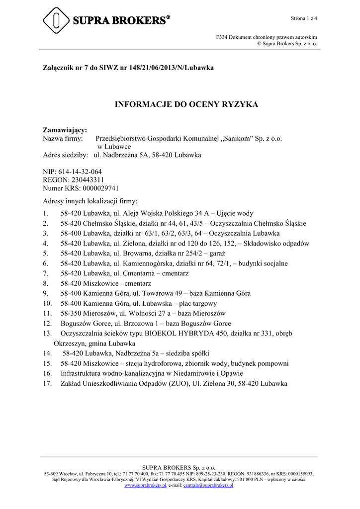 Strona 1 z 4 F334 Dokument chroniony prawem autorskim © Supra Brokers Sp. z o. o. Załącznik nr 7 do SIWZ nr 148/21/06/2013/N/Lubawka INFORMACJE DO OCENY RYZYKA Zamawiający: Nazwa firmy: Przedsiębiorstwo Gospodarki Komunalnej „Sanikom” Sp. z o.o. w Lubawce Adres siedziby: ul. Nadbrzeżna 5A, 58-420 Lubawka NIP: 614-14-32-064 REGON: 230443311 Numer KRS: 0000029741 Adresy innych lokalizacji firmy: 1. 2. 3. 4. 5. 6. 7. 8. 9. 10. 11. 12. 13. 58-420 Lubawka, ul. Aleja Wojska Polskiego 34 A – Ujęcie wody 58-420 Chełmsko Śląskie, działki nr 44, 61, 43/5 – Oczyszczalnia Chełmsko Śląskie 58-400 Lubawka, działki nr 63/1, 63/2, 63/3, 64 – Oczyszczalnia Lubawka 58-420 Lubawka, ul. Zielona, działki nr od 120 do 126, 152, – Składowisko odpadów 58-420 Lubawka, ul. Browarna, działka nr 254/2 – garaż 58-420 Lubawka, ul. Kamiennogórska, działki nr 64, 72/1, – budynki socjalne 58-420 Lubawka, ul. Cmentarna – cmentarz 58-420 Miszkowice - cmentarz 58-400 Kamienna Góra, ul. Towarowa 49 – baza Kamienna Góra 58-400 Kamienna Góra, ul. Lubawska – plac targowy 58-350 Mieroszów, ul. Wolności 27 a – baza Mieroszów Boguszów Gorce, ul. Brzozowa 1 – baza Boguszów Gorce Oczyszczalnia ścieków typu BIOEKOL HYBRYDA 450, działka nr 331, obręb Okrzeszyn, gmina Lubawka 14. 58-420 Lubawka, Nadbrzeżna 5a – siedziba spółki 15. 58-420 Miszkowice – stacja hydroforowa, zbiornik wody, budynek pompowni 16. Infrastruktura wodno-kanalizacyjna w Niedamirowie i Opawie 17. Zakład Unieszkodliwiania Odpadów (ZUO), Ul. Zielona 30, 58-420 Lubawka SUPRA BROKERS Sp. z o.o. 53-609 Wrocław, ul. Fabryczna 10, tel.: 71 77 70 400, fax: 71 77 70 455 NIP: 899-25-23-230, REGON: 931886336, nr KRS: 0000155993, Sąd Rejonowy dla Wrocławia-Fabrycznej, VI Wydział Gospodarczy KRS, Kapitał zakładowy: 501 800 PLN - wpłacony w całości www.suprabrokers.pl, e-mail: [email protected] Strona 2 z 4 F334 Dokument chroniony prawem autorskim © Supra Brokers Sp. z o. o. Firma jest zgłoszona jako podatnik VAT Przeważająca działalność firmy objęta jest podatkiem VAT w stawce: 8 % Mienie firmy ujmowane jest w Rejestrze Środków Trwałych i w innych rejestrach: bez uwzględnienia podatku VAT INFORMACJE TECHNICZNE Zakład unieszkodliwiania odpadów (ZUO) w skład którego wchodzą poniższe znajduje się w Lubawce (58-420) na ulicy Zielonej 30. Hala sortowni : kubatura brutto - 26670 m3 powierzchnia zabudowy - 2470 m² powierzchnia użytkowa - 2400 m² Budynek socjalno-biurowy: kubatura brutto - 1.036 m3 powierzchnia zabudowy - 239,60 m² powierzchnia użytkowa - 189,17 m² Kompostownia modułowa: kubatura brutto z zadaszeniem tech. – 4408,90 m3 kubatura żelbetonowych modułów – 2406,25 m3 powierzchnia zabudowy – 687,50 m² powierzchnia użytkowa- 189,17 m² Wiata na surowce wtórne i odpady: kubatura brutto- 1734 m3 powierzchnia zabudowy – 339,60 m² powierzchnia użytkowa – 336,00 m² Wiata na kompaktor: kubatura brutto - 122 m3 powierzchnia zabudowy – 31,70 m² powierzchnia użytkowa – 31,05 m² Ogrodzenie terenu: Długość ogrodzenia siatki powlekanej wys. 2,0 m na słupkach stalowych- 871 mb SUPRA BROKERS Sp. z o.o. 53-609 Wrocław, ul. Fabryczna 10, tel.: 71 77 70 400, fax: 71 77 70 455 NIP: 899-25-23-230, REGON: 931886336, nr KRS: 0000155993, Sąd Rejonowy dla Wrocławia-Fabrycznej, VI Wydział Gospodarczy KRS, Kapitał zakładowy: 501 800 PLN - wpłacony w całości www.suprabrokers.pl, e-mail: [email protected] Strona 3 z 4 F334 Dokument chroniony prawem autorskim © Supra Brokers Sp. z o. o. Instrukcja bezpieczeństwa pożarowego Zakładu Unieszkodliwiania Odpadów w Lubawce przy ulicy Zielonej 30. 1. Liczba osób Łączna ilość pracowników zakładu 20 osób w systemie jednozmianowym. Pracowni sortowni odpadów 18 osób. Pracownicy zatrudnienie przy pracach na otwartej przestrzeni 2 osoby. 2. Strefy zagrożenia wybuchem. W obiekcie części ZL i PM nie znajdują się pomieszczenia ani strefy zagrożone wybuchem. 3. Wymagane urządzenia przeciwpożarowe i gaśnice. Analizując przeznaczenie budynku, wskaźniki techniczne, liczbę personelu należy stwierdzić, że wymagane są następujące urządzenia przeciwpożarowe: a) Hydranty wewnętrzne. - Nie występują. b) Urządzenia zapobiegające zadymieniu lub służące do usuwania dymu.- Nie wymagane. c) Oświetlenie awaryjne.- Wstępuje. Halę sortowni wyposażono w oświetlenie ewakuacyjne. Oprawy oświetlenia wyposażono w elektroinwretery z jednogodzinnym czasem podtrzymywania świecenia. d) Przeciwpożarowy wyłącznik prądu. Zastosowano dwa przeciwpożarowe wyłączniki prądu. Przeciwpożarowy wyłącznik prądu usytuowany jest na zewnątrz obiektu przy wejściach do budynku sortowni. e) Dźwiękowy system ostrzegawczy i system sygnalizacji pożarowej.- Nie występuje. f) Podręczny sprzęt gaśniczy. W budynku sortowni rozmieszczono 8 gaśnic proszkowych ABC 6 kg. W budynku socjalnym rozmieszczono 1 gaśnicę proszkową ABC 6 kg. g) Główny kurek gazu.- Nie występuje. Brak instalacji gazowej. h) Zaopatrzenie wodne do zewnętrznego gaszenia pożaru. Hydrant DN 80 zlokalizowany przy budynku portierni. Hydrant DN 80 zlokalizowany przy kompostowni modułowej. i) Dla potrzeb ochrony zbiorowej budynek sortowni wyposażono w następujący sprzęt służący do ratowania ludzi: • Sprzęt ochronny dróg oddechowych (aparat powietrzny szt.1) • Miernik gazów trujących szt.2 • Latarka przeciwwybuchowa szt.2 • Szelki bezpieczeństwa szt.2 • Linki bezpieczeństwa szt.2 • Apteczki pierwszej pomocy szt.2 Ochrona Zakładu Unieszkodliwiania Odpadów w Lubawce przy ulicy Zielonej 30. • ochrona na miejscu 8 godz. na dobę w dni robocze od godz. 22:00 do 6:00 • ochrona na miejscu całodobowo w soboty, niedziele oraz dni wolne od pracy • zastosowanie (zainstalowanie) monitoringu wizyjnego w ilości 2 kamer. SUPRA BROKERS Sp. z o.o. 53-609 Wrocław, ul. Fabryczna 10, tel.: 71 77 70 400, fax: 71 77 70 455 NI