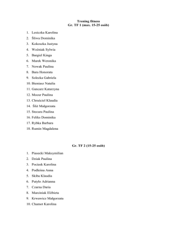 Trening fitness Gr. TF 1 (max. 15-25 osób) 1. Lesiczka Karolina 2. Śliwa Dominika 3. Kokoszka Justyna 4. Woźniak Sylwia 5. Bargiel Kinga 6. Marek Weronika 7. Nowak Paulina 8. Bara Honorata 9. Solecka Gabriela 10. Bieniasz Natalia 11. Gancarz Katarzyna 12. Mocur Paulina 13. Chruściel Klaudia 14. Śliż Małgorzata 15. Stecura Paulina 16. Feliks Dominika 17. Rybka Barbara 18. Rumin Magdalena Gr. TF 2 (15-25 osób) 1. Piasecki Maksymilian 2. Dziak Paulina 3. Pociask Karolina 4. Podleśna Anna 5. Skiba Klaudia 6. Putyło Adrianna 7. Czarna Daria 8. Marciniak Elżbieta 9. Krwawicz Małgorzata 10. Chamot Karolina 11. Bosak Kinga 12. Baran Aleksandra 13. Więcek Alicja 14. Brzyszcz Aleksandra 15. Chlebek Wiktoria 16. Worek Kamila 17. Smędra Andżelika 18. Staniszewska Monika Gr. TF 3 (15-25osób) 1. Kielar Gabriela 2. Panas Weronika 3. Sieńko Paweł 4. Cisek Karlina 5. Lechoniewicz Martyna 6. Szymbara Kinga 7. Kłęczek Piotr 8. Szajowska Paulina 9. Antonik Agnieszka 10. Baran Dominika 11. Niedzioch Marek 12. Patrzyk Ewa 13. Machol Natalia 14. Uram Krystian 15. Piwowar Klaudia 16. Kaczor Martyna Gr. TF 4 (15-25osób) 1. Abratowska Alicja 2. Zubel Wioleta 3. Grzybała Karolina 4. Hyleńska Karolina 5. Łącka Ewelina 6. Szary Anna 7. Pelc Kamil 8. Szczepański Michał 9. Cholewa Dominika 10. Grabiec Maksymilian 11. Hejnar Weronika 12. Bibow Przemysław 13. Zima Adrian 14. Herdzik Iwona 15. Leśniak Zuzanna Gr. TF 5 (15-25osób) 1. Waszczuk Bartosz 2. Bury Urszula 3. Puzio Sylwia 4. Pikor Aneta 5. Sobczuk Patrycja 6. Lewicka Agata 7. Wojtoń Anna 8. Musiał Natalia 9. Bilska Angelika 10. Kustra Magdalena 11. Polak Paulina 12. Łuszczek Katarzyna 13. Kita Kinga 14. Hanas Zuzanna 15. Wilk Angelika 16. Kozioł Kinga 17. Lepak Małgorzata Gr. TF 6 (15-25osób) 1. Telega Ewelina 2. Owczarska Klaudia 3. Sudoł Maciej 4. Parys Justyna 5. Miara Karolina 6. Skóra Klaudia 7. Nepalska Agnieszka 8. Pięta Paulina 9. Sękowska Karolina 10. Pilarz Karolina 11. Maziarz Karolina 12. Pietrońska Karolina 13. Budzik Paulina 14. Marszałek Klaudia 15. Warchoł Monika