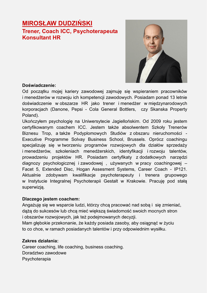 MIROSŁAW DUDZIŃSKI Trener, Coach ICC, Psychoterapeuta Konsultant HR Doświadczenie: Od początku mojej kariery zawodowej zajmuję się wspieraniem pracowników i menedżerów w rozwoju ich kompetencji zawodowych. Posiadam ponad 13 letnie doświadczenie w obszarze HR jako trener i menedżer w międzynarodowych korporacjach (Danone, Pepsi - Cola General Bottlers, czy Skanska Property Poland). Ukończyłem psychologię na Uniwersytecie Jagiellońskim. Od 2009 roku jestem certyfikowanym coachem ICC. Jestem także absolwentem Szkoły Trenerów Biznesu Trop, a także Podyplomowych Studiów z obszaru nieruchomości Executive Programme Solvay Business School, Brussels. Oprócz coachingu specjalizuję się w tworzeniu programów rozwojowych dla działów sprzedaży i menedżerów, szkoleniach menedżerskich, identyfikacji i rozwoju talentów, prowadzeniu projektów HR. Posiadam certyfikaty z dodatkowych narzędzi diagnozy psychologicznej i zawodowej , używanych w pracy coachingowej – Facet 5, Extended Disc, Hogan Assesment Systems, Career Coach - IP121. Aktualnie zdobywam kwalifikacje psychoterapeuty i trenera grupowego w Instytucie Integralnej Psychoterapii Gestalt w Krakowie. Pracuję pod stałą superwizją. Dlaczego jestem coachem: Angażuję się we wsparcie ludzi, którzy chcą pracować nad sobą i się zmieniać, dążą do sukcesów lub chcą mieć większą świadomość swoich mocnych stron i obszarów rozwojowych, jak też podejmowanych decyzji. Mam głębokie przekonanie, że każdy posiada zasoby, aby osiągnąć w życiu to co chce, w ramach posiadanych talentów i przy odpowiednim wysiłku. Zakres działania: Career coaching, life coaching, business coaching. Doradztwo zawodowe Psychoterapia Klienci: Osoby, które odczuwają dyskomfort w życiu prywatnym jak i zawodowym i chcą polepszyć jakość swojego życia. Pracownicy, którzy chcą wykorzystać swoje mocne strony w rozwoju kariery zawodowej, poprawić kluczowe relacje lub wzmocnić przywództwo. Wszyscy, którzy chcą mieć dobry plan na życie. Przykładowe rekomendacje: "Mirek Dudziński to coach, który w atmosferze zaufania towarzyszy w procesie zmiany. Dzięki swojemu wyważeniu i umiejętnościom potrafi tak poprowadzić dialog, że uczestnik spotkania decyduje się na poruszanie tematów dla niego ważnych, a niekiedy bardzo trudnych. Nie ocenia i nie pozostaje obojętny". Monika Kobus | Segment Marketing Manager LexisNexis Polska Sp. z o.o. "Miałam przyjemność odbycia formie coachingu z Mirkiem. Była to niezwykle inspirująca, motywująca i dająca nowe spojrzenie praca. Mirek potrafi swoim ciepłym głosem i konstruktywnymi uwagami/pytaniami łagodnie prowadzić do refleksji i nowego spojrzenia na sytuację. Dając poczucie bezpieczeństwa, umiejętnie zachęca do testowania i próbowania nowych sposób myślenia i funkcjonowania. Jestem bardzo zadowolono ze współpracy i efektów" Anna Stępniewska | Business Development Manager Marcus Evans