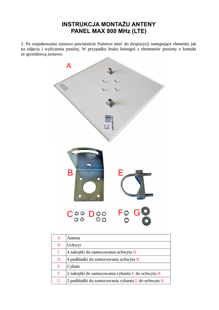 INSTRUKCJA MONTAŻU ANTENY PANEL MAX 800 MHz (LTE) 1. Po rozpakowaniu zestawu powinniście Państwo mieć do dyspozycji następujące elementy jak na zdjęciu i wyliczeniu poniżej. W przypadku braku któregoś z elementów prosimy o kontakt ze sprzedawcą zestawu. A Antena B Uchwyt C 4 nakrętki do zamocowania uchwytu B D 4 podkładki do zamocowania uchwytu B E Cybant F 2 nakrętki do zamocowania cybantu E do uchwytu B G 2 podkładki do zamocowania cybantu E do uchwytu B 2. Uchwyt B nakładamy na śruby wystające z anteny A jak na zdjęciu poniżej. 3. Na gwinty wystające z otworów nałożonego uchwytu B nakładamy podkładki D oraz nakrętki C, które następnie dokręcamy. 4. Do otworów na uchwycie B nakładamy cybant E. 5. Na gwinty cybantu E wystające z otworów nałożonego uchwytu B nakładamy podkładki G oraz nakrętki F, które następnie dokręcamy. 6. Antenę mocujemy za pomocą cybantu na uchwycie masztowym.