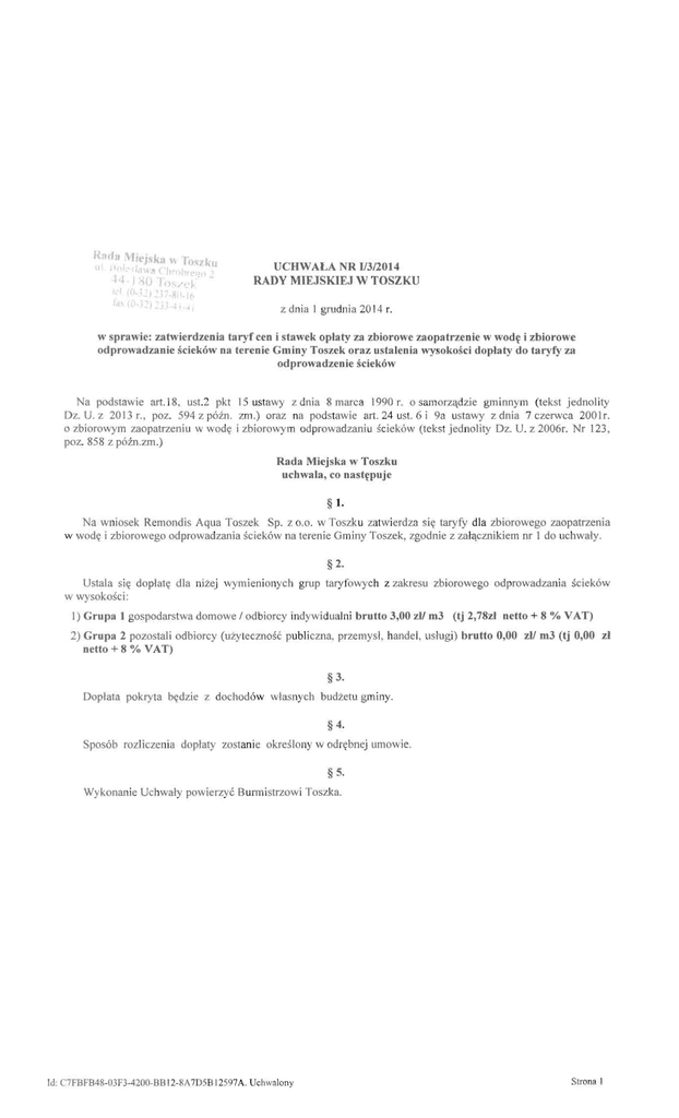 Na wniosek Remondis Aqua Toszek Sp. z 0 .0. w Toszku zatwierdza si~ taryfy dla zbiorowego zaopatrzenia