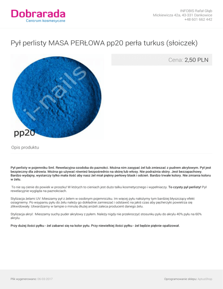 INFOBIS Rafał Głąb Mickiewicza 42a, 43-331 Dankowice +48 601 662 442 Pył perlisty MASA PERŁOWA pp20 perła turkus (słoiczek) Cena: 2,50 PLN Opis produktu Pył perlisty w pojemniku 5ml. Rewelacyjna ozodoba do paznokci. Można nim zasypać żel lub zmieszać z pudrem akrylowym. Pył jest bezpieczny dla zdrowia. Można go używać również bezpośrednio na skórę lub włosy. Nie podrażnia skóry. Jest bezzapachowy. Bardzo wydajny, wystarczy tylko mała ilość aby nasz żel miał piękny perłowy blask i odcień. Bardzo trwałe kolory. Nie zmiania koloru w żelu. To nie są cienie do powiek w proszku! W których to cieniach jest dużo talku kosmetycznego i wypełniaczy. To czysty pył perlisty! Pył rewelacyjnie wygląda na paznokciach. Stylizacja żelami UV: Mieszamy pył z żelem w osobnym pojemniczku. Im więcej pyłu nałożymy tym bardziej błyszczący efekt osiagniemy. Po wsypaniu pyłu do żelu należy go dokładnie zamieszać i odstawić na jakiś czas aby pęcherzyki powietrza się zlikwidowały. Utwardzamy w lampie o minutę dłużej aniżeli zaleca producent danego żelu. Stylizacja akryl: Mieszamy suchy puder akrylowy z pyłem. Należy nigdy nie przekroczyć stosunku pyłu do akrylu 40% pyłu na 60% akrylu. Przy dużej ilości pyłku - żel zabarwi się na kolor pyłu. Przy niewielkiej ilości pyłku - żel będzie pięknie opalizował. Plik wygenerowano: 06-03-2017 Oprogramowanie sklepu: AptusShop INFOBIS Rafał Głąb Mickiewicza 42a, 43-331 Dankowice +48 601 662 442 Galeria Plik wygenerowano: 06-03-2017 Powered by TCPDF (www.tcpdf.org) Oprogramowanie sklepu: AptusShop