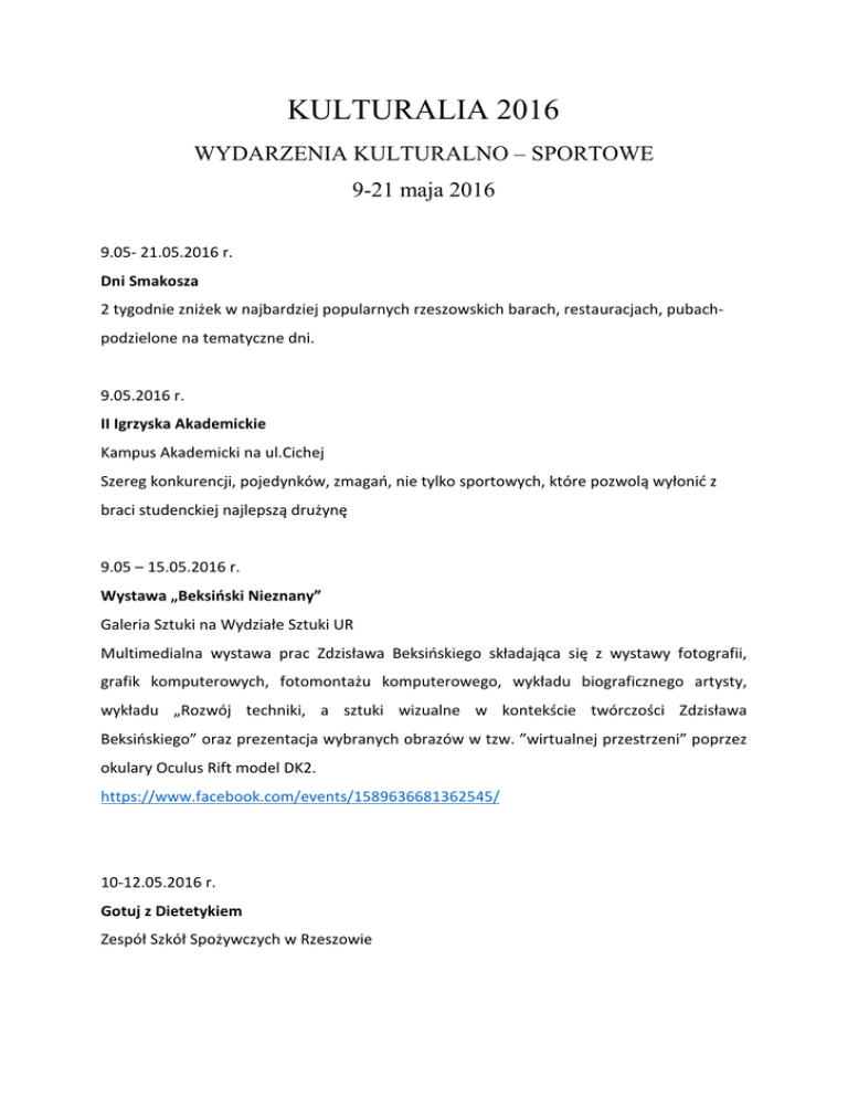 KULTURALIA 2016 WYDARZENIA KULTURALNO – SPORTOWE 9-21 maja 2016 9.05- 21.05.2016 r. Dni Smakosza 2 tygodnie zniżek w najbardziej popularnych rzeszowskich barach, restauracjach, pubachpodzielone na tematyczne dni. 9.05.2016 r. II Igrzyska Akademickie Kampus Akademicki na ul.Cichej Szereg konkurencji, pojedynków, zmagań, nie tylko sportowych, które pozwolą wyłonić z braci studenckiej najlepszą drużynę 9.05 – 15.05.2016 r. Wystawa „Beksiński Nieznany” Galeria Sztuki na Wydziałe Sztuki UR Multimedialna wystawa prac Zdzisława Beksińskiego składająca się z wystawy fotografii, grafik komputerowych, fotomontażu komputerowego, wykładu biograficznego artysty, wykładu „Rozwój techniki, a sztuki wizualne w kontekście twórczości Zdzisława Beksińskiego” oraz prezentacja wybranych obrazów w tzw. ”wirtualnej przestrzeni” poprzez okulary Oculus Rift model DK2. https://www.facebook.com/events/1589636681362545/ 10-12.05.2016 r. Gotuj z Dietetykiem Zespół Szkół Spożywczych w Rzeszowie Nauka zdrowego i szybkiego gotowania dla grupy osób zainteresowanych zdrowym żywieniem. Projekt przeprowadzony przez dietetyków. 13-14.05.2016r. Warsztaty aktorskie z grupą improwizacyjną oraz Kamilem Dobrowolskim Celem warsztatów jest zapoznanie studentów z zawodem aktora, pogłębieniu zdolności aktorskich uczestników, ich integrację, a także popularyzowanie działań artystycznych pośród społeczności akademickiej oraz rozwijanie kreatywności studentów. 14.05.2016 r. Indeks Kulturalny w ramach Nocy Muzeów w Rzeszowie Podczas Nocy Muzeów, uczestnicy będą mieć możliwość odwiedzenia najbardziej popularnych rzeszowskich instytucji za darmo, rywalizując i zbierając pieczątki do specjalnych Kulturaliowych Indeksów. 14-15.05.2016 r. I Otwarty Turniej CS:GO Uniwersytet Rzeszowski, budynek A0 Turniej, podczas którego wyłonieni w kwalifikacjach najlepsi gracze będą mieli okazję zagrać w wielkim finale. Szereg różnych atrakcji zapewni widzom rozrywkę przez czas trwania turnieju. Każdy fan gier znajdzie tam coś dla siebie, a podczas konkursów będą oni mogli wygrać cenne nagrody. https://www.facebook.com/events/1005958762812794/ 16.05.2016 r. Akademia Nikona Kurs fotograficzny Budynek A0 UR Celem kursu jest zapoznanie studentów z podstawami wykonywania fotografii krajobrazowej. Omówione zostaną kolejne etapy powstawania tego typu zdjęć: począwszy od planowania, poprzez samo fotografowanie, wskazówki dotyczące edycji materiału, do wydruku. https://www.facebook.com/events/1744071932504358/ 17.05.2016 r. Finał Student ma Talent Wydział Muzyki UR Gala Finałowa ogólnopolskiego konkursu, którego celem jest wyłonienie najciekawszych osobowości wśród osób posiadających różnorodne talenty i umiejętności. https://www.facebook.com/events/245180389151669/?active_tab=posts 18.05.2016 r. Oczyma niewidomych Budynek A0 UR Oczyma Niewidomych” to wyjątkowa podróż w niewidzialny świat, podczas której każdy będzie mógł wypróbować, jak radzić sobie bez pomocy wzroku – wyłącznie za pomocą zmysłu słuchu, węchu, równowagi. 18.05.2016 r. Finał Ligi Uniwersyteckiej PubQuiz Klub Muzyczny Mikrofon Finał cotygodniowych rozgrywek wiedzy w Klubie Muzycznym Mikrofon. 19.05.2016 r. II Studencki Festiwal Kolorów ColoUR it! Miasteczko Akademickie na ul.Cichej Niezapomniany festiwal barw który jest największą atrakcją Barwnego Korowodu. Polega na bitwie kolorów (proszki holi) https://www.facebook.com/events/173433999713537/ 13-14.05.2016 Skoki Spadochronowe są skierowane do wszystkich chcących przeżyć niezapomnianą przygodę. Do wyboru Skoki Tandemowe oraz Static Line. Miejsce: Lądowisko w Laszkach koło Jarosławia https://www.facebook.com/events/1157295594290431/ 17.05.2016r Gra miejska THE TWINS IV edycja gry miejskiej "The Twins" tym razem przybierze formę pieszą. Trasa została wyznaczona na osiedlu Drabinianka. Start promocji: 06.04.2016r Miejsce: Campus Cicha UR 10, 13 maja 2016r Finał Akademickiej Ligi Siatkówki Mieszanej 2016 Uniwersytet Rzeszowski Turniej rozpoczął się 1 marca, bierze w nim udział 9 drużyn. Miejsce: Hala sportowa przy ul. Ćwiklińskiej - Campus UR Zalesie 17.05.2016 Hydroaktywni Zawody kajakarskie odbywające się w konkurencjach: dwójki kobiet, dwójki mężczyzn oraz miksty. Miejsce: Zalew Rzeszowski - Lisia Góra 10.05.2016 Dzień na trampolinach Gry zabawy i zawody organizowane we współpracy z Parkiem Trampolin Happy Jump. Miejsce: Happy Jump Oficjalne wydarzenie Kulturalia 2016 https://www.facebook.com/events/1688713994737866/
