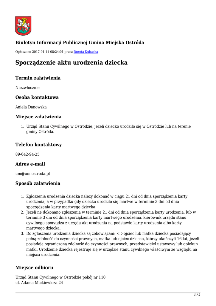 Biuletyn Informacji Publicznej Gmina Miejska Ostróda Ogłoszono 2017-01-11 08:24:01 przez Dorota Kubacka Sporządzenie aktu urodzenia dziecka Termin załatwienia Niezwłocznie Osoba kontaktowa Aniela Danowska Miejsce załatwienia 1. Urząd Stanu Cywilnego w Ostródzie, jeżeli dziecko urodziło się w Ostródzie lub na terenie gminy Ostróda. Telefon kontaktowy 89-642-94-25 Adres e-mail [email protected] Sposób załatwienia 1. Zgłoszenia urodzenia dziecka należy dokonać w ciągu 21 dni od dnia sporządzenia karty urodzenia, a w przypadku gdy dziecko urodziło się martwe w terminie 3 dni od dnia sporządzenia karty martwego dziecka. 2. Jeżeli ne dokonano zgłoszenia w terminie 21 dni od dnia sporządzenia karty urodzenia, lub w terminie 3 dni od dnia sporządzenia karty martwego urodzenia, kierownik urzędu stanu cywilnego sporządza z urzędu akt urodzenia na podstawie karty urodzenia albo karty martwego dziecka. 3. Do zgłoszenia urodzenia dziecka są zobowiązani: < >ojciec lub matka dziecka posiadający pełną zdolność do czynności prawnych, matka lub ojciec dziecka, którzy ukończyli 16 lat, jeżeli posiadają ograniczoną zdolność do czynności prawnych, przedstawiciel ustawowy lub opiekun matki. Urodzenie dziecka rejestruje się w urzędzie stanu cywilnego właściwym ze względu na miejsca urodzenia. Miejsce odbioru Urząd Stanu Cywilnego w Ostródzie pokój nr 110 ul. Adama Mickiewicza 24 1/2 14-100 Ostróda Wymagane Dokumenty 1. Dla dziecka pochodzącego z małżeństwa: < >dowody osobiste rodziców (do wglądu). Dla dziecka gdy matka jest panną (bez uznania przez biologicznego ojca): < >dowód osobisty matki dziecka (do wglądu). Dla dziecka gdy matka jest panną (z uznaniem przez biologicznego ojca) : < >obecność obojga rodziców, dowody osobiste rodziców (do wglądu). Dla dziecka gdy matka jest osobą rozwiedzioną lub pozostającą w separacji : < >dowód osobisty matki dziecka (do wglądu). Dla dziecka gdy matka jest wdową : < >dowód osobisty matki dziecka (do wglądu). Pełnomocnictwo - w przypadku ustanowienia pełnomocnika (oryginał lub urzędowo poświadczony odpis). Czas realizacji 1. Zgłoszenia urodzenia dziecka dokonuje się ustnie. 2. Kartę urodzenia przekazują, w terminie 3 dni od dnia jej sporządzenia, a kartę martwego urodzenia w terminie 1 dnia od dnia jej sporządzenia, podmioty wykonujące działalność leczniczą. 3. Sprawa załatwiana jest niezwłocznie. 4. Odpis aktu urodzenia wydawany jest bezpośrednio po sporządzeniu aktu urodzenia. Opłaty Sporządzenie aktu urodzenia wolne jest od opłaty skarbowej. Tryb odwoławczy Wojewoda Warmińsko-Mazurski gdy kierownik odmawia wpisania więcej niż 2 imion, imienia ośmieszającego, zdrobniałego oraz imienia nie pozwalającego na odróżnienie płci dziecka Uwagi Kierownik odmówi wpisania do aktu urodzenia więcej niż dwóch imion, imienia ośmieszającego, zdrobniałego oraz nie pozwalającego na odróżnienie płci dziecka. Podstawa prawna 1. Ustawa z dnia 28 listopada 2014 r. Prawo o aktach stanu cywilnego (t.j. Dz.U. z 2016 r. poz. 2064). 2. Ustawa z dnia 25 lutego 1964 r. Kodeks rodzinny i opiekuńczy (Tekst jednolity Dz.U. z 2015 r. poz. 2082 z późn. zm.). 3. Rozporządzenie Ministra Spraw Wewnętrznych z dnia 29 stycznia 2015 r. w sprawie wzorów dokumentów wydawanych z zakresu rejestracji stanu cywilnego (Dz.U. z 2015 r. poz. 194). 4. Rozporządzenie Ministra Zdrowia z dnia 12 stycznia 2015 r. w sprawie wzorów karty urodzenia i karty martwego urodzenia (Dz.U. z 2015 r. poz. 171). 2/2