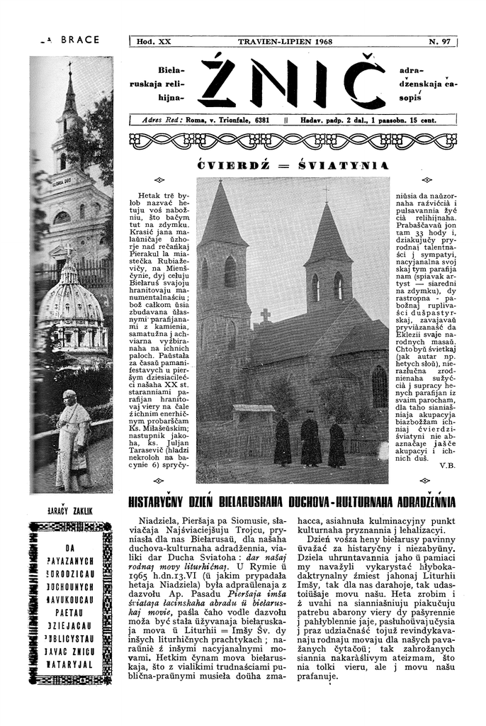I Hod. XX Bielaruskaja relihijna- TRAVIEN-LIPIEN 1968 ZNIC Adres Red: Roma, v. Trionfale, 6381 |l N. 97 adraV v dzenskaja ea/ sopis Hadav. padp. 2 dal., 1 paasobn. 15 cent. CTIEBDZ = STIATTNU <$> Hetak t r ê byłob nazvać hetuju voś nabožniu, sto ba cym tut na zdymku. Krasie jana malaŭničaje ŭzhorje nad rečankaj Pierakul la mia stecka Rubiaževičy, n a Mienščynie, dyj cełuju Biełaruś svajoju hranitovaju manumentalnaściu ; bož całkom ŭsia zbudavana ŭłasny mi" par afij an ami z kamienia, samatužna j achviarna vyźbiranaha na ichnich paloch. Paŭstała za časaŭ pamanifestavych u pieršym dziesiacilećci našaha X X st. staranniami parafijan hranitovaj viery na cale ź ichnim enerhičnym probarščam Ks. Miłašeŭskim; nastupnik jakoha, ks. Juljan Tarasevič (hladzi nekroloh na bacynie 6) spryčy- niŭsia da naŭzornaha raźvićcia i pulsavannia žyc cià relihiinaha. Prabaščavaŭ jon ram 33 hody i, dziakujučy pryrodnai talentnaści j sympatyi, nacyj analna svoj skaj tym par afi ja nam (spiavak artyst — siaredni na zdymku), dy rastropna - pabožnaj ruplivaści d u š p a s t y r skaj, zavajavaŭ pryviazanaść da Eklezii svaje narodnych masaŭ ; Chto byŭ vśvietkaj (jak autar n p . hetych słoŭ), nierazłučna zrodnienaha sužyćcià j supracy henych parafijan iz svaim parocham, dla taho sianiašniaja akupacyja biazbožžam ichniaj ćvierdziśviatyni nie abaznačaje j a š č e akupacyi i ich nich duš. V.B. O HISTARYGIUY DZHIU DltlARUSKAHA DUCH0VA-KU1T0RHIAHA ADRADZIIUAIIA Niadziela, Pieršaja pa Siomusie, słaviačaja Najśviaciejšuju Trojcu, pryniasła dla nas Biełarusaü, dla našaha duchova-kulturnaha adradžennia, vialiki dar Ducha Sviatoha : dar našaj roina/] movy liturhićnaj. U Rymie ü 1965 h.dn.i3.VI (ü jakim prypadała hetaja Niadziela) była adpraülenaja z dazvołu Ap. Pasadu Pieršaja irnša śtiataja łacinskaha abradu ü biełaruśkaj movie, paśla čaho vodle dazvołu moža być stała üžyvanaja biełaruskaja mova ü Liturhii = Imšy śv. dy inšych liturhičnych prachtykach ; naraünie ź inšymi nacyj analnymi movami. Hetki m čynam mova biełaruskaja, sto z vialikimi trudnaściami publična-praünymi musieła doüha zma- hacca, asiahnuła kulminacyjny punkt kulturnaha pryznannia j lehalizacyi. Dzien vośza heny biełarusy pavinny üvažać za histaryčny i niezabyüny. Dzieła uhruntavannia jaho ü pamiaci my na va žy li vykarystać hłybokadaktrynalny źmiest jahonaj Liturhii Imšy, tak dla nas darahoje, tak udastoiüšaje movu našu. Heta zrobim i ź uvahi na sianniašniuju piakučuju patrebu abarony viery dy pašyrennie j pahłyblennie jaje, pasłuhoüvajučysia j praz udziačnaść tojuž revindykavanajurodnaju movaju dla našychpavažanych čytačoü; tak zahrožanych siannia nakaraślivym ateizmam, sto nia tolki vieru, ale j movu našu prafanuje. 2 Ź N IC I Najbolš atakuje biazbožža fundamentalnuju: praüdu našaj viery : isnavannie Boha Tryadzinaha, naahuł tajnicy viery, pieravyšajučyja ludzki rozum hłybinioju svajoju; kažam — pie ravyšajučyja, a nie-supraciünyja rozumu. I ü sianniašniaj Imšy = Liturhii ü Evanelii, havorycca, jak Chrystus padčaš adnaho iz svaich pavialikodnych źjaülenniaü nadaü Apostałam uładu pastyravannia : « Idziecie j navačajcie üsie narody, chryściačy ich ü imia Ajca i Syna i Ducha Sv-ha » znača ü imia Najśviaciejšaj Trojcy, Boha Triadzinaha : Paludzku miarkujučy, dyk dziünym zdajecca : jak bo navučać toje, sto jość trudnaju da zrazumiennia, Tajnicaju, ü jakuju treba, naviet nie razumiejučy navylet, v i e r y ć, što tak jość, jak skazana ü Evanelii, ü navučanni Zbavicielevym. By toje sonca, što nie dascca prahledzieć, zali va je svajoju jasnaściu voka, ale üsio inšaje dyk aśviatlaje j pamahaje vidzieć : samo dla hołaha voka niezrazumiełaje, zatoje pamahaje razumieć uvieś śviet. Hetkija Tajnicy viery; Dziünyja, ale realnyja, histaryčnyja. Modernyja narody źjaülajucca daüžnikami tym hłybokim Tajnicam za kulturu. Chto bo vykaraniü idałapakłonstva viakami naiüna ačmueaüšaje nar ody i Tajnica viery ü Tryadzinaha Boha. Jana vyzvaliła ludziej ad nieumalimaha zababonnaha fatalizmu (horkaje doli), ślapoha nialitaścivaha praznačennia. Chto navučyü ich, što jany volnyja i adkaznyja, što pavinny lubicca i üzajemaüspamahacca ? Viera ü Boha Ajca, što stvaryü, Boha Syna, što adkupiü, Boha Ducha Śviatoha, što aśviaciü, natchnuü da žyćcia vyšejšaha, daskanalšaha. I kab nie pahražaü siannia śvietu pavarot da hruboha ciomnaha barbastva, Chryścijanstva vystupaje z tym nadanym Apos tałam zahadam šyryć i pahłyblać vieru. Pius XI ü svajej encyklicy ü vadkaz na sinnianšnija dziaržauünyja kazionnyja ateizmy padniaü hołas : « Naš Boh, heta Boh asabovy, nadna turalny, üsiemahutny, nieskančatna daskanały, Adzin u Troch Asobach (Tryasabovy), i Tryadzinjr ü Božaj Sutnaści = Natury ». Što abaznačaje hetaja Tajnica ? Praz kaho i našto jana abjaülena ? Pašukajma adkazu na hetyja pytanni ü filazofii j teolohii. U vadnym Bohu try Asoby rožnyja, ale sabie roünyja svajoju viečnaściu, üsiemahutnaściu, nieskančatnaściu. Kažna Asoba jość Boham, ale nia Try Bahi, tolki — adzin, bo majuć adnu supolnuju naturu (pryrodu) Heta pieravyšaje ludzki rozum jakim jano sposabam hetak jość, ale absurdam = niedarečnaściu nia jość, bož viera nie navučaje, što : adzin raüniajecca trom, abo try raüniajucca adnamu. Boh adzin z uvahi na s va j u naturu; maje try asoby hetaje natury. Ale jakim sposabam tak jość — ludziki rozum hetaha zhłybić jasna nia moža. Prykłady tolki mohuć naviaści krošanku na dumku, što hetak moža być, što heta nie absurd : np : elektryćnaść : heta siła parušajučaja, ale razam i śviatło aśviatlajučaja dy ciapło ahravajučaje ; duša našaja maje pamiać, intelihencyju, volu — a üsiož adna duša, nia — try ; Sv. Auhustyn N. 97 nazyvaje dušu refleksam (