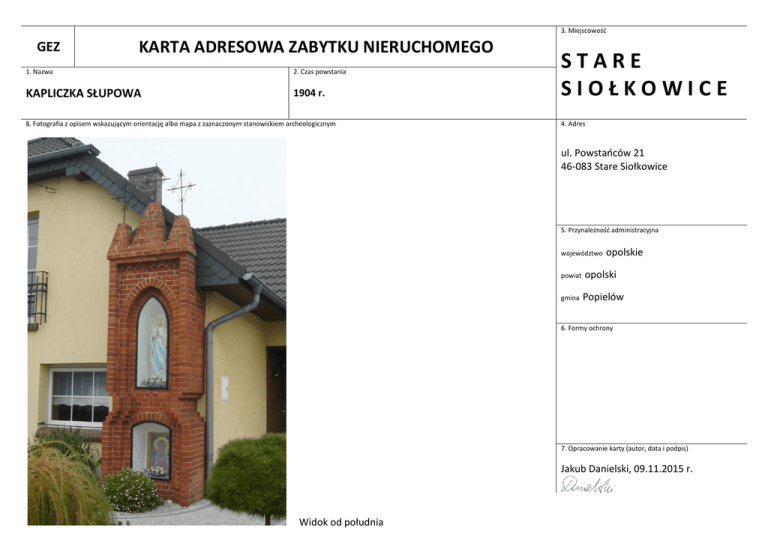3. Miejscowość GEZ KARTA ADRESOWA ZABYTKU NIERUCHOMEGO 1. Nazwa 2. Czas powstania KAPLICZKA SŁUPOWA 1904 r. 8. Fotografia z opisem wskazującym orientację albo mapa z zaznaczonym stanowiskiem archeologicznym STARE SIOŁKOWICE 4. Adres ul. Powstańców 21 46-083 Stare Siołkowice 5. Przynależność administracyjna województwo opolskie powiat opolski gmina Popielów 6. Formy ochrony 7. Opracowanie karty (autor, data i podpis) Jakub Danielski, 09.11.2015 r. Widok od południa 9. Opis obiektu O cechach neogotyckich, ufundowana w 1904 r. Zagroda usytuowana we wsch. części wsi, po płn. stronie ul. Powstańców. Kapliczka przyległa do elewacji frontowej współcześnie przebudowanego budynku mieszkalnego. Murowana z cegły prasowanej, z zewnątrz nietynkowana. Na planie prostokąta dwukondygnacyjna, z charakterystycznym przewężeniem między obu poziomami. Od frontu na dolnym poziomie głęboka wnęka zamknięta odcinkowo z współczesnym obrazem Matki Boskiej Częstochowskiej. Powyżej ostrołuczna nisza z figurą NMP. W zwieńczeniu elewacji frontowej trzy sterczyny w kształcie piramidek. Na każdej z nich żelazny krzyż. Ochronie konserwatorskiej podlega bryła obiektu oraz forma elewacji.