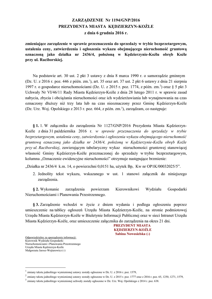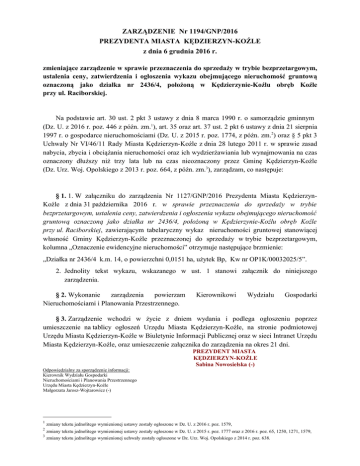 ZARZĄDZENIE Nr 1194/GNP/2016 PREZYDENTA MIASTA KĘDZIERZYN-KOŹLE z dnia 6 grudnia 2016 r. zmieniające zarządzenie w sprawie przeznaczenia do sprzedaży w trybie bezprzetargowym, ustalenia ceny, zatwierdzenia i ogłoszenia wykazu obejmującego nieruchomość gruntową oznaczoną jako działka nr 2436/4, położoną w Kędzierzynie-Koźlu obręb Koźle przy ul. Raciborskiej. Na podstawie art. 30 ust. 2 pkt 3 ustawy z dnia 8 marca 1990 r. o samorządzie gminnym (Dz. U. z 2016 r. poz. 446 z późn. zm.1), art. 35 oraz art. 37 ust. 2 pkt 6 ustawy z dnia 21 sierpnia 1997 r. o gospodarce nieruchomościami (Dz. U. z 2015 r. poz. 1774, z późn. zm.2) oraz § 5 pkt 3 Uchwały Nr VI/46/11 Rady Miasta Kędzierzyn-Koźle z dnia 28 lutego 2011 r. w sprawie zasad nabycia, zbycia i obciążania nieruchomości oraz ich wydzierżawiania lub wynajmowania na czas oznaczony dłuższy niż trzy lata lub na czas nieoznaczony przez Gminę Kędzierzyn-Koźle (Dz. Urz. Woj. Opolskiego z 2013 r. poz. 664, z późn. zm.3), zarządzam, co następuje: § 1. 1. W załączniku do zarządzenia Nr 1127/GNP/2016 Prezydenta Miasta KędzierzynKoźle z dnia 31 października 2016 r. w sprawie przeznaczenia do sprzedaży w trybie bezprzetargowym, ustalenia ceny, zatwierdzenia i ogłoszenia wykazu obejmującego nieruchomość gruntową oznaczoną jako działka nr 2436/4, położoną w Kędzierzynie-Koźlu obręb Koźle przy ul. Raciborskiej, zawierającym tabelaryczny wykaz nieruchomości gruntowej stanowiącej własność Gminy Kędzierzyn-Koźle przeznaczonej do sprzedaży w trybie bezprzetargowym, kolumna „Oznaczenie ewidencyjne nieruchomości” otrzymuje następujące brzmienie: „Działka nr 2436/4 k.m. 14, o powierzchni 0,0151 ha, użytek Bp, Kw nr OP1K/00032025/5”. 2. Jednolity tekst wykazu, wskazanego w ust. 1 stanowi załącznik do niniejszego zarządzenia. § 2. Wykonanie zarządzenia powierzam Nieruchomościami i Planowania Przestrzennego. Kierownikowi Wydziału Gospodarki § 3. Zarządzenie wchodzi w życie z dniem wydania i podlega ogłoszeniu poprzez umieszczenie na tablicy ogłoszeń Urzędu Miasta Kędzierzyn-Koźle, na stronie podmiotowej Urzędu Miasta Kędzierzyn-Koźle w Biuletynie Informacji Publicznej oraz w sieci Intranet Urzędu Miasta Kędzierzyn-Koźle, oraz umieszczenie załącznika do zarządzenia na okres 21 dni. PREZYDENT MIASTA KĘDZIERZYN-KOŹLE Sabina Nowosielska (-) Odpowiedzialny za sporządzenie informacji: Kierownik Wydziału Gospodarki Nieruchomościami i Planowania Przestrzennego Urzędu Miasta Kędzierzyn-Koźle Małgorzata Jarosz-Wojtarowicz (-) 1 zmiany tekstu jednolitego wymienionej ustawy zostały ogłoszone w Dz. U. z 2016 r. poz. 1579, 2 zmiany tekstu jednolitego wymienionej ustawy zostały ogłoszone w Dz. U. z 2015 r. poz. 1777 oraz z 2016 r. poz. 65, 1250, 1271, 1579, zmiany tekstu jednolitego wymienionej uchwały zostały ogłoszone w Dz. Urz. Woj. Opolskiego z 2014 r. poz. 638. 3 Załącznik do zarządzenia Prezydenta Miasta Nr 1194/GNP/2016 z dnia 6 grudnia 2016 r. Wywieszono dnia ....................................................... do dnia ....................................................... W Y K A Z nieruchomości gruntowej stanowiącej własność Gminy Kędzierzyn-Koźle przeznaczonej do sprzedaży w trybie bezprzetargowym. Na podstawie art. 35 ustawy z dnia 21 sierpnia 1997 r. o gospodarce nieruchomościami (Dz. U. z 2015 r. poz. 1774 z późniejszymi zmianami4) podaje się do publicznej wiadomości, że przeznacza się do sprzedaży niżej wymienioną nieruchomość: Położenie nieruchomości obręb/ulica ul. Raciborska obręb ewidencyjny Koźle Oznaczenie ewidencyjne nieruchomości Opis nieruchomości działka nr 2436/4 k.m. 14, o powierzchni 0,0151 ha, użytek Bp Kw nr OP1K/00032025/5 Nieruchomość gruntowa niezabudowana, o kształcie prostokąta. Działka na granicy bezpośredniego zagrożenia powodzią, położona na międzywalu. Przeznaczenie nieruchomości zgodnie z planem zagospodarowania przestrzennego miasta Cena nieruchomości w złotych * (bez podatku VAT) Tryb zbycia Forma zbycia 1.200,00 zł * Bezprzetargowy – zbycie na poprawienie warunków zagospodarowania nieruchomości przyległej, składającej się z działek nr 2334/7 i 2364/13 o łącznej powierzchni 0,0629 ha, k.m. 14 Kw nr OP1K/00034820/2 własność RP – tereny produkcji rolnej MNU – tereny zabudowy mieszkaniowej jednorodzinnej i usług nieuciążliwych * do ceny nieruchomości doliczony zostanie podatek VAT wg stawki procentowej obowiązującej w dniu sprzedaży nieruchomości Niniejszy wykaz podaje się do publicznej wiadomości na okres 21 dni. Osoby, którym w odniesieniu do nieruchomości gruntowej wymienionej w wykazie przysługuje roszczenie w jej nabyciu na podstawie ustawy o gospodarce nieruchomościami lub odrębnych przepisów, winne złożyć stosowny wniosek w terminie 6 tygodni, licząc od dnia wywieszenia wykazu. PREZYDENT MIASTA KĘDZIERZYN-KOŹLE Sabina Nowosielska (-) Odpowiedzialny za sporządzenie informacji: Kierownik Wydziału Gospodarki Nieruchomościami i Planowania Przestrzennego Urzędu Miasta Kędzierzyn-Koźle Małgorzata Jarosz-Wojtarowicz (-) 4 zmiany tekstu jednolitego wymienionej ustawy zostały ogłoszone w Dz. U. z 2015 r. poz. 1777 oraz z 2016 r. poz. 65, 1250, 1271, 1579.