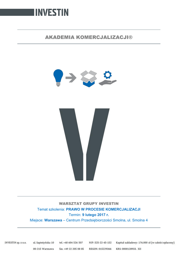 AKADEMIA KOMERCJALIZACJI® WARSZTAT GRUPY INVESTIN Temat szkolenia: PRAWO W PROCESIE KOMERCJALIZACJI Termin: 9 lutego 2017 r. Miejsce: Warszawa – Centrum Przedsiębiorczości Smolna, ul. Smolna 4 PRAWO W PROCESIE KOMERCJALIZACJI Komercjalizacja pośrednia i bezpośrednia – stosowane praktyki prawne Praktyczne znaczenie najczęściej spotykanych postanowień i klauzul Ścieżki komercjalizacji, najciekawsze studia przypadku z polskiego rynku Termin 9 lutego 2017 r., godz. 10:00 – 17:00 Miejsce Warszawa, Centrum Przedsiębiorczości Smolna Zakres tematyczny 1. Komercjalizacja pośrednia i bezpośrednia – stosowane praktyki prawne: a) kluczowe problemy prawne i mechanizmy w trakcie komercjalizacji pośredniej i bezpośredniej, b) proces komercjalizacji z punktu widzenia pozyskiwania inwestora, c) struktury prawne i decyzyjne podmiotów niekomercyjnych biorących udział w komercjalizacji (np. uczelni wyższych). 2. Praktyczne znaczenie najczęściej spotykanych postanowień i klauzul: a) umowy (m.in. kontrakty badawcze) oraz najistotniejsze zapisy, b) rodzaje umów związanych z transferem technologii na konkretnych przykładach, c) ustalanie treści umowy inwestycyjnej. 3. Ścieżki komercjalizacji, najciekawsze studia przypadku z polskiego rynku: a) zasady dotyczące zakładania spółek celowych, b) różnice między spółkami typu spin-off/spin-out oraz ich rola w procesie pozyskania kapitału. Certyfikat Po ukończeniu warsztatów uczestnicy otrzymują certyfikat, potwierdzający zdobyte kompetencje w obszarze komercjalizacji technologii. Metodologia Zajęcia prowadzone są w grupach liczących minimalnie 7 a maksymalnie 15 osób i ukierunkowane są na budowanie relacji biznesowych. Wszystkie treści przekazywane są w oparciu o przykłady konkretnych projektów zaczerpniętych z doświadczenia trenera i Grupy INVESTIN. © 2017 INVESTIN Sp. z o.o. Wszystkie prawa zastrzeżone. 2 Trener Aleksandra Pióro – Prawo w Procesie Komercjalizacji Partner Zarządzający w IP Legal Business & Tax Adwokaci i Radcowie Prawni. Ukończyła z wyróżnieniem Wydział Prawa i Administracji Uniwersytetu Warszawskiego. Stypendystka Programu Socrates Erasmus oraz Goethe Institut Inter Nationes w Berlinie. Absolwentka Uniwersytetu Regensburg oraz Szkoły Prawa Niemieckiego i Europejskiego na Uniwersytecie Warszawskim i Uniwersytecie w Bonn (dyplom z wyróżnieniem). W 2003 r. odbyła kurs prawa rosyjskiego na Uniwersytecie im. Lomonosova w Moskwie. Absolwentka Centrum Praw Własności Intelektualnej im. Hugona Grocjusza w Krakowie. Od 2010 r. radca prawny, członek Okręgowej Izby Radców Prawnych w Warszawie. Przez lata związana z międzynarodowymi kancelariami w Warszawie i Berlinie obsługującymi kompleksowo podmioty gospodarcze. W okresie ostatnich czterech lat dyrektor działów prawnych – w tym w spółkach działających w ramach międzynarodowych grup kapitałowych. Specjalizuje się w prawie własności intelektualnej, w szczególności prawie autorskim (doradzała m. in. Stowarzyszeniu Żydowski Instytut Historyczny/Muzeum Historii Żydów Polskich przy tworzeniu Wystawy Głównej), prawie korporacyjnym, prawie gospodarczym, prawie procesowym oraz prawie zwalczania nieuczciwej konkurencji. Posiada ponad dziesięcioletnie doświadczenie zawodowe, w tym z zakresu polsko-niemieckiego i polskoaustriackiego obrotu prawnego i biznesowego. Obsługuje polskie i zagraniczne podmioty gospodarcze działające w różnych sektorach z Polski, Niemiec, Austrii, Francji, Holandii, Australii, USA i Izraela. Odbiorcy Akademia Komercjalizacji® to program dedykowany następującym grupom osób, odpowiadającym za generowanie i/lub wdrażanie innowacji technologicznych: właściciele, kadra kierownicza, menedżerowie, specjaliści, pomysłodawcy. © 2017 INVESTIN Sp. z o.o. Wszystkie prawa zastrzeżone. 3 Grupa INVESTIN Grupa INVESTIN od ponad 14 lat rozwija i finansuje zaawansowane technologie, poprzez inwestycje Venture Capital, programy akceleracji start-up’ów oraz wszechstronne doradztwo w obszarze globalnego rynku innowacji. Koszt uczestnictwa CENA: 599 PLN + 23% VAT Istnieje możliwość uzyskania rabatu przy uczestnictwie kilku osób z tej samej firmy/instytucji. Cena obejmuje: uczestnictwo w zajęciach, materiały szkoleniowe, przerwy kawowe, lunch, certyfikat. Zgłoś się! O uczestnictwie w warsztatach decyduje kolejność zgłoszeń. Osoby zainteresowane udziałem prosimy o niezwłoczne przesłanie formularza zgłoszeniowego na adres [email protected]. Ostateczny termin przyjmowania zgłoszeń to 7 lutego 2017 r. Zapraszamy do kontaktu: Katarzyna Michalska Menedżer ds. Rozwoju i Komunikacji [email protected] +48 606 245 499 © 2017 INVESTIN Sp. z o.o. Wszystkie prawa zastrzeżone. 4