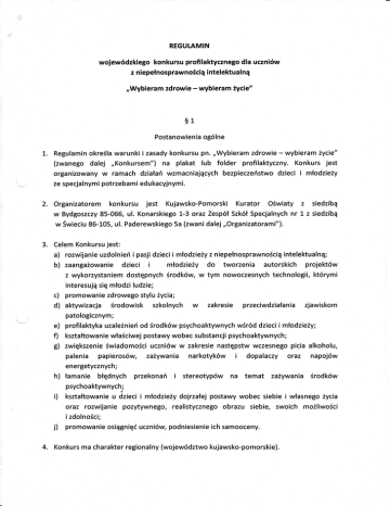 REGULAMIN wojewódzkiego konkursu profiIaktycznegod la uczniów intelektualnq z niepe|nosprawnościę ,,Wybieramzdrowie- wybieramŻycie,, 5r ogólne Postanowienia warunki i zasady konkursupn. ,,Wybieramzdrowie - wybieram Życie,, 1. Regulaminokreś|a (zwanego dalej ,,Konkursem")na plakat lub folder profilaktyczny.Konkurs jest organizowanyW ramach działań wzmacniajqcychbezpieczeństwo dzieci i młodzieży ze specjalnymipotrzebamiedukacyjnymi. f. organizatorem konkursu jest Kujawsko-PomorskiKurator oświaty z siedzibq nr 1 z siedzibq w Bydgoszczy 85-066,u|.KonarskiegoL-3 orazZespótSzkółSpecja|nych 5a (zwanida|ej,,organizatorami,,). w Świeciu86.].05,u|.Paderewskiego J jest: 3. CelemKonkursu inte|ektuaInq; z niepetnosprawnościq i pasjidziecii młodzieży uzdo|nień a) rozwijanie mtodzieży do tworzenia autorskich projektów b) zaangażowaniedzieci i którymi w tym nowoczesnych techno|ogii, z wykorzystaniem dostępnychśrodków, interesujq sięmtodziIudzie; c) promowaniezdrowegosty|uŻYcia; d) aktywizacja środowisk szkoInych W zakresie przeciwdziałaniazjawiskom patologicznym; psychoaktywnych wśróddziecii młodzieży; uza|eżnień od środków e) profilaktyka postawywobecsubstancjipsychoaktywnych; wtaściwej f) ksztattowanie g) zwiększenie świadomości ucznióww zakresienastępstwwczesnegopiciaa|koholu, palenia papierosów, zażywania narkotyków i dopa|aczy oraz napojów energetycznych; h) łamanie btędnych przekonań i stereotypów na temat zażywaniaśrodków psychoaktywnych; dojrzatejpostawywobec siebiei wtasnegożycia i) ksztattowanie u dziecii młodzieży obrazu siebie, swoich możliwości oraz rozwijaniepozwywnego,reaIistycznego i zdoIności; j) promowanie ichsamooceny. osiqgnięć uczniów,podniesienie (województwo 4. Konkursma charakterregiona|ny kujawsko-pomorskie). s2 Uczestnicy placówekoświatowych L, Uczestnikami KonkursumogqbyćuczniowienastępujQcych z podziatemna kategoriewiekowe: województwakujawsko-pomorskiego, a) b) c) d) e) pierwszakategoria: uczniowieklasl- lll szkotypodstawowej; drugakategoria: uczniowiek|as|V- V| szkoĘpodstawowej; uczniowie szkótgimnazjalnych; trzeciakategoria: : uczniowiezespotówedukacyjno-terapeutycznych; czwartakategoria piqta kategoria:uczniowieszkót ponadgimnazja|nych oraz szkółprzysposabiajqcych do pracy. jest reprezentowana przezmaksymaInie 2 . P|acówkaoświatowa biorqcaudziałw Konkursie trzech uczestnikówz danegotypu szkoły|ub/i p|acówki.Każdyuczestnikmusi mieć opiekuna.opiekun będzie sprawowałnadzór nad uczniami.W przypadkuosób niepetnoletnich, biorqcychudziat W Konkursie,wymaganajest zgoda i podpis prawnego,które naleiy zhoŻyć na oświadczeniu rodzica/opiekuna rodzica/opiekuna prawnego, Regulaminu. załęcznik nr 1do niniejszego stanowiqcym 9g Zgłoszenia w formie plakatu|ub fo|deru L . Praca konkursowama być wykonanaindywidualnie, profilaktycznego, świadomości dzieci w dowo|nej technicei ma miećna celuzwiększanie ptynqcych psychoaktywnych, z używania środków ale też i młodzieży w zakresiezagroŻeń wtasnymzdrowiemi rozwojemoraz ksztaftowania do rozbudzeniaich zainteresowania poczuciaodpowiedziaIności zdrowieswojei innych. za bezpieczeństwo, 2 . Placówki oświatowedostarczajqorganizatoromdo 1 lutego 2ot6 r. osobiście poczty (liczysię data stemp|apocztowego)opisane (zgodnie lub za pośrednictwem wymienione Regulaminu) materiaty, z Wzoremstanowiqiymzałącznik nr 2 do niniejszego stanowlqcymzałqczniknr 3 W ustępie L, Wraz z formularzemzgtoszeniowym, na następujqcy adres: Regu|aminu do niniejszego nr ].w Świeciu ZespótSzkółSpecjalnych 86-1o5Świecie, 5a ul.Paderewskiego te|./fax:(052)33 300 86, z dopiskiem,,Wybieramzdrowie- wybieramżycie,,. 5ą Terminy prackonkursowych do 1tutego2ot6r.(ticzysiędatastemp|a L. Dostarczenie musinastqpić pocztowego). w BydgoszczY orazZespotu oświaty 2. ogtoszeniewynikówKonkursuna stronieKuratorium nr 1 w Świeciunastqpido 9 |utego2016r. SzkótSpecjalnych .v 3. Wręczenienagródnastqpi19lutego2oL6r.,w ha|isportowo-Widowiskowej,,Łuczniczka,, w Bydgoszczy, u|.Toruńska59. Laureacikonkursuwrazz opiekunamidostanqimienne konkurs,wystanena adresszkołylub placówk! na spotkaniepodsumowujące zaproszenie (załącznlk nr 3 do niniejszego Regulaminu) zgłoszeniowym wskazanyw formu|arzu 4. organizatorzy zastrzegajq sobieprawodo zmianyw/w terminów. 9s KomisjaKonkursowa 1. ZwycięzcyKonkursuzostanqwytonieniw drodze oceny dokonywanejprzez Komisję powotan Konkursowq, Ą przezorganizatorów. +. 2. W sktadKomisjiKonkursowejwchodzi: organizatorów; a) czterechprzedstawicieIi z uznanymdorobkiem b) dwóchprzedstawicieli nauczycielidyplomowanych zawodowym, c) artystaplastyk. na podstawienastępujqcych 3. KomisjaKonkursowadokonujeoceny prac konkursowych kryteriów: pkt.); p|akatu|ubfo|deruz tematykqKonkursu(0-1.0 d) zgodność tematykiprzekazanego (0.1.0 pkt.); estetycznym forńryprzekazupod wzg|ędem e) atrakcyjność (0-10pkt.). f) atrakcyjność formyprzekazupod względemtechnicznym 5o Nagrody d|a każdego L. W konkursiezostanQprzyznanenagrodyi dyp|omy- indywidua|ne opiekunów prac konkursowych oraz dyp|omydla nauczycieli z autorównagrodzonych z którychpochodzqlaureaci. z p|acówekoświatowych, 2' Nagrody indywidualned|a |aureatów pierwszego,drugiego i trzeciego miejsca wiekowych: kategoriach r przyznaw następujqcych organizato a) b) c) d) e) pierwszakategoria: uczniowieklasl- lll szkotypodstawowej; uczniowiek|aslV - V| szkoĘpodstawowej; drugakategoria: uczniowieszkótgimnazjalnych; trzeciakategoria: a: uczniowiezespotówedukacyjno-terapeutycznych; czwarta kategori oraz szkółprzysposabiajqcych piqta kategoria:uczniowieszkót ponadgimnazjalnych do pracy. przyznanie przewiduje nagrodydodatkowej: 3. Organizator Kuratoraoświaty. Kujawsko-Pomorskiego a) NagrodySpecjaInej 19 |utego2016roku. 4. NagrodyzostanaWręczone|aureatom W przypadkugdy laureat ekwiwa|entpieniężny. 5. Za przyznanenagrodynie przystuguje możezrobićto opiekun|ubinny w jegozastępstwie nie możeod