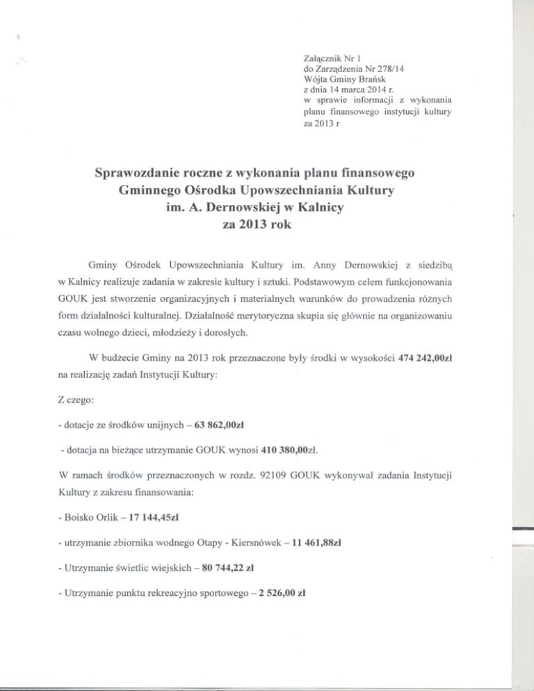 Zalacznik Nr l do Zarzadzenia Nr 278/14 Wójta Gminy Bransk z dnia 14 marca 2014 r. w sprawie informacji z wykonania planu finansowego instytucji kultury za 2013 r Sprawozdanie roczne z wykonania planu finansowego Gminnego Osrodka Upowszechniania Kultury im. A. Dernowskiej w Kalnicy za 2013 rok Gminy Osrodek Upowszechniania Kultury im. Anny Dernowskiej z siedziba w Kalnicy realizuje zadania w zakresie kultury i sztuki. Podstawowym celem funkcjonowania GOUK jest stworzenie organizacyjnych i matenalnych warunków do prowadzenia róznych form dzialalnosci kulturalnej. Dzialalnosc merytoryczna skupia sie glównie na organizowaniu czasu wolnego dzieci, mlodziezy i doroslych. W budzecie Gminy na 2013 rok przeznaczone byly srodki w wysokosci 474 242,00zl na realizacje zadan Instytucji Kultury: Z czego: - dotacje ze srodków unijnych - 63 862,00zl - dotacja na biezace utrzymanie GOUK wynosi 410 380,00zl. W ramach srodków przeznaczonych w rozdz. 92109 GOUK wykonywal zadania Instytucji Kultury z zakresu finansowania: -Boisko Orlik -17 - 144,45zl -utrzymanie zbiornika wodnego Otapy -Kiersnówek -11 -Utrzymanie swietlic wiejskich - 461,88zl 80744,22 zl - Utrzymanie punktu rekreacyjno sportowego - 2 526,00 zl - biezace funkcjonowanie Gminnego Osrodka Upowszechniania Kultury w Kalnicy - 284288,76 zl GOUK osiagnal równiez dochody wlasne z uslug w wysokosci - 22 692,90zl. - wynajem sali konferencyjnej w GOUK na szkolenia oraz imprezy okolicznosciowe -wynajem swietlic wiejskich na imprezy okolicznosciowe, prezentacje - wynajmowanie lódek oraz rowerów wodnych i kajaków nad Zbiornikiem Wodnym Otapy Kiersnówek Realizacia Dlanu finansowe2o instvtucii kulturv Dochodv Dz. Rozdz. Zadanie § Plan Wykonanie % wykonania 921 92109 Domy i osrodki kultury, swietlice i kluby 921 92109 0830 Wplywy z uslug 921 92109 2480 Dotacja podmiotowa z budzetu otrzymana przez samorzadowa instytucje kultury 474 242,00 25 000,00 422 184,10 6599,65 89,02 26,40 375580,00 375 580,00 0,00 445,14 9 800,00 11 700,00 119,39 921 92109 0970 Wplywy z róznych dochodów 0,00 3 948,11 0,00 921 92109 2487 Dotacja podm. Dla. Inst. Kult. 20 496,00 15 552,00 75,88 921 92109 2489 Dotacja podm. Dla. Inst. Kult. 43 366,00 8 359,20 19,28 921 92109 0920 Odsetki na rachunki 921 92109 0960 darowizny § 0830 Wplywy z uslug: -za wynajem swietlic wiejskich oraz Sali GOUK w Kalnicy - 4 882,56zl -za koncert zespoly ludowego Patoczanka -1750,00zl 100,00 0,00 - § 0970 -za wynajem lódek, kajaków i rowerów wodnych -1 415,00zl -za promocje zespolu Ludowego Mianka podczas Uroczystosci 500lecia Woj. Podlaskiego2 500,00zl § 0960 Darowizny: -darowizny na Festyn Rodzinny oraz Festyn Rolnika i Przedsiebiorcy polaczony z dozynkami - 11 700,00zl § 0920 -odsetki na rachunki -445,I4zl DOCHODY § 2487 Zwrot srodków unijnych na realizacje zadania " Wzbogacenie oferty kulturalnej Gminnego Osrodka Upowszechniania Kultury w Kalnicy poprzez zakup krzesel oraz zakup stolów i krzesel do swietlic wiejskich w miejscowosci Poletyly, Kiersnowo, Kadlubówka" - 15 552,20zl § 2489 Zwrot srodków unijnych na realizacje zadania " Wzbogacenie oferty kulturalnej Gminnego Osrodka Upowszechniania Kultury w Kalnicy poprzez zakup krzesel oraz zakup stolów i krzesel do swietlic wiejskich w miejscowosci Poletyly, Kiersnowo, Kadlubówka" - 8 359,20 zl Rozchodv § Zadanie Plan Wykonanie % wykonania Domy i osrodki kultury, swietlice i kluby 3020 Wydatki osobowe niezaliczone do wynagrodzen 474242,00 396 162,31 89,02 1 879,00 1 848,27 98,36 - L. 4010 Wynagrodzenia osobowe pracowników 73367,00 73366,78 100 4110 Skladki na ubezpieczenie spoleczne 11 782,00 11 781,18 99,99 4120 Skladki na fundusz pracy 1 649,00 1648,77 99,99 4170 Wynagrodzenia bezosobowe pracowników 23 800,00 23 526,00 98,85 4210 Zakup materialów i wyposazenia 132 942,00 132941,22 100,00 4217 Zakup materialów i wyposazenia 20 496,00 13 608,00 66,39 4219 Zakup materialów i wyposazenia 13 516,00 10303,20 76,23 4260 Zakup energii 23 176,00 20757,11 89,56 39 296,00 7 828,53 19,92 450 405 90,00 27 885,00 22731,54 81,52 4270* Zakup uslug remontowych 4280 Zakup uslug zdrowotnych 4300* Zakup uslug pozostalych 4350 Zakup uslug dostepu do sieci Internet 2 750,00 2 646,89 96,25 4370 Oplaty z tytulu zakupu uslug telekomun. telefonii stacjonarnej 2 896,00 2618,73 90,43 4410 Podróze sluzbowe krajowe 600,00 235,68 39,28 4430 Rózne oplaty i skladki 56 030,00 28 680,00 51,19 4440 Odpisy na ZFSS 3 993,00 3 993,00 100 4480 Podatek od nieruchomosci 16 135,00 100,00 20 500,00 20 372,00 99,38 16 135,00 I 4500 Pozostale podatki na rzecz budzetów jst 4700 Szkolenia pracowników 300,00 190,00 63,33 4360 Oplaty za Uslugi Tel. Kom. 800,00 545,41 68,18 - W ramach rozdzialu 92109 - finansowane byly nastepujace zadania: -biezace utrzymanie GOUK - 287508,14 zl -biezace utrzymanie boiska "Orlik 2012" - 17 144,45zl -biezace utrzymanie zbiornika wodnego" Otapy - Kiersnówek" -biezace utrzymanie swietlic wiejskich -56 939,53zl -biezace utrzymanie punktu rekreacyjno sportowego - 2 526,00zl 11 461,88zl § 4270 Zakup uslug remontowych -7 828,53 zl.: . Szalówka plaska sosna - remont swietlicy wiejskiej w miejscowosci Zaluskie Koscielne - 7 828.53 zl § 4210 Zakup materialów i wyposazenia: 132941,22 zl . W ramach paragrafu poniesiono wydatki na: - kwiaty - 889,40 zl -nagrody - 4 862,29 zl - art. chemii gospodarczej - 1 190,75 zl - Art.przemyslowe- 2053,41 zl - art.spozywcze- 17401, 85zl -paliwo do samochodu sluzbowego UAZ -olej opalowy - 13 383,92 zl -rolety - 1555,05 zl -parawan - 286,05 zl 6 966,65zl -biurko- 500,00zl -kosmetyki i banki do masazu - 184,90 zl -zakup kajaków, kamizelek ratunkowych i wiosel nad Zbiornik Wodny Otapy - Kiersnówek, do wypozyczania mieszkancom Gminy Bransk - 5 778,98 zl - - instrumenty muzyczne zakupione w celu prowadzenia warsztatów muzycznych -3 100,00zl - art. biurowe - 1 884,67 zl - art. na warsztaty z dziecmi - 1 430,44 -znaczki pocztowe - 141,50 zl -zakup telefonu komórkowego - 60,27zl -zakup ksiazek (500lecie Woj. 