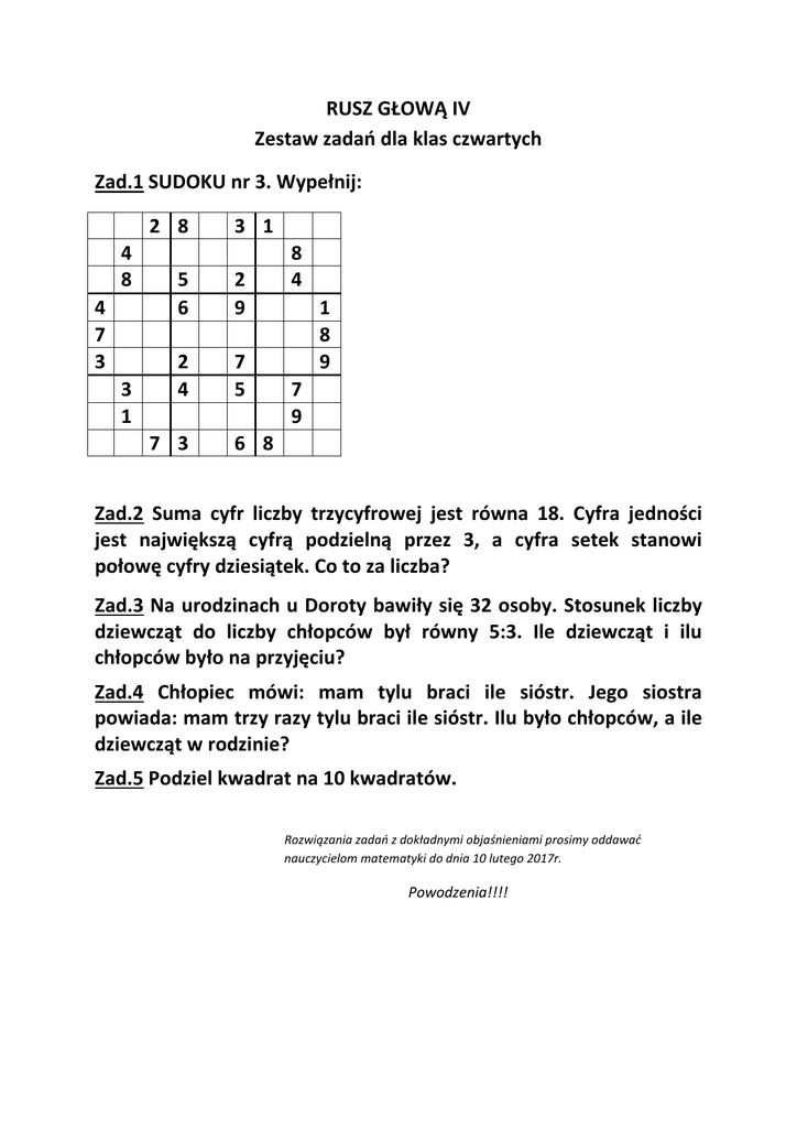 RUSZ GŁOWĄ IV Zestaw zadań dla klas czwartych Zad.1 SUDOKU