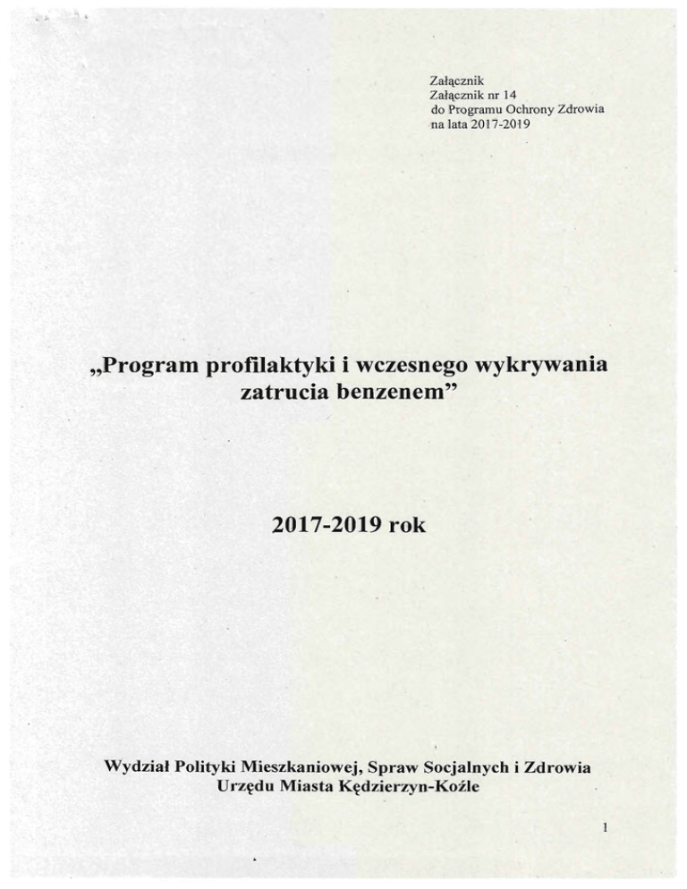 Załącznik Załącznik nr 14 . do Programu Ochrony Zdrowia ·na lata 2017-20 ł 9 "Program profilaktyki i wczesnego wykrywania zatrucia benzenem" / 2017-2019 rok W'ydzial Polityki Mieszkaniowej, Spraw Socjalnych i Zdrowia Urzędu Miasta Kędzierzyn-Koźle l 1. Opis problemu zdrowotnego a) Problem zdrowotny Benzen jest jednym z najbardziej rozpowszechnionych związków órganicznych. Jest procesach alkalizacji otrzymywany z ropy naftowej podczas katalitycznego reformingu, i odwodornienia pochodnych benzenu, a także podczas cyklizacji i aromatyzacji węglowodorów parafinowych. Benzen znajduje zastosowanie w przemyśle chemicznym jako produkt wyjściowy w syntezie organicznej. Stanowi wysokoenergetyczny składnik benzyny silnikowej. Benzen wchłania się głównie w postaci,par drogą oddechową, a ciekły benzen jest wchłaniany przez skórę. U ludzi ostre zatrucia benzenem o dużych stężeniach (od 10000 do 65 200 mg/m3 przez 5 -:- 10 min) prowadzą do śmierci , poprzedzonej objawami narkotycznymi, arytmią i zaburzeniem oddychania. Po długotrwałym działaniu par benzenu o małych stężeniach zaznacza się wpływ związku na krew i narządy krwiotwórcze. W zaawansowanych przypadkach dochodzi do znacznego zmniejszenia liczby wszystkich elementów morfotyćznych - pancytopenii, często poprzedzającej wystąpienie białaczki. Przewlekła, długotrwała ekspozycja na benzen, na którą narażeni są ze względu ' na wszelkiego rodzaju zanieczyszczenia, mieszkańcy Kędzierzyna-Koźla, może prowadzić do powolnego, toksycznego uszkodzenia układu krwiotwórczego (szpiku). Skutkiem tego , może być niewydolność tego układu w zakresie produkcji 'krwinek tam wytwarzanych (krwinek czerwonych, białych oraz płytek krwi) lub ich nadprodukcja. Jednostkami chorobowymi związanymi z zaburzeniami pracy szpiku są między innymi: pancytopenia, aplażja, małopłytkowość lub różnego rodzaju białaczki. U osób narażonych na benzen ' występowanie białaczek zostało potwierdzone na podstawie wyników badań epidemiologicznych, które pozwalają uznać benzen za czynnik kancerogenny dla układu krwiotwórczego i chłonnego człowieka. Obserwuje się ostrą białaczkę szpikową, przewlekłą białac~kę szpikową i limfatyczną oraz szpiczaka mnogiego. . Benzen jest uznany za związek rakotwórczy dla ludzi w większości' państw europejskich. W ustawodawstwie polskim związek ten umieszczono w wykazie substancji o udowodnionym działaniu rakotwórczym dla ludzi, a także w wykazie prac wzbronionych pracownikom młodocianym i kobietom w ciąży. Benzen jest zamieszczony w wykazie substancji niebezpiecznych w rozporządzeniu ministra zdrowia i opieki społecznej z dnia 21.08.1997 r. w sprawie substancji chemicznych, stwarzających zagrożenie dla zdrowia lub życia (Dz. U nr 105, poz. 671). Jest klasyfikowany jako substancja toksyczna i wysoce łatwo palna. Działa także toksycznie w razie narażenia drogą oddechową i kontaktu ze skórą oraz po spożyciu, stwarza poważne zagrożenie zdrowia w następstwie narażenia długotrwałego. w' b) Epidemiologia ' Narażenie zawodowe na benzen w Polsce występuje w zakładach produkujących i wykorzystujących ten związek oraz wszędzie tam, gdZIe są stosowane różne związki chemiczne, w których benzen występuje jako jeden ze składników. Jednym ze źródłem narażenia zawodowego jest przemysł chemiczny, ale także zanieczyszczenia antropogeniczne, czyli ,spowodowane przez działalność ludzi. Są to między innymi dymy z kominów domów i fabryk, spaliny samochodowe oraz rolnictwo. Często te zanieczyszczenia sięgają wysokiego poziomu i są niebezpieczne. Liczbę osób potencjalnie narażonych zawodowo na benzen w Polsce ocenia się na około 8.000. Uważa się , że liczba ta jest zaniżona. , ' Narażenie na benzen jest skutkiem rozpowszechnienia tego związku w środowisku ' naturalnym. Szacuje się, że ponad 75% populacji ogólnej pracuje w narażeniu na benze~ ~ 2 zawarty w powietrzu atmosferycznym, a jednym ze źródłem narażęnia są zakłady przemysłowe emitujące benz~n, pary benzyny i spaliny samochodowe. Benzen jest jedną z najgroźniejszycl1 trucizn przemysłowych, ze względu na dużą jego lotność i możliwość tworzenia dużych stężeń w powietrzu. Szczególnie niebezpieczne są wszelkie procesy o dużej powierzchni parowania, a niewielkiej możliwości hermetyzacji. Zatrucia ostre są zwykle wynikiem wypadków (uwolnienie benzenu) lub jego złego użycia. , W obrazie klinicznym ostrego zatrucia dominują, w zależności od wielkości stężenia, objawy prenarkotyczne lub narkotyczne. Po narażeniu na związek o bardzo dużym stężeniu w początkowym okresie obserwuje się: euforię, pobudzenie psychoruchowe, drżenia mięśniowe', . bóle i zawroty głowy, a następnie zamroczenie, utratę świadomości, zaburzenia oddechu i krążenia (migotanie komór) prowadzące do zgonu. W lżejszych przypadkach zatruć obserwowano euforię, bóle i zawroty głowy, przyspieszenie czynności serca, zaburzenia rytmu serca, nudności , wymioty oraz przemijające objawy ' podrażnienia spojówek i błon śluzowyclLgórnych dróg oddechowych. Szybkość rekonwalescencji zależy od poziomu i czasu trwania narażenia. Następstwem zatruć o ciężkim przebiegu mogą być zaburzenia psychiczne i uszkodzenie ośrodkowego układu nerwowego (patologiczne zapisy w badaniu dektroencefalograficznym). Cofanie się zmian następuje w miarę poprawy stanu klinicznego. W lżejszych postaciach zatruć objawy neurologiczne ustępują z reguły bez odległych następstw, natomiast mogą ujawnić się zmiany w obrazie morfologicznym krwi obwodowef Na podstawie wyników badań sekcyjnych osób zmarłych wskutek ostrego zatrucia benzenem ~ wykazano stany zapalne w tchawicy i krtani, przekrwienie bierne w płucach i nerkach, obrzęk płuc i mózgu, zmiany martwicze w wątrobie i nerkach. Ciekły benzen działa drażniąco ną. skórę u