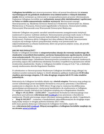 Collegium Invisibilie jest stowarzyszeniem, które od ponad dwudziestu lat zrzesza wyróżniających się polskich studentów oraz doktorantów z różnych dziedzin nauki, którzy wyłaniani są rokrocznie w wyspecjalizowanym procesie rekrutacyjnym. Zadaniem Collegium Invisibile jest wyłonienie nowej elity intelektualnej i społecznej w Polsce w dobie umasowienia studiów wyższych. Mecenasami naszego Stowarzyszenia są: Akademia Górniczo-Hutnicza w Krakowie; Uniwersytet im. Adama Mickiewicza w Poznaniu, Uniwersytet Jagielloński w Krakowie, Uniwersytet Łódzki, Uniwersytet Warszawski oraz Warszawski Uniwersytet Medyczny. Istnienie Collegium ma pomóc zaradzić umiarkowanemu zaangażowaniu instytucji naukowych w pomoc wybitnie zdolnym. Stowarzyszenie promuje mało znane w Polsce formy nauczania: tutorial (nauczanie indywidualne) i team-teaching (nauczanie drużynowe). Podstawą oferty Collegium jest idea edukacji liberalnej: pozostawianie uczącym się wolnego wyboru pozyskiwanej wiedzy oraz powierzanie im odpowiedzialności za własne kształcenie, które nie przynosi jedynie oceny, ale przede wszystkim satysfakcję. JAK DO NAS DOŁĄCZYĆ? Studia w Collegium Invisibile to niepowtarzalna okazja do rozwoju naukowego dla studentów wszystkich kierunków, zarówno humanistyczno-społecznych, ścisłych oraz artystycznych. Oferujemy możliwość rozwijania kompetencji naukowych oraz warsztatu badawczego. Członkowie Stowarzyszenia uczestniczą w obozach naukowych, prowadzą zajęcia dla uzdolnionej młodzieży licealnej i współtworzą dynamiczne młode środowisko akademickie. Studia w Collegium Invisibile trwają od 3 do 7 lat, a dokładne zasady studiowania określa Regulamin Studiów. O członkostwo w Stowarzyszeniu Naukowym Collegium Invisibile mogą ubiegać się studenci uczelni wyższych, będący w chwili składania aplikacji studentami II-III roku studiów pierwszego stopnia, I-II roku drugiego stopnia lub II-VI roku studiów jednolitych. Rekrutacja do Collegium Invisibile składa się z dwóch etapów. Pierwszy etap polega na ocenie nadesłanego przez kandydata formularza oraz pracy pisemnej o charakterze naukowym (o objętości do ok. 3500 słów). Drugi etap to rozmowa kwalifikacyjna, sprawdzająca predyspozycje i motywację kandydatów do studiowania w Collegium. Szczegółowe zasady rekrutacji do Collegium znajdują się w Regulaminie Studiów. Etap I: 19.12.2016 – 22.02.2017 – wypełnienie formularza rekrutacyjnego oraz przesłanie pod adresem rekrutacja [at] ci.edu.pl pracy pisemnej o charakterze naukowym. Wyniki pierwszego etapu rekrutacji zostaną podane po około 3 tygodniach. Etap II: 04.2017 – rozmowy z kandydatami zakwalifikowanymi do drugiego etapu będą miały miejsce w drugiej połowie kwietnia 2017 roku. Jeśli masz pytania dotyczące rekrutacji do Collegium Invisibile, napisz do nas: rekrutacja [at] ci.edu.pl. Więcej szczegółów o Collegium Invisibile znajduje się na stronie www.ci.edu.pl.