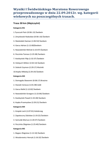 Wyniki I Świdwińskiego Maratonu Rowerowego przeprowadzonego w dniu 22.09.2012r. wg. kategorii wiekowych na poszczególnych trasach. Trasa 30 km (Mężczyźni) Kategoria M1 1.Tyszczuk Piotr (0:58::15) Świdwin 2. Zmysłowski Radosław (0:58::16) Świdwin 3. Niedziałek Damian (1:06:54) Świdwin 4. Garus Adrian (1:12:00)Świdwin 5. Nawodziński Michał (1:22:07) Świdwin 6. Peczinka Tomasz (1:25:38) Świdwin 7. Kwidzyński Filip (1:32:37) Świdwin 8. Hołojuch Wiktor (2:02:14) Świdwin 9. Sielecki Szymon (2:29:17) Kłośniki 10.Kopka Mikołaj (2:29:19) Świdwin Kategoria M3 1. Domagała Sławomir (0:58:17) Brzeżno 2. Stasiak Ireneusz (1:01:38) Łódź 3. Garus Rafał (1:12:02) Świdwin 4. Nawodziński Grzegorz (1:22:06) Świdwin 5. Kwidzyński Paweł (1:32:28) Świdwin 6. Kopka Przemysław (2:29:21) Świdwin Kategoria M4 1. Książek Lech (1:07:01) Kołobrzeg 2. Zapotoczny Zdzisław (1:19:22) Świdwin 3. Samulak Mariusz (1:20:37) Świdwin 4. Peczinka Zbigniew (1:25:40) Świdwin Kategoria M5 1. Bogacz Zbigniew (1:12:16) Świdwin 2. Wozdorewicz Henryk (1:16:32) Świdwin 3. Horanin Wincenty (1:25:04) Świdwin 4. Szawiel Czesław (1:32:10) Łobez Kategoria M6 1. Kołaczyk Julian (0:58:18) Białogard 2. Parka Ryszard (1:04:26) Białogard 3. Gbur Kazimierz (1:25:03) Świdwin 4. Konat Jerzy (1:25:27) Świdwin 5. Matwiejewski Jan (1:32:12) Świdwin Trasa 30 km (Kobiety) Kategoria K1 1. Krzeczkowska Katarzyna (1:08:55) Gryfice 2. Kruk Patrycja (2:09:38) Świdwin Kategoria K3 1. Kruk Joanna (2:09:42) Świdwin Kategoria K5 1. Bogacz Elżbieta (1:12:15) Świdwin 2. Lalak-Szawiel Lidia (1:32:08) Łobez Trasa 75 km (Mężczyźni) Kategoria M1 1. Piskorz Przemysław (2:37:39) Świdwin Kategoria M2 1. Kulikowski Michał (2:16:15) Szczecin 2. Witkowski Łukasz (2:41:01) Świdwin 3. Reński Dominik (2:58:15) Klępczewo 4. Chojnacki Kacper (3:15:36) Świdwin 5. Konczałowski Karol (3:22:07) Świdwin 6. Walter Eliasz (3:25:40) Łobez 7. Dawidowicz Radosław (3:27:07) Świdwin 8. Wołkowicz Kamil (3:55:25) Świdwin 9. Kaźmierski Radosław (5:06:36) Leszno Kategoria M3 1. Migalski Sebastian (2:23:16) Gryfice 2. Lewandowski Piotr (2:28:23) Myślibórz 3. Rabczuk Krzysztof (2:33:23) Bożęcino 4. Kowalik Marcin (2:44:41) Mierzyn 5. Kalbarczyk Paweł (3:04:40) Świdwin 6. Wawrzyniak Mariusz (3:04:52) Szczecin 7. Gola Jarosław (3:45:59) Myślibórz Kategoria M4 1. Mikołajczak Mariusz (2:27:11) Świebodzin 2. Tokarski Mariusz (2:28:15) Recz 3. Anglisz Henryk (2:43:53) Świdwin 4. Wierzbicki Andrzej (2:46:36) Świdwin 5. Sikora Krzysztof (2:48:56) Świdwin 6. Cieślak Tadeusz (2:53:15) Nowe Worowo Kategoria M5 1. Borysewicz Ryszard (2:20:35) Koszalin 2. Wierzbicki Janusz (2:28:17) Rąbino 3. Żabkiewicz Mirosław (2:48:08) Goleniów 4. Krzeczkowski Krzysztof (2:57:00) Gryfice 5. Kaczmarczyk Bogdan (3:07:40) Świdwin Kategoria M6 1. Napieraj Jan (2:28:22) Rąbino 2. Modliński Henryk (2:38:48) Gryfice 3. Sielecki Zbigniew (2:48:11) Białogard 4. Czekaj Kazimierz (3:28:32) Białogard Trasa 75 km (Kobiety) Kategoria K2 1. Żabkiewicz Kamila (2:43:16) Szczecin 2. Łazaruk Paulina (3:25:41) Łobez 3. Bućko Izabela (5:06:36) Łobez Kategoria K3 1. Lewandowska Aleksandra (3:46:01) Myślibórz Kategoria K4 1. Możdżyńska Hanna (3:59:20) Świdwin 2. Malinowska Małgorzata (4:25:17) Świdwin Trasa 120 km (Mężczyźni) Kategoria M2 1. Szatanek Bartłomiej (3:24:46) Stargard Szczeciński 2. Pietrzak Karol (3:24:55) Wałcz 3. Jasionowski Łukasz (3:33:20) Osówko 4. Weinar Wojciech (4:47:14) Świdwin 5. Sucharski Jakub (7:34:29) Łobez Kategoria M3 1. Duda Jarosław (7:34:25) Gryfice Kategoria M4 1. Walczak Eugeniusz (3:24:47) Łobez 2. Piotrowski Mirosław (4:42:00) Świdwin Kategoria M5 1. Junak Zbigniew (3:29:51) Choszczno 2. Dzwonnik Ryszard (4:00:37) Gryfice 3. Białek Waldemar (4:05:13) Świdwin 4. Witkowski Jerzy (4:07:04) Świdwin Trasa 120 km (Kobiety) Kategoria K4 1. Elwira Stawska (7:34:26) Łobez