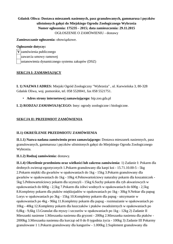 Gdańsk Oliwa: Dostawa mieszanek nasiennych, pasz granulowanych, gammarusa i pęczków ulistnionych gałęzi do Miejskiego Ogrodu Zoologicznego Wybrzeża Numer ogłoszenia: 175235 - 2015; data zamieszczenia: 29.11.2015 OGŁOSZENIE O ZAMÓWIENIU - dostawy Zamieszczanie ogłoszenia: obowiązkowe. Ogłoszenie dotyczy: V zamówienia publicznego zawarcia umowy ramowej ustanowienia dynamicznego systemu zakupów (DSZ) SEKCJA I: ZAMAWIAJĄCY I. 1) NAZWA I ADRES: Miejski Ogród Zoologiczny "Wybrzeża" , ul. Karwieńska 3, 80-328 Gdańsk Oliwa, woj. pomorskie, tel. 058 5520041, fax 058 5521751. • Adres strony internetowej zamawiającego: bip.zoo.gda.pl I. 2) RODZAJ ZAMAWIAJĄCEGO: Inny: ogrody zoologiczne i biologiczne. SEKCJA II: PRZEDMIOT ZAMÓWIENIA II.1) OKREŚLENIE PRZEDMIOTU ZAMÓWIENIA II.1.1) Nazwa nadana zamówieniu przez zamawiającego: Dostawa mieszanek nasiennych, pasz granulowanych, gammarusa i pęczków ulistnionych gałęzi do Miejskiego Ogrodu Zoologicznego Wybrzeża. II.1.2) Rodzaj zamówienia: dostawy. II.1.4) Określenie przedmiotu oraz wielkości lub zakresu zamówienia: 1) Zadanie I: Pokarm dla drobnych zwierząt egzotycznych 1.Pokarm granulowany dla karpi koi - 15.71.10.00-5 - 5kg 2.Pokarm miękki dla gwarków w opakowaniach do 1kg - 15kg 3.Pokarm granulowany dla gwarków w opakowaniach do 1kg - 10kg 4.Pełnowartościowy naturalny pokarm dla koszatniczek 5kg 5.Pełnowartościowy pokarm dla szynszyli - 15kg 6.Suchy pokarm dla ryb akwariowych w opakowaniach do 600g - 2,5kg 7.Pokarm dla żółwi wodnych w opakowaniach do 600g - 2,5kg 8.Kompletny pokarm dla ptaków miękkojadów w opakowaniach po 1kg - 30kg 9.Nektar dla papug Lorys w opakowaniach po 3kg - 15kg 10.Kompletny pokarm dla papug - utrzymanie w opakowaniach po 4kg - 96kg 11.Kompletny pokarm dla papug - rozmnażanie w opakowaniach po 10kg - 40kg 12.Kompletny pokarm dla łuszczaków i ptaków owadożernych w opakowaniach po 0,8kg - 9,6kg 13.Granulat dla myszy i szczurów w opakowaniach po 1kg - 12kg 2) Zadanie II Mieszanki nasienne 1.Mieszanka nasienna dla gryzoni - 200kg 2.Mieszanka nasienna dla ptaków 2000kg 3.Mieszanka nasienna dla kurcząt od 0 do 8 tygodnia życia - 100kg 3) Zadanie III Pokarmy granulowane 1 1.Pokarm granulowany dla kangurów - 1.000kg 2.Suplement granulowany dla zwierząt kopytnych - 600kg 3.Pokarm granulowany dla gryzoni - hodowla - 200kg 4.Pokarm granulowany dla wielbłądów - 6.000kg 5.Pokarm granulowany dla zwierząt kopytnych I L 7.000kg 6.Pokarm granulowany dla zwierząt kopytnych II T - 8.000kg 7.Pokarm granulowany dla zebr - 5.000kg 8.Pokarm granulowany dla ptaków wodnych - 3.000kg 9.Pokarm granulowany dla słoni - 2.200kg 10.Pokarm granulowany dla strusi - starter - 400kg 11.Pokarm granulowany dla dorosłych strusi - 3.000kg 4) Zadanie IV: Pokarmy granulowane 2 1.Pokarm granulowany dla flamingów - 350kg 2.Pokarm granulowany dla małp - 75kg 3.Pokarm granulowany dla małp liściożernych - 150kg 4.Guma arabska z dodatkiem witamin i minerałów (proszek) - 3kg 5.Pokarm dla tamaryn (proszek) - hodowla 3kg 6.Pokarm granulowany dla żyraf - 13.000kg 5) Zadanie V: Granulowana lucerna 1.Granulowana lucerna (alfalfa) [granulacja 5mm-10mm] - 2.200kg 6) Zadanie VI gamamarus 1.Gammarus - 250 kg 7) Zadanie VII: Pęczki gałęzi 1.Pęczki z ulistnionych gałęzi wierzby szerokolistnej - 3.000 szt. 2.Pęczki z ulistnionych gałęzi dębu sp. - 4.000 szt. 3.Pęczki z ulistnionych gałęzi klonu sp. - 4.000 szt.. II.1.5) przewiduje się udzielenie zamówień uzupełniających • Określenie przedmiotu oraz wielkości lub zakresu zamówień uzupełniających • II.1.6) Wspólny Słownik Zamówień (CPV): 15.71.00.00-8, 15.71.20.00-2. II.1.7) Czy dopuszcza się złożenie oferty częściowej: tak, liczba części: 7. II.1.8) Czy dopuszcza się złożenie oferty wariantowej: nie. II.2) CZAS TRWANIA ZAMÓWIENIA LUB TERMIN WYKONANIA: Zakończenie: 31.01.2017. SEKCJA III: INFORMACJE O CHARAKTERZE PRAWNYM, EKONOMICZNYM, FINANSOWYM I TECHNICZNYM III.1) WADIUM Informacja na temat wadium: nie dotyczy III.2) ZALICZKI III.3) WARUNKI UDZIAŁU W POSTĘPOWANIU ORAZ OPIS SPOSOBU DOKONYWANIA OCENY SPEŁNIANIA TYCH WARUNKÓW • III. 3.1) Uprawnienia do wykonywania określonej działalności lub czynności, jeżeli przepisy prawa nakładają obowiązek ich posiadania Opis sposobu dokonywania oceny spełniania tego warunku • 1) Zamawiający dla spełnienia powyższego warunku nie wyznacza szczegółowych wymagań w tym zakresie. Warunek zostanie spełniony jeżeli Wykonawca złoży wraz z ofertą oświadczenie (wskazane w rozdziale II pkt 1.5. lit. a) Specyfikacji) potwierdzające spełnianie warunków określonych w art. 22 ust. 1 Ustawy. 2) Producenci pokarmów wymienionych w przedmiocie zamówienia muszą posiadać Weterynaryjny Numer Identyfikacyjny. Nie dotyczy zadania VIII. III.4) INFORMACJA O OŚWIADCZENIACH LUB DOKUMENTACH, JAKIE MAJĄ DOSTARCZYĆ WYKONAWCY W CELU POTWIERDZENIA SPEŁNIANIA WARUNKÓW UDZIAŁU W POSTĘPOWANIU ORAZ NIEPODLEGANIA WYKLUCZENIU NA PODSTAWIE ART. 24 UST. 1 USTAWY III.4.1) W zakresie wykazania spełniania przez wykonawcę warunków, o których mowa w art. 22 ust. 1 ustawy, oprócz oświadczenia o spełnianiu warunków udziału w postępowaniu należy przedłożyć: • potwierdzenie posiadania uprawnień do wykonywania określonej działalności lub czynności, jeżeli przepisy prawa nakładają obowiązek ich posiadania, w szczególności koncesje, zezwolenia lub licencje; III.4.2) W zakresie potwierdzenia niepodlegania wykluczeniu na podstawie art. 24 ust. 1 ustawy, należy przedłożyć: • oświadczenie o braku podstaw do wykluczenia; • aktualny odpis z właściwego rejestru lub z centralnej ewidencji i informacji o działalności gospodarczej, jeżeli odrębne przepisy wymagają wpisu do rejestru lub ewidencji, w celu wykazania braku podstaw do wykluczenia w oparciu o art. 24 ust. 1 pkt 2 ustawy, wystawiony nie wcześniej niż 6 miesięcy przed upływem terminu składania wn