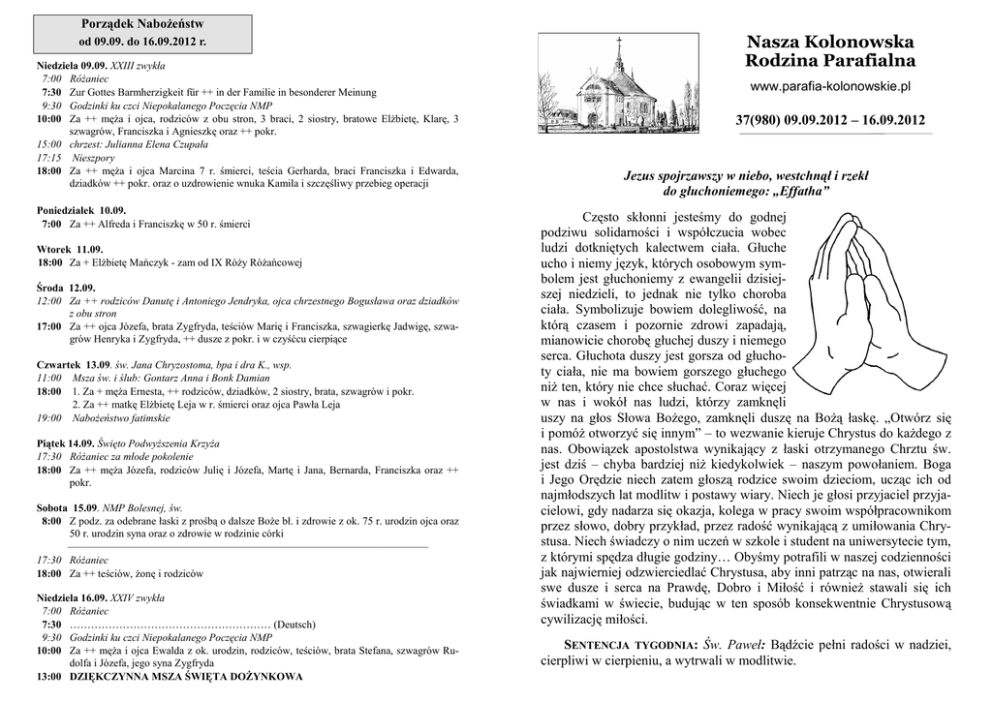 Porządek Nabożeństw od 09.09. do 16.09.2012 r. Niedziela 09.09. XXIII zwykła 7:00 Różaniec 7:30 Zur Gottes Barmherzigkeit für ++ in der Familie in besonderer Meinung 9:30 Godzinki ku czci Niepokalanego Poczęcia NMP 10:00 Za ++ męża i ojca, rodziców z obu stron, 3 braci, 2 siostry, bratowe Elżbietę, Klarę, 3 szwagrów, Franciszka i Agnieszkę oraz ++ pokr. 15:00 chrzest: Julianna Elena Czupała 17:15 Nieszpory 18:00 Za ++ męża i ojca Marcina 7 r. śmierci, teścia Gerharda, braci Franciszka i Edwarda, dziadków ++ pokr. oraz o uzdrowienie wnuka Kamila i szczęśliwy przebieg operacji Poniedziałek 10.09. 7:00 Za ++ Alfreda i Franciszkę w 50 r. śmierci Wtorek 11.09. 18:00 Za + Elżbietę Mańczyk - zam od IX Róży Różańcowej Środa 12.09. 12:00 Za ++ rodziców Danutę i Antoniego Jendryka, ojca chrzestnego Bogusława oraz dziadków z obu stron 17:00 Za ++ ojca Józefa, brata Zygfryda, teściów Marię i Franciszka, szwagierkę Jadwigę, szwagrów Henryka i Zygfryda, ++ dusze z pokr. i w czyśćcu cierpiące Czwartek 13.09. św. Jana Chryzostoma, bpa i dra K., wsp. 11:00 Msza św. i ślub: Gontarz Anna i Bonk Damian 18:00 1. Za + męża Ernesta, ++ rodziców, dziadków, 2 siostry, brata, szwagrów i pokr. 2. Za ++ matkę Elżbietę Leja w r. śmierci oraz ojca Pawła Leja 19:00 Nabożeństwo fatimskie Piątek 14.09. Święto Podwyższenia Krzyża 17:30 Różaniec za młode pokolenie 18:00 Za ++ męża Józefa, rodziców Julię i Józefa, Martę i Jana, Bernarda, Franciszka oraz ++ pokr. Sobota 15.09. NMP Bolesnej, św. 8:00 Z podz. za odebrane łaski z prośbą o dalsze Boże bł. i zdrowie z ok. 75 r. urodzin ojca oraz 50 r. urodzin syna oraz o zdrowie w rodzinie córki —–—————————————–——————————————–————– 17:30 Różaniec 18:00 Za ++ teściów, żonę i rodziców Niedziela 16.09. XXIV zwykła 7:00 Różaniec 7:30 ………………………………………………… (Deutsch) 9:30 Godzinki ku czci Niepokalanego Poczęcia NMP 10:00 Za ++ męża i ojca Ewalda z ok. urodzin, rodziców, teściów, brata Stefana, szwagrów Rudolfa i Józefa, jego syna Zygfryda 13:00 DZIĘKCZYNNA MSZA ŚWIĘTA DOŻYNKOWA Nasza Kolonowska Rodzina Parafialna www.parafia-kolonowskie.pl 37(980) 09.09.2012 – 16.09.2012 Jezus spojrzawszy w niebo, westchnął i rzekł do głuchoniemego: „Effatha” Często skłonni jesteśmy do godnej podziwu solidarności i współczucia wobec ludzi dotkniętych kalectwem ciała. Głuche ucho i niemy język, których osobowym symbolem jest głuchoniemy z ewangelii dzisiejszej niedzieli, to jednak nie tylko choroba ciała. Symbolizuje bowiem dolegliwość, na którą czasem i pozornie zdrowi zapadają, mianowicie chorobę głuchej duszy i niemego serca. Głuchota duszy jest gorsza od głuchoty ciała, nie ma bowiem gorszego głuchego niż ten, który nie chce słuchać. Coraz więcej w nas i wokół nas ludzi, którzy zamknęli uszy na głos Słowa Bożego, zamknęli duszę na Bożą łaskę. „Otwórz się i pomóż otworzyć się innym” – to wezwanie kieruje Chrystus do każdego z nas. Obowiązek apostolstwa wynikający z łaski otrzymanego Chrztu św. jest dziś – chyba bardziej niż kiedykolwiek – naszym powołaniem. Boga i Jego Orędzie niech zatem głoszą rodzice swoim dzieciom, ucząc ich od najmłodszych lat modlitw i postawy wiary. Niech je głosi przyjaciel przyjacielowi, gdy nadarza się okazja, kolega w pracy swoim współpracownikom przez słowo, dobry przykład, przez radość wynikającą z umiłowania Chrystusa. Niech świadczy o nim uczeń w szkole i student na uniwersytecie tym, z którymi spędza długie godziny… Obyśmy potrafili w naszej codzienności jak najwierniej odzwierciedlać Chrystusa, aby inni patrząc na nas, otwierali swe dusze i serca na Prawdę, Dobro i Miłość i również stawali się ich świadkami w świecie, budując w ten sposób konsekwentnie Chrystusową cywilizację miłości. SENTENCJA TYGODNIA: Św. Paweł: Bądźcie pełni radości w nadziei, cierpliwi w cierpieniu, a wytrwali w modlitwie. 37/2012 Święto Dziękczynienia Gminne Dożynki 15 i 16.09.2012 roku w Kolonowskiem parafialny kościół oraz parafialny ogród Msze św. w tych dniach będą w sobotę o 18:00, w niedzielę o 7:30; 10:00 i 13:00 Msza św. Dożynkowa. Nie będzie Nieszporów ani Mszy Św. w niedzielę o 18:00. Prośba, aby w miarę możliwości uczestniczyć w Mszy św. Dziękczynnej – Dożynkowej. Gromadzimy się o godz. 12:45 pod strażą i procesyjnie przyjdziemy do kościoła. Porządek procesji: kadzidło; krzyż i akolitki; marianki; ministranci, siostry, szafarze, orkiestra; dzieci z darami; korony żniwne; starostowie; kapłani; wierni. Po przyjściu do świątyni i pozdrowieniu nastąpi błogosławieństwo koron i darów, korony zostają postawione z tyłu prezbiterium. Po modlitwie wiernych nastąpi przyniesienie darów przez starostów i dzieci. Udziałem w Mszy Św. i uroczystym Te Deum pragniemy Bogu z serc naszych składać dziękczynienie. Okazja do spowiedzi św. przed Dożynkami, w tygodniu, pół godziny przed każdą Mszą św. Prośba, aby kto może, to do czwartku przyniósł dary do dekoracji ołtarza: warzywa, owoce itp. Program Gminnych Dożynek Sobota: 17:00 - Gry i zabawy dla dzieci 18:00 – Ola Ost 19:30 - Zabawa taneczna z zespołem Voyager Niedziela: 15:00 – Korowód (spod straży, ulicami Opolską, Kościuszki, Kolejową, Ks. Czerwionki, Leśną do ogrodu parafii). Nieśmiała prośba organizatorów, aby udekorować trasę korowodu. 16:00 – występ dzieci z PSP Kolonowskie 16:30 - Orkiestra dęta Colonnowska 17:00 – Zespół taneczny Figielek 18:00 - Dominika & Janusz Żyłka 19:00 – Zabawa taneczna z DJ Hubertem oraz dodatkowe atrakcje i niespodzianki ZAPRASZAMY Dzisiaj XXIII niedziela zwykła w roku liturgicznym. Kolekta na cele parafii. Nieszpory o 17:15. —–—————————————–———