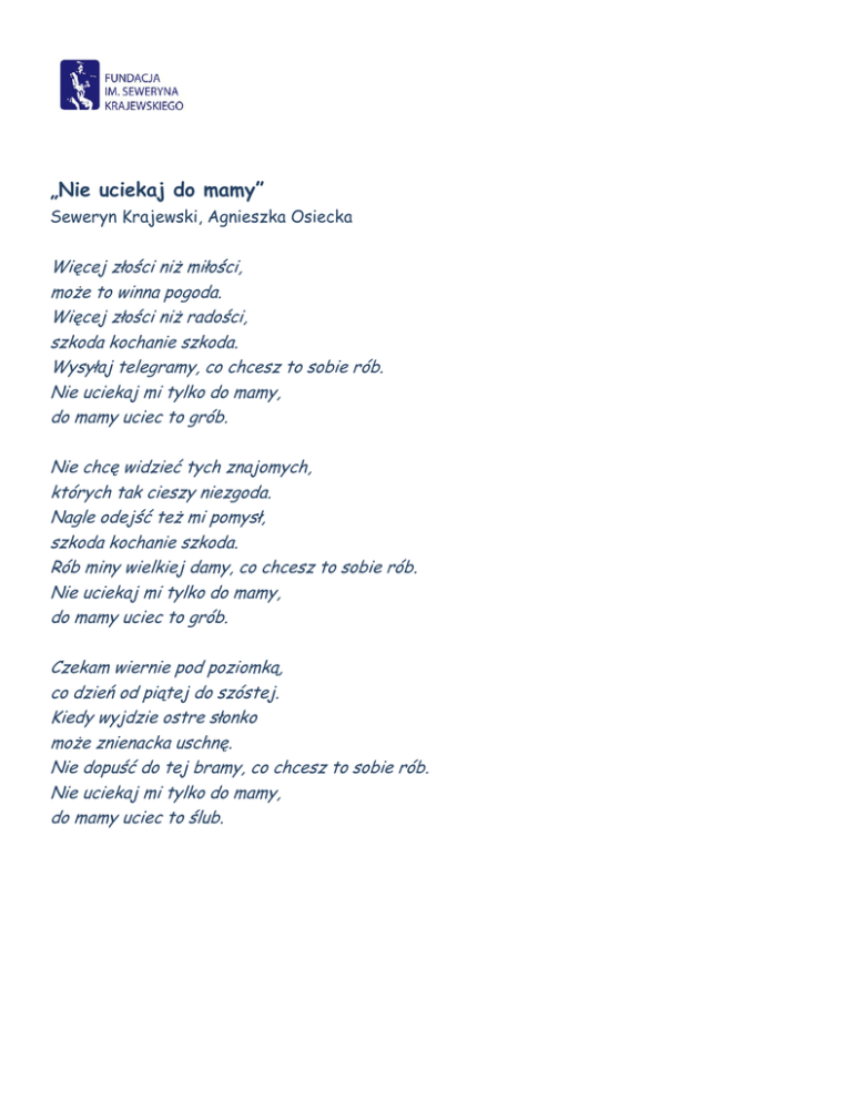 „Nie uciekaj do mamy” Seweryn Krajewski, Agnieszka Osiecka Więcej złości niż miłości, może to winna pogoda. Więcej złości niż radości, szkoda kochanie szkoda. Wysyłaj telegramy, co chcesz to sobie rób. Nie uciekaj mi tylko do mamy, do mamy uciec to grób. Nie chcę widzieć tych znajomych, których tak cieszy niezgoda. Nagle odejść też mi pomysł, szkoda kochanie szkoda. Rób miny wielkiej damy, co chcesz to sobie rób. Nie uciekaj mi tylko do mamy, do mamy uciec to grób. Czekam wiernie pod poziomką, co dzień od piątej do szóstej. Kiedy wyjdzie ostre słonko może znienacka uschnę. Nie dopuść do tej bramy, co chcesz to sobie rób. Nie uciekaj mi tylko do mamy, do mamy uciec to ślub.