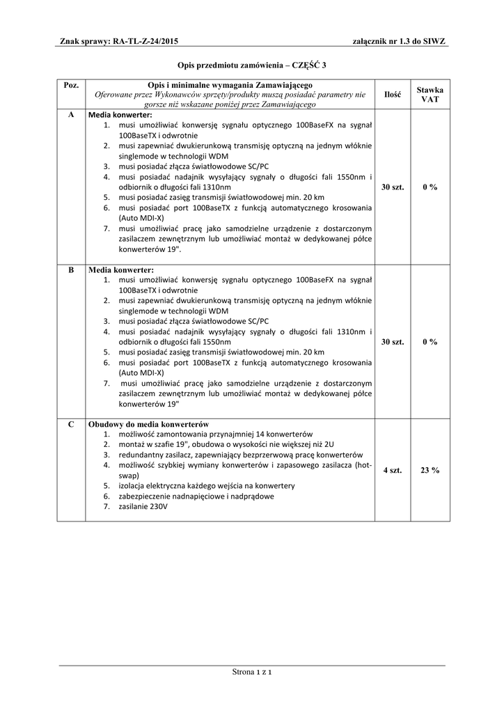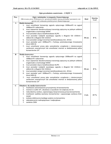 Znak sprawy: RA-TL-Z-24/2015 załącznik nr 1.3 do SIWZ Opis przedmiotu zamówienia – CZĘŚĆ 3 Poz. A B C Opis i minimalne wymagania Zamawiającego Oferowane przez Wykonawców sprzęty/produkty muszą posiadać parametry nie gorsze niż wskazane poniżej przez Zamawiającego Media konwerter: 1. musi umożliwiać konwersję sygnału optycznego 100BaseFX na sygnał 100BaseTX i odwrotnie 2. musi zapewniać dwukierunkową transmisję optyczną na jednym włóknie singlemode w technologii WDM 3. musi posiadać złącza światłowodowe SC/PC 4. musi posiadać nadajnik wysyłający sygnały o długości fali 1550nm i odbiornik o długości fali 1310nm 5. musi posiadać zasięg transmisji światłowodowej min. 20 km 6. musi posiadać port 100BaseTX z funkcją automatycznego krosowania (Auto MDI-X) 7. musi umożliwiać pracę jako samodzielne urządzenie z dostarczonym zasilaczem zewnętrznym lub umożliwiać montaż w dedykowanej półce konwerterów 19". Media konwerter: 1. musi umożliwiać konwersję sygnału optycznego 100BaseFX na sygnał 100BaseTX i odwrotnie 2. musi zapewniać dwukierunkową transmisję optyczną na jednym włóknie singlemode w technologii WDM 3. musi posiadać złącza światłowodowe SC/PC 4. musi posiadać nadajnik wysyłający sygnały o długości fali 1310nm i odbiornik o długości fali 1550nm 5. musi posiadać zasięg transmisji światłowodowej min. 20 km 6. musi posiadać port 100BaseTX z funkcją automatycznego krosowania (Auto MDI-X) 7. musi umożliwiać pracę jako samodzielne urządzenie z dostarczonym zasilaczem zewnętrznym lub umożliwiać montaż w dedykowanej półce konwerterów 19" Obudowy do media konwerterów 1. możliwość zamontowania przynajmniej 14 konwerterów 2. montaż w szafie 19", obudowa o wysokości nie większej niż 2U 3. redundantny zasilacz, zapewniający bezprzerwową pracę konwerterów 4. możliwość szybkiej wymiany konwerterów i zapasowego zasilacza (hotswap) 5. izolacja elektryczna każdego wejścia na konwertery 6. zabezpieczenie nadnapięciowe i nadprądowe 7. zasilanie 230V Strona 1 z 1 Ilość Stawka VAT 30 szt. 0% 30 szt. 0% 4 szt. 23 %