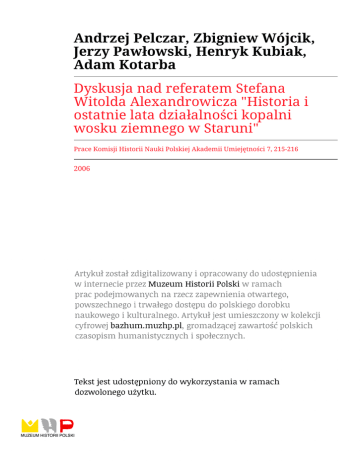 Andrzej Pelczar, Zbigniew Wójcik, Jerzy Pawłowski, Henryk Kubiak, Adam Kotarba Dyskusja nad referatem Stefana Witolda Alexandrowicza "Historia i ostatnie lata działalności kopalni wosku ziemnego w Staruni" Prace Komisji Historii Nauki Polskiej Akademii Umiejętności 7, 215-216 2006 215 H is to ria i o s ta tn ie lata d z ia ła ln o ś c i k o p a ln i w o sk u z ie m n e g o w S ta r u n i D y sk u sja nad referatem Stefana W itolda A lex an d row icza H is to r ia i o s t a t n i e la ta d z i a ła ln o ś c i k o p a ln i w o s k u z ie m n e g o w S ta r u n i W d y sk u sji u d z ia ł w zięli: A . Pelczar, Z. Wójcik, J. Pawłowski, M. Kotarba i autor. P oniżej p rz y to c z o n e są te k sty w y stąp ień . H. Kubiak, Andrzej Pelczar: ja k w y ja śn ić to, że p a n A. K ogut, bo ta k się n a z y w a ł a u to r a rty k u łu w „G a zecie R obotniczej", p o w o łał się n a F. M itu rę? Jest to chyba z w ią z a n e z ty m , że oni sp o tk a li się w la ta c h c z te rd z ie sty c h w S ta ru n i i d lateg o to n a z w is k o skojarzyło m u się z w y k o p a lis k a m i. M itu ra n ie m ógł być p rzecież obecny w tedy, gdy n o sorożca w y d o b y w a n o . Zbigniew Wójcik: Trzy lata tem u , będ ąc w A rc h iw u m H isto ry c z n y m U k ra in y w e Lw ow ie i p rz e glądając k a ta lo g , w w ielu m iejscach z n a la z łe m in fo rm acje o w y d o b y w a n iu w osku. D oty czą o n e g łó w n ie B orysław ia, ale tak ż e S ta ru n i. Są to n ie ty lk o sp ra w o z d a n ia , ale i m apy. M a te ria ły te są łatw o d o stę p n e i w a rto po nie sięgnąć. N ie d a w n o z m a rł geo log u k ra iń s k i G eorgij Bojko, k tó ry p o w ojnie k iero w ał w y d o b y w a n ie m w osku zie m n eg o w B orysław iu. M niej w ięcej d w a lata tem u p rz y w ió z ł o n do K rosna rę k o p is sw ojej d u żej p ra c y o eksploatacji o z o k e ry tu i p rz e k a z a ł go p o lsk iem u in ży n ie ro w i, k tó ry z re sz tą też n ie d a w n o zm arł. M iała to być ich w sp ó ln a praca. N a p e w n o rę k o p is ten jest łatw o d o stę p n y w In sty tu c ie N a fto w y m w K rakow ie. Jerzy Pawłowski: C ałą fa u n ę i florę, k tó rą na p o c z ą tk u lat trz y d z ie sty c h b a d a n o w ty m b u d y n k u , w y d o b y to z b rz u c h a n o so ro żca, z p ę k n ię te g o jego w n ę trz a , n a to m ia st, o ile m i w iad o m o , nie p o c h o d z iła o n a z ż ad n y c h w a rs tw sąsied n ich . M ateriały te m ają d u ż ą w a rto ść , bo są w sp ó łczesn e z o k olicznością śm ierci zw ie rz ęcia . N a to m iast n a le ż y żałow ać, że n ie a n a liz o w a n o o to czen ia. To, co było b a d a n e , p rz ep a d ło , b o jeszcze p rz e d w ojną w y sła n o te m a teria ły za granicę, a częściow o d o ty czy to np. ow adów . C h ciałem p rz y p o m n ie ć , że istnieje p lan , w y k o n a n y chyba p rz e z P ano w a, g d z ie są z a z n a c z o n e „ro b o ty 1932". Były one p ro w a d z o n e w in n y m k ie r u n k u n iż te n , w k tó ry m zo stał Z naleziony nosorożec, nie b a d a n o p rzy ty m są sie d z tw a . W arto też p am iętać, że istn ia ła w te d y jed n a in sty tu c ja kieru jąca p ro w a d z o n y m i o p ra c o w a n ia m i i k o o rd y n u jąc a je, a p re p a ra ty k a i b a d a n ia m ateriałó w p a le o b o ta n ic z n y c h o d b y w a ły się w M u ze u m P rz y ro d n ic z y m PAU i tu zajm ow ała się n im i p a n i I. D ąbkow ska. N ie w iem , co się stało z ty m i m a te ria ła m i, być m oże p o ro z d z ie le n iu m u z e u m z n a la z ły się w In sty tu c ie B otaniki. 216 STEFAN WITOLD ALEXANDRO W ICZ H enryk Kubiak: Istn ieje d o k ła d n a lista sp o rz ą d z o n a p rz e z prof. S tacha, d o ty cząca ro z d z ia łu m ateriałów , w ia d o m o z niej, g d zie i k to co d o stał, a co w y sła n o za granicę. O becn ie tru d n o d o ty ch m a teriałó w d o trzeć, bo ludzie, k tó rzy je d o sta li, ju ż d a w n o n ie żyją. To, co zo sta ło p rz e k a z a n e d o W arszaw y, p rz e p a d ło w czasie wojny. Co do m ateriałów , o k tó ry c h P an P ro feso r Paw łow ski m ów ił, że p o c h o d z ą z b rz u c h a no so ro żca, ch ciałb y m w yjaśnić, że n o so ro żec uleg ł u s z k o d z e n iu p ra w d o p o d o b nie p rz e z tr a n s p o r t w odny. Z o stały w te d y w y p łu k a n e w szy stk ie w n ę trz n o śc i, ta k ż e żołądek. W lite ra tu rz e p o k u tu je tw ie rd z e n ie , że b a d a n o treść żo łąd k a, ale to nie jest p ra w d a , b o o n się n ie zach o w ał i po p ro stu go n ie było, a n o so ro żec zo stał w y p e łn io n y ż w ire m i p iask iem . N a stę p n a sp ra w a to d a to w a n ia , w y k o n a n e w M oskw ie i w G liw icach m e to d ą 14C. Był to ten sam a n a liz o w a n y m ate riał, a ro z bieżności w o z n a c z e n ia c h w ie k u są z n a c z n e i m ieszczą się w p rz e d z ia le 36 d o 14 tysięcy lat, a w ięc w y n o sz ą 22 000 lat. Adam Kotarba: S ta n o w isk ie m w S ta ru n i zająłem się p o d w p ły w e m prof. K ubiaka, k tó ry zw ró c ił się d o m n ie z p ro p o zy cją podjęcia b a d a ń b itu m in ó w . P ra g n ę tu p o ru sz y ć trz y sp raw y, a p ie rw sz a d o ty c z y m a p rejonu S ta ru n i. W S tan isław o w ie, gd zie p rzy ję to m n ie b a rd z o p rzyjacielsko, n ie p o k a z a n o m i ty ch m ap, zasłan iając się ta jem nicą. D ru g a sp ra w a w iąż e się z M u z e u m P rz y ro d n ic z y m w e Lw ow ie. Jest ono za m k n ię te , b o trw a rem o n t, ale z w ie d z a łe m m agazyny. Są ta m o g ro m n e zb io ry p o lsk ich paleon to lo g ó w , b ad a c zy c z w a rto rzę d u , g ro m a d z o n e od XIX w iek u , jeszcze w c za sa c h p o w s ta n ia listo p ad ow ego. Są one z g ro m a d z o n e w dużej hali, w fataln y ch w a ru n k a c h , a k a rty id en ty fik acy