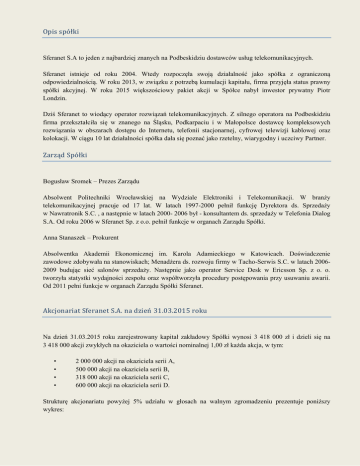 Opis spółki Sferanet S.A to jeden z najbardziej znanych na Podbeskidziu dostawców usług telekomunikacyjnych. Sferanet istnieje od roku 2004. Wtedy rozpoczęła swoją działalność jako spółka z ograniczoną odpowiedzialnością. W roku 2013, w związku z potrzebą kumulacji kapitału, firma przyjęła status prawny spółki akcyjnej. W roku 2015 większościowy pakiet akcji w Spółce nabył inwestor prywatny Piotr Londzin. Dziś Sferanet to wiodący operator rozwiązań telekomunikacyjnych. Z silnego operatora na Podbeskidziu firma przekształciła się w znanego na Śląsku, Podkarpaciu i w Małopolsce dostawcę kompleksowych rozwiązania w obszarach dostępu do Internetu, telefonii stacjonarnej, cyfrowej telewizji kablowej oraz kolokacji. W ciągu 10 lat działalności spółka dała się poznać jako rzetelny, wiarygodny i uczciwy Partner. Zarząd Spółki Bogusław Sromek – Prezes Zarządu Absolwent Politechniki Wrocławskiej na Wydziale Elektroniki i Telekomunikacji. W branży telekomunikacyjnej pracuje od 17 lat. W latach 1997-2000 pełnił funkcję Dyrektora ds. Sprzedaży w Nawratronik S.C. , a następnie w latach 2000- 2006 był - konsultantem ds. sprzedaży w Telefonia Dialog S.A. Od roku 2006 w Sferanet Sp. z o.o. pełnił funkcje w organach Zarządu Spółki. Anna Stanaszek – Prokurent Absolwentka Akademii Ekonomicznej im. Karola Adamieckiego w Katowicach. Doświadczenie zawodowe zdobywała na stanowiskach; Menadżera ds. rozwoju firmy w Tacho-Serwis S.C. w latach 20062009 budując sieć salonów sprzedaży. Następnie jako operator Service Desk w Ericsson Sp. z o. o. tworzyła statystki wydajności zespołu oraz współtworzyła procedury postępowania przy usuwaniu awarii. Od 2011 pełni funkcje w organach Zarządu Spółki Sferanet. Akcjonariat Sferanet S.A. na dzień 31.03.2015 roku Na dzień 31.03.2015 roku zarejestrowany kapitał zakładowy Spółki wynosi 3 418 000 zł i dzieli się na 3 418 000 akcji zwykłych na okaziciela o wartości nominalnej 1,00 zł każda akcja, w tym: • • • • 2 000 000 akcji na okaziciela serii A, 500 000 akcji na okaziciela serii B, 318 000 akcji na okaziciela serii C, 600 000 akcji na okaziciela serii D. Strukturę akcjonariatu powyżej 5% udziału w głosach na walnym zgromadzeniu prezentuje poniższy wykres: Struktura akcjonariatu Sferanet 16% 5% Bogusław Sromek Henryk Wizner 38% Piotr Londzin 41% Pozostali . Charakterystyka dokonań Na koniec pierwszego kwartału 2015 roku Spółka wygenerowała zysk netto w kwocie 43 773,31 zł. W porównaniu do okresu analogicznego z 2014 roku jest to wynik niższy (zysk netto w pierwszym kwartale 2014 roku wynosił 151,4 tys. zł netto). Obniżenie zysku netto w dużej mierze wynika z wprowadzenia przez Zarząd promocyjnej prolongaty płatności dla nowych klientów. Gwarantuje ona nowym abonentom Sferanet obniżenie miesięcznej opłaty abonamentowej do kwoty 1,00 zł netto do czasu obowiązywania ich umowy z konkurencyjnym operatorem. Taka strategia gwarantuje Spółce wysycenie rynku oraz długoterminową współpracę z klientem. W kolejnych okresach przychody ze sprzedaży usług abonamentowych będą systematycznie wzrastać. Od początku 2015 roku do dnia 31.03.2015 roku Spółka osiągnęła przychody ze sprzedaży na poziomie 520 890,21 zł, co stanowiło spadek przychodów ze sprzedaży o 2,24 % względem porównywalnego okresu ubiegłego roku kiedy przychody wyniosły 532 591,30 zł. Przychody osiągnięte w I kwartale 2015 roku stanowiły głównie przychody abonamentowe wynikające z podstawowej działalności Spółki. Wartym podkreślenia jest fakt, iż przychody abonamentowe wzrosły o 15% w stosunku do analogicznego okresu w roku 2014. Spadek przychodów ze sprzedaży usług dodatkowych spowodowany jest wprost z braku zaangażowania Spółki w dodatkowe usługi budowlane w branży teletechnicznej. Dynamikę zmian prezentują poniższe wykresy : Zysk netto [tys.zł] Zysk netto [tys. zł] spółki Sferanet w wariancie porównawczym narastająco za IQ'2015 r. i IQ'2014 r. 160,00 140,00 120,00 100,00 80,00 60,00 40,00 20,00 0,00 151,40 Struktura przychodów [tys. zł] Sferanet w wariancie porównawczym narastająco za IQ'2015 r. i IQ'2014 r. 600,00 500,00 400,00 300,00 200,00 100,00 0,00 492,49 428,09 104,50 IQ2014 43,77 IQ2014 IQ2015 28,40 IQ2015 przychód netto ze sprzedaży usług abonamentowych przychód netto ze sprzedaży usług dodatkowych Prognozy na kolejne kwartały 2015 roku W dalszym ciągu Spółka prowadzi kilka projektów inwestycyjnych współfinansowanych ze środków Unii Europejskiej, polegających na budowie sieci światłowodowej, a także zaplecza umożliwiającego zaoferowanie usług w nowych lokalizacjach. W projektach osiągnięto 98% wskaźnika odpowiadającego za pozyskanie klientów na terenach objętych dofinansowaniem. Ponadto toczące się prace pozwoliły na uruchomienie ponad 400 nowych abonentów. Łącznie do końca 2015 z usług świadczonych na łączach światłowodowych korzystać będzie 1295 klientów. Drugi kwartał 2015 roku to zakończenie i rozliczenie projektu „Internet szerokopasmowy na Podbeskidziu”. W rezultacie do użytku oddanych zostanie blisko 100 kilometrów sieci światłowodowej, a z usługi dostępu do szerokopasmowego Internetu oraz usług komplementarnych uzyska pond 700 klientów. Na koniec IQ 2015 roku zaawansowanie inwestycji oceniono na 93 %. Na dzień 31.03.2015 roku uruchomiono usługę u 420 klientów, którzy wkrótce zaczną generować nowe przychody ze sprzedaży. W trzecim kwartale 2015 roku planowane jest rozliczenie projektów: „Sieć szerokopasmowa w Goleszowie, Ustroniu i Cieszynie” oraz „Podkarpacka sieć szerokopasmowa”. Na koniec pierwszego kwartału 2015 roku z usługi dostępu do Internetu w miejscowości Cieszyn korzystało 75 osób (finalna liczba podłączeń: 440). Na podkarpaciu uzgodnione technicznie projekty na prace ziemne rozpoczęto realizować w terenie. Zaawansowanie