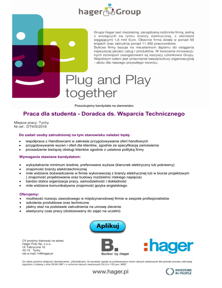 Poszukujemy kandydata na stanowisko: Praca dla studenta - Doradca ds. Wsparcia Technicznego Miejsce pracy: Tychy Nr.ref.: DTWS/2016 Do zadań osoby zatrudnionej na tym stanowisku należeć będą: współpraca z Handlowcami w zakresie przygotowywania ofert handlowych przygotowywanie wycen i ofert dla klientów, zgodnie ze specyfikacją zamówienia prowadzenie bieżącej obsługi klientów zgodnie z ustalona polityką firmy Wymagania stawiane kandydatom: wykształcenie minimum średnie, preferowane wyższe (kierunek elektryczny lub pokrewny) znajomość branży elektrotechnicznej mile widziane doświadczenie w firmie wykonawczej z branży elektrycznej lub w biurze projektowym ( znajomość projektowania oraz budowy rozdzielnic niskiego napięcia) bardzo dobra organizacja pracy, samodzielność i dokładność mile widziana komunikatywna znajomość języka angielskiego Oferujemy: możliwość rozwoju zawodowego w międzynarodowej firmie w zespole profesjonalistów szkolenia produktowe oraz techniczne płatny staż na podstawie zatrudnienia na umowę zlecenie elastyczny czas pracy (dostosowany do zajęć na uczelni)