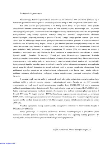 Szanowni Akcjonariusze Przedstawiając Państwu sprawozdanie finansowe za rok obrotowy 2006 chciałbym podzielić się z Państwem spostrzeŜeniami i uwagami na temat funkcjonowania firmy w 2006 oraz planami spółki na rok 2007. Rok 2006 oceniam jako przełomowy w 19 letniej historii firmy. W tym okresie firma podjęła zdecydowane działania restrukturyzacyjne mające na celu poprawę wyniku finansowego oraz uzyskanie znaczącej pozycji na rynku. Działaniami restrukturyzacyjnymi zostały objęte wszystkie kluczowe dla sprawnego funkcjonowania firmy obszary: sprzedaŜ, realizacja usług oraz produkcja oprogramowania. Działania restrukturyzacyjne rozpoczął powołany w grudniu 2005 roku Zarząd, którego pracami kierował pan Prezes Janusz Bąk. W skład tego Zarządu weszli, poza prezesem Januszem Bąkiem, panowie: Wiceprezes Sławomir Siedlarski oraz Wiceprezes Jerzy Kopiec. Zarząd w tym składzie opracował strategię rozwoju firmy na lata 2006-2009 i rozpoczął jej realizację. W związku ze zmianą struktury akcjonariatu oraz rezygnacjami złoŜonymi przez członków Rady Nadzorczej, na walnym zgromadzeniu 22 czerwca 2006 roku doszło do zmiany 5 członków z sześcioosobowej Rady Nadzorczej. Rada Nadzorcza w nowym składzie zdecydowała o zmianie Zarządu spółki. Powołany 26 czerwca Zarząd pod moim kierownictwem kontynuował działania restrukturyzacyjne, wprowadzając istotne modyfikacje w koncepcji funkcjonowania firmy. Do najwaŜniejszych wprowadzonych zmian naleŜy zaliczyć: implementację nowej metodyki działań handlowych, reorganizację funkcjonowania kanałów sprzedaŜy, nową organizację procesów obsługi klienta oraz rozpoczęcie wprowadzania nowej metodyki wdroŜeń. Zmieniono teŜ sposób realizacji zadań w zakresie zarządzania infrastrukturą. Poza działaniami restrukturyzacyjnymi do najwaŜniejszych realizowanych przez Zarząd prac działania związane z udoskonaleniem i rozbudową zestawu produktów oraz naleŜy zaliczyć: prace nad połączeniem z Simple Sp. z o.o. O perspektywach rozwoju spółki w następnych latach zdecydują, oprócz efektywności organizacyjnej, działania spółki w zakresie rozwoju. Jednym z najwaŜniejszych celów Zarządu na rok 2007 pozostaje wprowadzenie na rynek nowej wersji sztandarowego produktu firmy SIMPLE.ERP 5.0 wraz z zestawem aplikacji uzupełniających jego funkcjonalność. Rozpoczęto równieŜ prace nad systemem SIMPLE.HRM, który będzie wspomagał zarządzanie zasobami ludzkimi. Zakończenie prac nad tym systemem planowane jest na I kwartał 2008 roku. W drugim kwartale 2007 Spółka planuje rozpoczęcie prac rozwojowych nad systemem SIMPLE.SCM wspomagającym zarządzanie łańcuchem dostaw. Na realizację prac związanych z produkcją tego systemu spółka uzyskała dotację ze środków UE. Harmonogram projektu zakłada zakończenie prac na koniec 2008 roku. Wszelkie wymienione wyŜej kwestie zostały szczegółowo omówione w Sprawozdaniu Zarządu z Działalności w 2006 roku. Zarząd przewiduje, Ŝe wszystkie realizowane działania restrukturyzacyjne i prowadzone prace rozwojowe znacznie poprawią rentowność spółki w 2007 roku oraz zapewnią stabilną podstawę do wykorzystania potencjału wzrostu rynku informatycznego w następnych latach. Rafał Tumiłowicz Prezes Zarządu Simple S.A. Global Reports LLC Sprawozdanie Zarządu z działalności SIMPLE S.A. w 2006 roku. Działalność operacyjna W 2006 roku przedsiębiorstwo kontynuowało działalność w zakresie produkcji, sprzedaŜy, wdroŜeń, serwisu systemów wspomagających zarządzanie oraz dostaw sprzętu komputerowego, oprogramowania systemowego i usług w tym obszarze. W pierwszym półroczu działalnością firmy kierował Zarząd w składzie: Janusz Bąk – Prezes, Jerzy Kopiec – Wiceprezes, Sławomir Siedlarski – Wiceprezes. W czerwcu 2006 nastąpiła zmiana Zarządu. W skład Zarządu, prowadzącego działalność spółki w drugim półroczu, zostali powołani: Rafał Tumiłowicz – Prezes, ElŜbieta Sas- Tatomir – Wiceprezes, Michał Siedlecki – Wiceprezes. W 2006 roku spółka osiągnęła przychody ze sprzedaŜy w wysokości 12 384 TYS PLN. Były one o ok. 2,9% wyŜsze niŜ przychody osiągnięte w 2005 roku. Niestety pomimo zwiększonych przychodów w roku 2006 zanotowała stratę netto w wysokości 361 TYS PLN. Na osiągnięty wynik, pomimo zwiększonych przychodów i poprawy zyskowności sprzedaŜy (zysk brutto na sprzedaŜy wzrósł o 5,8%) miały wpływ koszty restrukturyzacji odprawy dla członków kanałów sprzedaŜy, zwiększenie potencjału działu produkcji, poprzedniego kierownictwa wynikające ze zmiany zarządu oraz zwiększone koszty działań handlowych związane ze znacznym poszerzeniem zespołu handlowego. Na większe koszty miały teŜ wpływ niezbędne inwestycje w infrastrukturę: odnowienie znacznej ilości sprzętu komputerowego, zakup samochodów słuŜbowych dla kluczowych konsultantów wdroŜeniowych, remonty pomieszczeń biurowych, instalacje klimatyzacji, przebudowa recepcji. Istotnymi pozycjami powodującymi wzrost kosztów były teŜ: procedura weryfikacji przez Stowarzyszenie Księgowych w Polsce nowej wersji systemu SIMPLE.ERP oraz zlecenie firmie Javart Sp. z o.o. prac mających na celu unowocześnienie procesu testowania systemu SIMPLE.ERP. NaleŜy równieŜ wspomnieć, iŜ bardzo istotny wpływ na wynik finansowy firmy ma amortyzacja prowadzonych w przeszłości prac badawczo rozwojowych. Wysokość tej amortyzacji w skali 2006 roku wyniosła ok. 1 499 TYS PLN, natomiast nakłady na prace rozwojowe wyniosły ok. 858 TYS PLN. Do najwaŜniejszych działań operacyjnych realizowanych w pierwszym półroczu 2006 roku naleŜy zaliczyć opracowanie i rozpoczęcie realizacji trzyletniej strategii rozwoju Simple S.A., zainicjowanie zmian w organizacji kanałów sprzedaŜy, poszukiwanie rozwiązań informatycznych mających na celu uzupełnienie oferty firmy oraz prace związane z restrukturyzacj