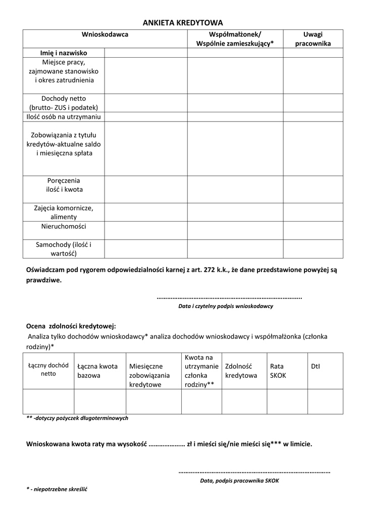 ANKIETA KREDYTOWA Wnioskodawca Współmałżonek/ Wspólnie zamieszkujący* Uwagi pracownika Imię i nazwisko Miejsce pracy, zajmowane stanowisko i okres zatrudnienia Dochody netto (brutto- ZUS i podatek) Ilość osób na utrzymaniu Zobowiązania z tytułu kredytów-aktualne saldo i miesięczna spłata Poręczenia ilość i kwota Zajęcia komornicze, alimenty Nieruchomości Samochody (ilość i wartość) Oświadczam pod rygorem odpowiedzialności karnej z art. 272 k.k., że dane przedstawione powyżej są prawdziwe. ……………………………………………………………………….. Data i czytelny podpis wnioskodawcy Ocena zdolności kredytowej: Analiza tylko dochodów wnioskodawcy* analiza dochodów wnioskodawcy i współmałżonka (członka rodziny)* Kwota na Łączny dochód Łączna kwota Miesięczne utrzymanie Zdolność Rata DtI netto bazowa zobowiązania członka kredytowa SKOK kredytowe rodziny** ** -dotyczy pożyczek długoterminowych Wnioskowana kwota raty ma wysokość ………………… zł i mieści się/nie mieści się*** w limicie. …………………………………………………………………………… Data, podpis pracownika SKOK * - niepotrzebne skreślić