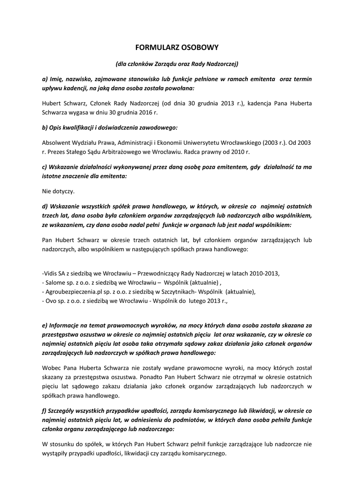 FORMULARZ OSOBOWY (dla członków Zarządu oraz Rady Nadzorczej) a) Imię, nazwisko, zajmowane stanowisko lub funkcje pełnione w ramach emitenta oraz termin upływu kadencji, na jaką dana osoba została powołana: Hubert Schwarz, Członek Rady Nadzorczej (od dnia 30 grudnia 2013 r.), kadencja Pana Huberta Schwarza wygasa w dniu 30 grudnia 2016 r. b) Opis kwalifikacji i doświadczenia zawodowego: Absolwent Wydziału Prawa, Administracji i Ekonomii Uniwersytetu Wrocławskiego (2003 r.). Od 2003 r. Prezes Stałego Sądu Arbitrażowego we Wrocławiu. Radca prawny od 2010 r. c) Wskazanie działalności wykonywanej przez daną osobę poza emitentem, gdy działalność ta ma istotne znaczenie dla emitenta: Nie dotyczy. d) Wskazanie wszystkich spółek prawa handlowego, w których, w okresie co najmniej ostatnich trzech lat, dana osoba była członkiem organów zarządzających lub nadzorczych albo wspólnikiem, ze wskazaniem, czy dana osoba nadal pełni funkcje w organach lub jest nadal wspólnikiem: Pan Hubert Schwarz w okresie trzech ostatnich lat, był członkiem organów zarządzających lub nadzorczych, albo wspólnikiem w następujących spółkach prawa handlowego: -Vidis SA z siedzibą we Wrocławiu – Przewodniczący Rady Nadzorczej w latach 2010-2013, - Salome sp. z o.o. z siedzibą we Wrocławiu – Wspólnik (aktualnie) , - Agroubezpieczenia.pl sp. z o.o. z siedzibą w Szczytnikach- Wspólnik (aktualnie), - Ovo sp. z o.o. z siedzibą we Wrocławiu - Wspólnik do lutego 2013 r., e) Informacje na temat prawomocnych wyroków, na mocy których dana osoba została skazana za przestępstwa oszustwa w okresie co najmniej ostatnich pięciu lat oraz wskazanie, czy w okresie co najmniej ostatnich pięciu lat osoba taka otrzymała sądowy zakaz działania jako członek organów zarządzających lub nadzorczych w spółkach prawa handlowego: Wobec Pana Huberta Schwarza nie zostały wydane prawomocne wyroki, na mocy których został skazany za przestępstwa oszustwa. Ponadto Pan Hubert Schwarz nie otrzymał w okresie ostatnich pięciu lat sądowego zakazu działania jako członek organów zarządzających lub nadzorczych w spółkach prawa handlowego. f) Szczegóły wszystkich przypadków upadłości, zarządu komisarycznego lub likwidacji, w okresie co najmniej ostatnich pięciu lat, w odniesieniu do podmiotów, w których dana osoba pełniła funkcje członka organu zarządzającego lub nadzorczego: W stosunku do spółek, w których Pan Hubert Schwarz pełnił funkcje zarządzające lub nadzorcze nie wystąpiły przypadki upadłości, likwidacji czy zarządu komisarycznego. g) Informację, czy dana osoba prowadzi działalność, która jest konkurencyjna w stosunku do działalności emitenta, oraz czy jest wspólnikiem konkurencyjnej spółki cywilnej lub osobowej albo członkiem organu spółki kapitałowej lub członkiem organu jakiejkolwiek konkurencyjnej osoby prawnej: Pan Hubert Schwarz nie prowadzi działalności konkurencyjnej w stosunku do działalności Emitenta, nie jest wspólnikiem konkurencyjnej spółki cywilnej lub osobowej ani członkiem organu spółki kapitałowej lub członkiem organu jakiejkolwiek konkurencyjnej osoby prawnej. h) Informację, czy dana osoba figuruje w rejestrze dłużników niewypłacalnych, prowadzonym na podstawie ustawy z dnia 20 sierpnia 1997 r. o Krajowym Rejestrze Sądowym: Pan Hubert Schwarz nie figuruje w rejestrze dłużników niewypłacalnych, prowadzonym na podstawie ustawy o Krajowym Rejestrze Sądowym z dnia 20 sierpnia 1997 r.