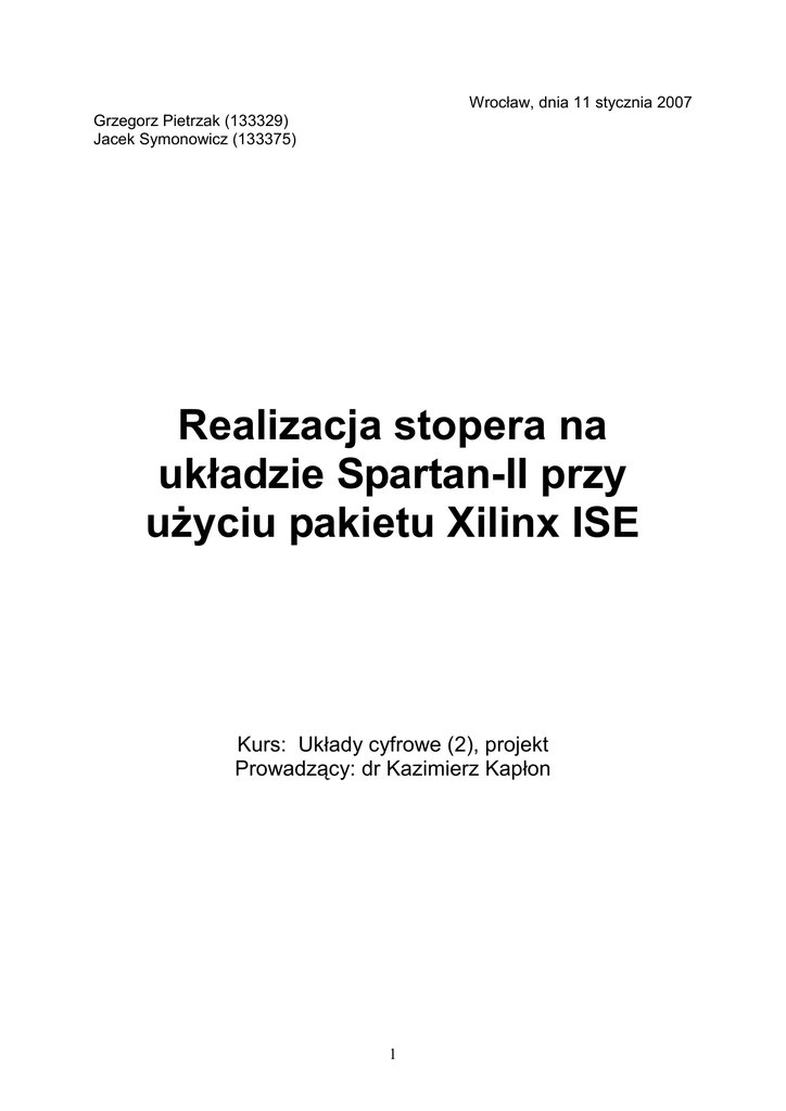 Wrocław, dnia 11 stycznia 2007 Grzegorz Pietrzak (133329) Jacek Symonowicz (133375) Realizacja stopera na układzie Spartan-II przy uŜyciu pakietu Xilinx ISE Kurs: Układy cyfrowe (2), projekt Prowadzący: dr Kazimierz Kapłon 1 Spis treści REALIZACJA STOPERA NA UKŁADZIE SPARTAN-II PRZY UśYCIU PAKIETU XILINX ISE........ 1 1. OPIS UKŁADU (ZAWARTOŚĆ ZESTAWU) ......................................................................................... 4 1.1. 1.2. 1.3. 1.4. 1.5. 1.6. UKŁAD SPARTAN-II XC2S30 W OBUDOWIE VQ 100 ............................................................................ 4 SWOBODNY PRZYCISK (BUTTON) .......................................................................................................... 5 PRZEŁĄCZNIKI (DIP SWITCHES) ............................................................................................................. 5 GENERATOR PRZEBIEGU PROSTOKĄTNEGO 50 MHZ ............................................................................. 5 WYŚWIETLACZ DYNAMICZNY LED (OŚMIOPOZYCYJNY) ...................................................................... 6 OPROGRAMOWANIE .............................................................................................................................. 6 2. OPIS ZADANIA PROJEKTOWEGO....................................................................................................... 4 3. FUNKCJONALNOŚĆ ................................................................................................................................ 7 4. SCHEMAT OGÓLNY UKŁADU ............................................................................................................ 10 5. OPISY POSZCZEGÓLNYCH MODUŁÓW.......................................................................................... 11 5.1. 5.2. 5.3. 5.4. 5.5. 5.6. 5.7. 5.8. 5.9. 5.10. 5.11. 5.12. 5.13. 5.14. 5.15. 5.16. 5.17. 5.18. 5.19. 5.20. 5.21. 5.22. 5.23. 5.24. 5.25. 5.26. 5.27. 5.28. 5.29. 5.30. 5.31. 5.32. 5.33. MODUŁ DEBOUNCER.VHD ................................................................................................................... 11 MODUŁ DEBOUNCER_SWITCH.VHD ..................................................................................................... 12 MODUŁ DEKODER_4_8.VHD ............................................................................................................... 13 MODUŁ DEMUX.VHD ........................................................................................................................... 14 MODUŁ GENERATOR.VHD ................................................................................................................... 14 MODUŁ GENERATOR_100.VHD ........................................................................................................... 15 MODUŁ GENERATOR_25.VHD ............................................................................................................. 16 MODUŁ GENERATOR_EKR.VHD ........................................................................................................... 17 MODUŁ GENERATOR_MIG.VHD ........................................................................................................... 18 MODUŁ GLICZNIK_0_DO_2.VHD ......................................................................................................... 18 MODUŁ GLICZNIK_0_DO_9.VHD ......................................................................................................... 19 MODUŁ GODZINY.VHD ........................................................................................................................ 20 MODUŁ GODZINY_REV.VHD................................................................................................................ 22 MODUŁ KRESKA.VHD .......................................................................................................................... 23 MODUŁ LICZNIK_0_DO_5.VHD ........................................................................................................... 23 MODUŁ LICZNIK_0_DO_5_REV.VHD ................................................................................................... 24 MODUŁ LICZNIK_0_DO_9.VHD ........................................................................................................... 25 MODUŁ LICZNIK_0_DO_9_REV.VHD ................................................................................................... 26 MODUŁ LICZNIK_3BIT.VHD................................................................................................................. 27 MODUŁ MIGACZ.VHD .......................................................................................................................... 27 MODUŁ MINUTNIK.SCH ....................................................................................................................... 28 MODUŁ MINUTY_REV.VHD ................................................................................................................. 29 MODUŁ MINUTY_SEKUNDY.VHD......................................................................................................... 32 MODUŁ MULTIPLEKSER_WY.VHD ....................................................................................................... 33 MODUŁ OR24.VHD .............................................................................................................................. 34 MODUŁ PRZYCISK.VHD ....................................................................................................................... 35 MODUŁ SCHEMAT.SCH ........................................................................................................................ 36 MODUŁ SEKUNDY_REV.VHD ............................................................................................................... 37 MODUŁ SETNE_SEKUNDY.VHD ...............................................................................