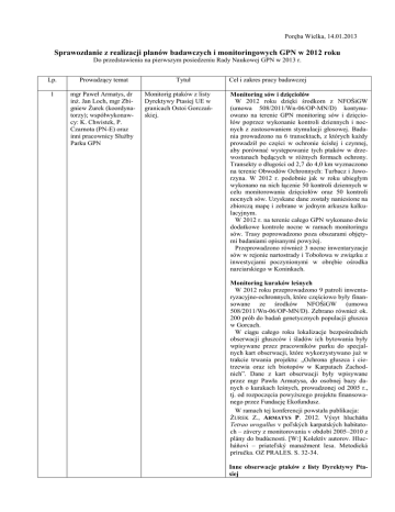 Poręba Wielka, 14.01.2013 Sprawozdanie z realizacji planów badawczych i monitoringowych GPN w 2012 roku Do przedstawienia na pierwszym posiedzeniu Rady Naukowej GPN w 2013 r. Lp. Prowadzący temat 1 mgr Paweł Armatys, dr inż. Jan Loch, mgr Zbigniew Żurek (koordynatorzy); współwykonawcy: K. Chwistek, P. Czarnota (PN-E) oraz inni pracownicy Służby Parku GPN Tytuł Monitorig ptaków z listy Dyrektywy Ptasiej UE w granicach Ostoi Gorczańskiej. Cel i zakres pracy badawczej Monitoring sów i dzięciołów W 2012 roku dzięki środkom z NFOŚiGW (umowa 508/2011/Wn-06/OP-MN/D) kontynuowano na terenie GPN monitoring sów i dzięciołów poprzez wykonanie kontroli dziennych i nocnych z zastosowaniem stymulacji głosowej. Badania prowadzono na 6 transektach, z których każdy prowadził po części w ochronie ścisłej i czynnej, aby porównać występowanie tych ptaków w drzewostanach będących w różnych formach ochrony. Transekty o długości od 2,7 do 4,0 km wyznaczono na terenie Obwodów Ochronnych: Turbacz i Jaworzyna. W 2012 r. podobnie jak w roku ubiegłym wykonano na nich łącznie 50 kontroli dziennych w celu monitorowania dzięciołów oraz 50 kontroli nocnych sów. Uzyskane dane zostały naniesione na zbiorczą mapę i zebrane w jednym arkuszu kalkulacyjnym. W 2012 r. na terenie całego GPN wykonano dwie dodatkowe kontrole nocne w ramach monitoringu sów. Trasy poprowadzono poza obszarami objętymi badaniami opisanymi powyżej. Przeprowadzono również 3 nocne inwentaryzacje sów w rejonie nartostrady i Tobołowa w związku z inwestycjami poczynionymi w obrębie ośrodka narciarskiego w Koninkach. Monitoring kuraków leśnych W 2012 roku przeprowadzono 9 patroli inwentaryzacyjno-ochronnych, które częściowo były finansowane ze środków NFOŚiGW (umowa 508/2011/Wn-06/OP-MN/D). Zebrano również ok. 200 prób do badań genetycznych populacji głuszca w Gorcach. W ciągu całego roku lokalizacje bezpośrednich obserwacji głuszców i śladów ich bytowania były wpisywane przez pracowników parku do specjalnych kart obserwacji, które wykorzystywano już w trakcie trwania projektu: „Ochrona głuszca i cietrzewia oraz ich biotopów w Karpatach Zachodnich”. Dane z kart obserwacji były wpisywane przez mgr Pawła Armatysa, do osobnej bazy danych o kurakach leśnych, prowadzonej od 2005 r., tj. od rozpoczęcia powyższego projektu finansowanego przez Fundację Ekofundusz. W ramach tej konferencji powstała publikacja: ŻUREK Z., ARMATYS P. 2012. Výsyt hlucháňa Tetrao urogallus v poľských karpatských habitatoch – závery z monitorovania v období 2005–2010 z plány do budúcnosti. [W:] Kolektív autorov. Hlucháňovi – priateľský manažment lesa. Metodická príručka. OZ PRALES. S. 32-34. Inne obserwacje ptaków z listy Dyrektywy Ptasiej Udział w projekcie pt: „Inwentaryzacja kluczowych gatunków ptaków polskich Karpat oraz stworzenie systemu ich monitorowania i ochrony„ realizowanym przez Ogólnopolskie Towarzystwo Ochrony Ptaków. ptaki szponiaste – 1 kwadrat 10x5km. – PAWEŁ ARMATYS, JAN LOCH. Dane przekazano do siedziby OTOP celem zbiorczego opracowania od roku 2010. W ramach Państwowego Monitoringu Środowiska monitorowano występowanie dzięcioła trójpalczastego i białogrzbietego na stałych powierzchniach (4 kwadraty 2x2km) na terenie GPN i otuliny – PAWEŁ ARMATYS, JAN LOCH. Dane przekazano do siedziby OTOP celem zbiorczego opracowania dla GIOŚ. Udział w ogólnopolskim Monitoringu Pospolitych Ptaków Lęgowych na kwadratach 1x1km organizowanym przez OTOP. – PAWEŁ ARMATYS, JAN LOCH. Dane przekazano do siedziby OTOP celem zbiorczego corocznego opracowania. Monitoring ptaków zimujących nad rzeką Porębianka. Na odcinku od mostu w Porębie Wielkiej (most w kierunku Koninek) aż do ujścia do Mszanki wyznaczono 15 stałych punktów obserwacyjnych, na których zapisywano wszystkie stwierdzone ptaki. Łącznie zaobserwowano 23 gatunki, dla których wg formularza określano ponadto dane pogodowe i grubość pokrywy lodowej. Monitoring ptaków szponiastych W 2012 roku dzięki środkom z NFOŚiGW (umowa 508/2011/Wn-06/OP-MN/D) prowadzono monitoring ptaków szponiastych na 10 punktach obserwacyjnych rozmieszczonych na terenie Parku. Przeprowadzono 4 kontrole w miesiącach: marzec – 1, maj – 1, lipiec – 2. Stwierdzono następujące gatunki ptaków: orzeł przedni, orlik krzykliwy, trzmielojad, myszołów, jastrząb, krogulec, pustułka, kobuz i prawdopodobnie sokół wędrowny. Dodatkowo odnotowano stwierdzenia bociana czarnego i kruka. W monitoring zaangażowani zostali także specjaliści ornitolodzy spoza Służby GPN: Michał Baran, Andrzej Bisztyga, Marcin Matysek i Paweł Wieczorek. W 2012 r. przeprowadzono kontrolę znanych gniazd orła przedniego na terenie GPN i otoczenia. Po udanym lęgu w 2011 r. para orłów prawdopodobnie w ogóle nie przystąpiła do lęgów w 2012 r. Znane gniazdo nie było zajęte (przeprowadzono 3 kontrole), a także nie zaobserwowano młodego, tegorocznego ptaka. Natomiast zeszłoroczny młody osobnik był stwierdzany w okresie wiosennym w towarzystwie pary ptaków dorosłych. W 2012 r. uschła jodła (prawdopodobna przyczyna: grzyby patogeniczne), na której znajdowało się gniazdo na terenie GPN. Całoroczne obserwacje przyrodnicze w GPN Oprócz cyklicznych notowań przy okazji prac monitoringowych związanych z realizacją przed- 2 mgr Paweł Armatys dr Tomasz Skalski (UJ Kraków) Wpływ koszenia i wypasu na organizację zgrupowań owadów na polanach reglowych GPN. sięwzięć finansowanych ze źródeł pozabudżetowych, na terenie Parku prowadzone są całoroczne obserwacje przyrodnicze. Pracownicy Służby Parku spisują swoje spostrzeżenia na przygotowanych do tego celu kartach obserwacji. Lista gatunków, które podlegają rejestracji na kartach obejmuje również ptaki figurujące w Dyrektywie Ptasiej UE. Wszystkie dane z kart wpisywane są do bazy danych „Obserwacje przyrodnicze w GPN