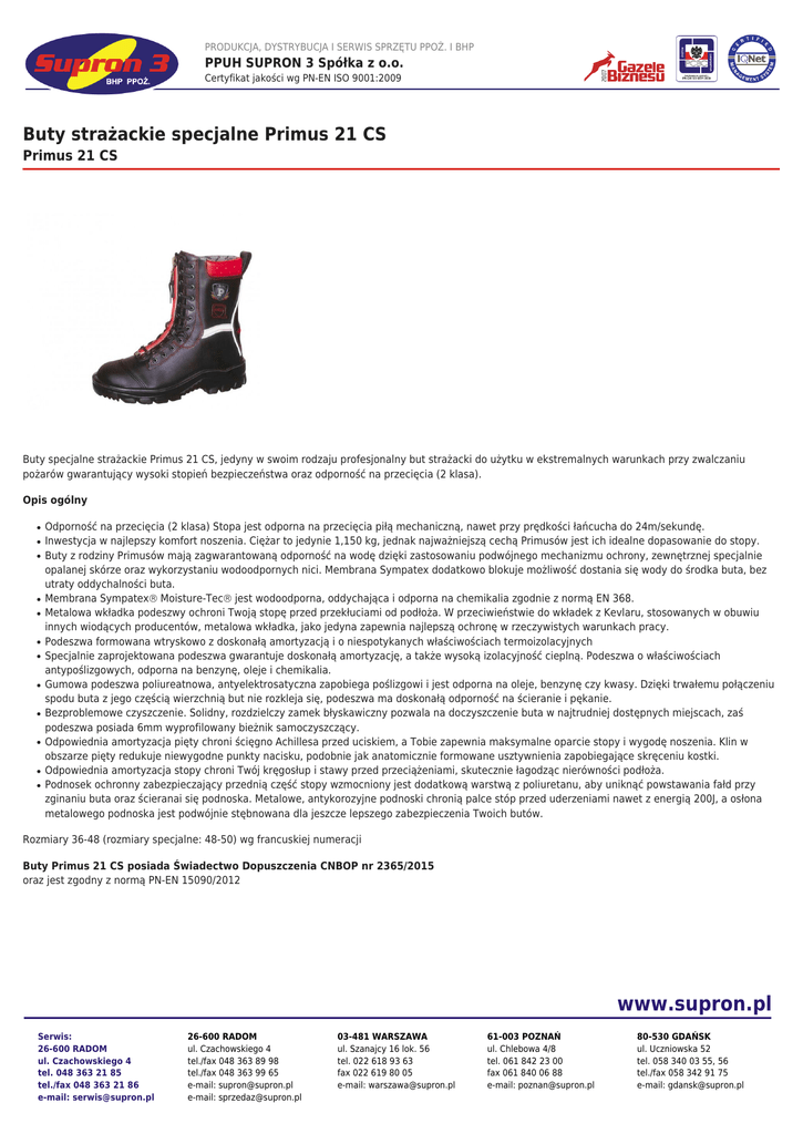 PRODUKCJA, DYSTRYBUCJA I SERWIS SPRZĘTU PPOŻ. I BHP PPUH SUPRON 3 Spółka z o.o. Certyfikat jakości wg PN-EN ISO 9001:2009 Buty strażackie specjalne Primus 21 CS Primus 21 CS Buty specjalne strażackie Primus 21 CS, jedyny w swoim rodzaju profesjonalny but strażacki do użytku w ekstremalnych warunkach przy zwalczaniu pożarów gwarantujący wysoki stopień bezpieczeństwa oraz odporność na przecięcia (2 klasa). Opis ogólny ● ● ● ● ● ● ● ● ● ● ● ● Odporność na przecięcia (2 klasa) Stopa jest odporna na przecięcia piłą mechaniczną, nawet przy prędkości łańcucha do 24m/sekundę. Inwestycja w najlepszy komfort noszenia. Ciężar to jedynie 1,150 kg, jednak najważniejszą cechą Primusów jest ich idealne dopasowanie do stopy. Buty z rodziny Primusów mają zagwarantowaną odporność na wodę dzięki zastosowaniu podwójnego mechanizmu ochrony, zewnętrznej specjalnie opalanej skórze oraz wykorzystaniu wodoodpornych nici. Membrana Sympatex dodatkowo blokuje możliwość dostania się wody do środka buta, bez utraty oddychalności buta. Membrana Sympatex Moisture-Tec jest wodoodporna, oddychająca i odporna na chemikalia zgodnie z normą EN 368. Metalowa wkładka podeszwy ochroni Twoją stopę przed przekłuciami od podłoża. W przeciwieństwie do wkładek z Kevlaru, stosowanych w obuwiu innych wiodących producentów, metalowa wkładka, jako jedyna zapewnia najlepszą ochronę w rzeczywistych warunkach pracy. Podeszwa formowana wtryskowo z doskonałą amortyzacją i o niespotykanych właściwościach termoizolacyjnych Specjalnie zaprojektowana podeszwa gwarantuje doskonałą amortyzację, a także wysoką izolacyjność cieplną. Podeszwa o właściwościach antypoślizgowych, odporna na benzynę, oleje i chemikalia. Gumowa podeszwa poliureatnowa, antyelektrosatyczna zapobiega poślizgowi i jest odporna na oleje, benzynę czy kwasy. Dzięki trwałemu połączeniu spodu buta z jego częścią wierzchnią but nie rozkleja się, podeszwa ma doskonałą odporność na ścieranie i pękanie. Bezproblemowe czyszczenie. Solidny, rozdzielczy zamek błyskawiczny pozwala na doczyszczenie buta w najtrudniej dostępnych miejscach, zaś podeszwa posiada 6mm wyprofilowany bieżnik samoczyszczący. Odpowiednia amortyzacja pięty chroni ścięgno Achillesa przed uciskiem, a Tobie zapewnia maksymalne oparcie stopy i wygodę noszenia. Klin w obszarze pięty redukuje niewygodne punkty nacisku, podobnie jak anatomicznie formowane usztywnienia zapobiegające skręceniu kostki. Odpowiednia amortyzacja stopy chroni Twój kręgosłup i stawy przed przeciążeniami, skutecznie łagodząc nierówności podłoża. Podnosek ochronny zabezpieczający przednią część stopy wzmocniony jest dodatkową warstwą z poliuretanu, aby uniknąć powstawania fałd przy zginaniu buta oraz ścieranai się podnoska. Metalowe, antykorozyjne podnoski chronią palce stóp przed uderzeniami nawet z energią 200J, a osłona metalowego podnoska jest podwójnie stębnowana dla jeszcze lepszego zabezpieczenia Twoich butów. Rozmiary 36-48 (rozmiary specjalne: 48-50) wg francuskiej numeracji Buty Primus 21 CS posiada Świadectwo Dopuszczenia CNBOP nr 2365/2015 oraz jest zgodny z normą PN-EN 15090/2012 www.supron.pl Serwis: 26-600 RADOM ul. Czachowskiego 4 tel. 048 363 21 85 tel./fax 048 363 21 86 e-mail: [email protected] 26-600 RADOM ul. Czachowskiego 4 tel./fax 048 363 89 98 tel./fax 048 363 99 65 e-mail: [email protected] e-mail: [email protected] 03-481 WARSZAWA ul. Szanajcy 16 lok. 56 tel. 022 618 93 63 fax 022 619 80 05 e-mail: [email protected] 61-003 POZNAŃ ul. Chlebowa 4/8 tel. 061 842 23 00 fax 061 840 06 88 e-mail: [email protected] 80-530 GDAŃSK ul. Uczniowska 52 tel. 058 340 03 55, 56 tel./fax 058 342 91 75 e-mail: [email protected]