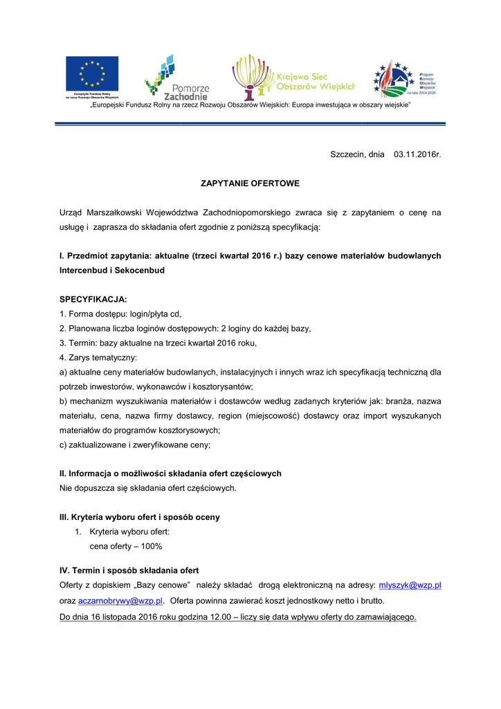 „Europejski Fundusz Rolny na rzecz Rozwoju Obszarów Wiejskich: Europa inwestująca inwestuj ca w obszary wiejskie” Szczecin, dnia 03.11.2016r. ZAPYTANIE OFERTOWE Urząd d Marszałkowski Województwa Zachodniopomorskiego zwraca si się z zapytaniem o cenę cen na usługę i zaprasza do składania ofert zgodnie z poniższą poni specyfikacją: I. Przedmiot zapytania: aktualne (trzeci kwartał 2016 r.) bazy cenowe materiałów budowlanych Intercenbud i Sekocenbud SPECYFIKACJA: 1. Forma dostępu: login/płyta cd, 2. Planowana liczba loginów dostępowych: dostę 2 loginy do każdej bazy, 3. Termin: bazy aktualne na trzeci kwartał 2016 roku, 4. Zarys tematyczny: a) aktualne ceny materiałów budowlanych, instalacyjnych i innych wraz ich specyfikacją specyfikacj techniczną dla potrzeb inwestorów, wykonawców i kosztorysantów; b) mechanizm wyszukiwania materiałów i dostawców według zadanych kryteriów kryteriów jak: branża, bran nazwa materiału, cena, nazwa firmy dostawcy, region (miejscowość) (miejscowo ) dostawcy oraz import wyszukanych materiałów do programów kosztorysowych; c) zaktualizowane i zweryfikowane ceny; II. Informacja o możliwości ci składania ofert cz częściowych Nie dopuszcza się składania ofert częściowych. cz III.. Kryteria wyboru ofert i sposób oceny 1. Kryteria wyboru ofert: cena oferty – 100% IV. Termin i sposób składania dania ofert Oferty z dopiskiem „Bazy cenowe” należy składać drogą elektroniczną na adresy: [email protected] oraz [email protected]. Oferta powinna zawierać zawiera koszt jednostkowy netto i brutto. Do dnia 16 listopada 2016 roku godzina 12.00 – liczy się data wpływu oferty do zamawiającego. zamawiaj V. Płatność Przelew (21 dni) VI. Osoby wyznaczone do kontaktów Do kontaktów i wyjaśnień ze strony Zamawiającego upoważniona/y jest Pan Michał Łyszyk - tel 91 31 29 355 oraz Pani Agnieszka Czarnobrywy Tel 91 31 29 307.