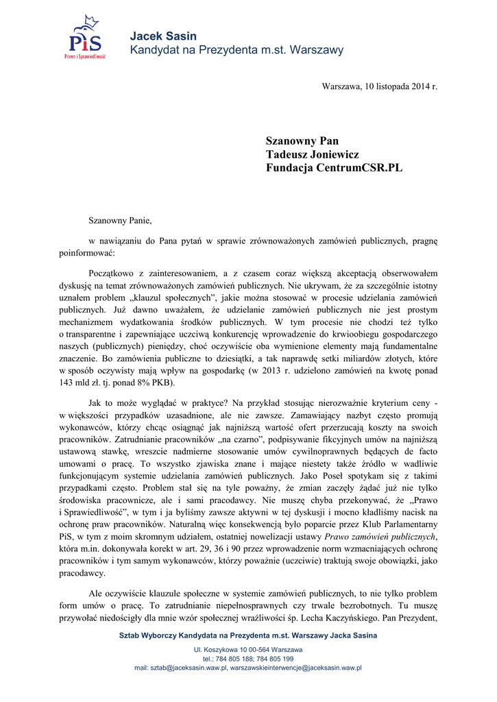 Jacek Sasin Kandydat na Prezydenta m.st. Warszawy Warszawa, 10 listopada 2014 r. Szanowny Pan Tadeusz Joniewicz Fundacja CentrumCSR.PL Szanowny Panie, w nawiązaniu do Pana pytań w sprawie zrównoważonych zamówień publicznych, pragnę poinformować: Początkowo z zainteresowaniem, a z czasem coraz większą akceptacją obserwowałem dyskusję na temat zrównoważonych zamówień publicznych. Nie ukrywam, że za szczególnie istotny uznałem problem „klauzul społecznych”, jakie można stosować w procesie udzielania zamówień publicznych. Już dawno uważałem, że udzielanie zamówień publicznych nie jest prostym mechanizmem wydatkowania środków publicznych. W tym procesie nie chodzi też tylko o transparentne i zapewniające uczciwą konkurencję wprowadzenie do krwioobiegu gospodarczego naszych (publicznych) pieniędzy, choć oczywiście oba wymienione elementy mają fundamentalne znaczenie. Bo zamówienia publiczne to dziesiątki, a tak naprawdę setki miliardów złotych, które w sposób oczywisty mają wpływ na gospodarkę (w 2013 r. udzielono zamówień na kwotę ponad 143 mld zł. tj. ponad 8% PKB). Jak to może wyglądać w praktyce? Na przykład stosując nierozważnie kryterium ceny w większości przypadków uzasadnione, ale nie zawsze. Zamawiający nazbyt często promują wykonawców, którzy chcąc osiągnąć jak najniższą wartość ofert przerzucają koszty na swoich pracowników. Zatrudnianie pracowników „na czarno”, podpisywanie fikcyjnych umów na najniższą ustawową stawkę, wreszcie nadmierne stosowanie umów cywilnoprawnych będących de facto umowami o pracę. To wszystko zjawiska znane i mające niestety także źródło w wadliwie funkcjonującym systemie udzielania zamówień publicznych. Jako Poseł spotykam się z takimi przypadkami często. Problem stał się na tyle poważny, że zmian zaczęły żądać już nie tylko środowiska pracownicze, ale i sami pracodawcy. Nie muszę chyba przekonywać, że „Prawo i Sprawiedliwość”, w tym i ja byliśmy zawsze aktywni w tej dyskusji i mocno kładliśmy nacisk na ochronę praw pracowników. Naturalną więc konsekwencją było poparcie przez Klub Parlamentarny PiS, w tym z moim skromnym udziałem, ostatniej nowelizacji ustawy Prawo zamówień publicznych, która m.in. dokonywała korekt w art. 29, 36 i 90 przez wprowadzenie norm wzmacniających ochronę pracowników i tym samym wykonawców, którzy poważnie (uczciwie) traktują swoje obowiązki, jako pracodawcy. Ale oczywiście klauzule społeczne w systemie zamówień publicznych, to nie tylko problem form umów o pracę. To zatrudnianie niepełnosprawnych czy trwale bezrobotnych. Tu muszę przywołać niedościgły dla mnie wzór społecznej wrażliwości śp. Lecha Kaczyńskiego. Pan Prezydent, Sztab Wyborczy Kandydata na Prezydenta m.st. Warszawy Jacka Sasina Ul. Koszykowa 10 00-564 Warszawa tel.; 784 805 188; 784 805 199 mail: [email protected], [email protected] Jacek Sasin Kandydat na Prezydenta m.st. Warszawy a miałem zaszczyt współpracować z Nim przez wiele lat, zawsze uczulał swoich współpracowników, by patrzeć na problemy i zadania przez pryzmat ludzi, których one dotyczą. Ustawa Prawo zamówień publicznych daje taką możliwość i jestem zwolennikiem stosowania instrumentów tam opisanych w przedmiotowym zakresie. Odnosząc się natomiast do drugiego elementu „zrównoważonych zamówień publicznych” czyli do tzw. „zielonych zamówień”, to również patrzę na tę dziedzinę z zainteresowaniem. Sama ustawa Prawo zamówień publicznych otwiera np. możliwość określania kryteriów wyboru oferty na podstawie „aspektów środowiskowych”. Musimy jednak pamiętać, że doświadczenia w tym zakresie nie są w Polsce imponujące, a i instrumentarium prawne dość skromne. Wystarczy wspomnieć – obok cytowanego powyżej przepisu art. 91 ust. 2 Pzp – jedno Rozporządzenie Prezesa Rady Ministrów z 11 maja 2011 r. w sprawie innych niż cena obowiązkowych kryteriów oceny ofert w odniesieniu do rodzajów zamówień publicznych (akt prawny, którego recepcja na grunt praktyczny przebiega, delikatnie mówiąc, średnio). Oczywiście pamiętam o nowych Dyrektywach Parlamentu Europejskiego i Rady Unii Europejskiej dot. zamówień publicznych z lutego b.r., gdzie bardzo silnie akcentowane są kwestie ochrony środowiska. Mam więc świadomość, że dziedzina ta będzie w istotny sposób wpływała w przyszłości na rynek zamówień publicznych. Można tu dostrzec szanse, ale nie możemy odwracać oczu od zagrożeń. Proponowane przez ustawodawcę unijnego przepisy dotyczące „rachunku kosztów cyklu życia” przynoszą wielkie niebezpieczeństwo dla naszej gospodarki. W tym kontekście nie można nie wspomnieć o tzw. „pakiecie klimatycznym”. Zwracam na te elementy uwagę, by podkreślić, że słuszne postulaty dotyczące ochrony środowiska muszą być wprowadzane rozsądnie, przy uwzględnieniu wszystkich okoliczności. Tak widzę swoją rolę, jako parlamentarzysta, a w przyszłości – wierzę – Prezydent m. st. Warszawy. W tym miejscu wypada powiedzieć kilka słów o jeszcze jednym, zdaniem niektórych komentatorów, elemencie „zrównoważonych zamówień publicznych” tj. wsparciu małych i średnich przedsiębiorstw (MŚP). Jestem ogromnym zwolennikiem tego sektora naszej gospodarki i uważam, że zamówienia publiczne mogą być ważnym elementem kształtowania jego kondycji. Tu znów powołam się na nowe Dyrektywy unijne dot. zamówień publicznych, gdzie wsparciu dla MŚP poświęcono wiele miejsca. Tu widzę też ogromną rolę dla samorządu terytorialnego. Mając powyższe na uwadze, mogę złożyć deklarację, że Warszawa pod moim kierownictwem będzie miejscem, gdzie zrównoważone zamówienia publiczne będą traktowane poważnie. Na zakończenie, pragnę podziękować za Państwa inicjatywę i stworzenie tym samym możliwości do prezentacji przez kandydatów na stanowisko