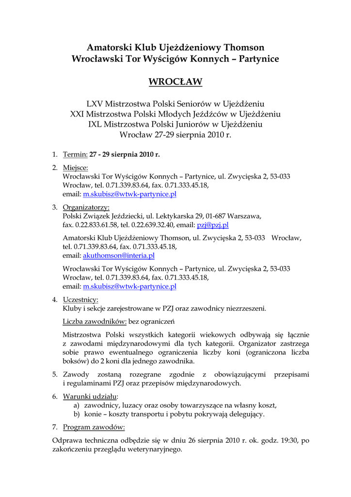 Amatorski Klub Ujeżdżeniowy Thomson Wrocławski Tor Wyścigów Konnych – Partynice WROCŁAW LXV Mistrzostwa Polski Seniorów w Ujeżdżeniu XXI Mistrzostwa Polski Młodych Jeźdźców w Ujeżdżeniu IXL Mistrzostwa Polski Juniorów w Ujeżdżeniu Wrocław 27-29 sierpnia 2010 r. 1. Termin: 27 - 29 sierpnia 2010 r. 2. Miejsce: Wrocławski Tor Wyścigów Konnych – Partynice, ul. Zwycięska 2, 53-033 Wrocław, tel. 0.71.339.83.64, fax. 0.71.333.45.18, email: [email protected] 3. Organizatorzy: Polski Związek Jeździecki, ul. Lektykarska 29, 01-687 Warszawa, fax. 0.22.833.61.58, tel. 0.22.639.32.40, email: [email protected] Amatorski Klub Ujeżdżeniowy Thomson, ul. Zwycięska 2, 53-033 Wrocław, tel. 0.71.339.83.64, fax. 0.71.333.45.18, email: [email protected] Wrocławski Tor Wyścigów Konnych – Partynice, ul. Zwycięska 2, 53-033 Wrocław, tel. 0.71.339.83.64, fax. 0.71.333.45.18, email: [email protected] 4. Uczestnicy: Kluby i sekcje zarejestrowane w PZJ oraz zawodnicy niezrzeszeni. Liczba zawodników: bez ograniczeń Mistrzostwa Polski wszystkich kategorii wiekowych odbywają się łącznie z zawodami międzynarodowymi dla tych kategorii. Organizator zastrzega sobie prawo ewentualnego ograniczenia liczby koni (ograniczona liczba boksów) do 2 koni dla jednego zawodnika. 5. Zawody zostaną rozegrane zgodnie z obowiązującymi i regulaminami PZJ oraz przepisów międzynarodowych. przepisami 6. Warunki udziału: a) zawodnicy, luzacy oraz osoby towarzyszące na własny koszt, b) konie – koszty transportu i pobytu pokrywają delegujący. 7. Program zawodów: Odprawa techniczna odbędzie się w dniu 26 sierpnia 2010 r. ok. godz. 19:30, po zakończeniu przeglądu weterynaryjnego. . Przegląd koni odbędzie się w dniu 26 sierpnia 2010 r. o godzinie 17:00. DZIEŃ Runda I 1 CS-1 Inter II (FEI, ed. 2009) 2 CC-2 Progr. Zesp. MEMJ St. Georg (FEI, ed. 2009) 3 C-4 Progr. Zesp. MEJ (FEI, ed. 2009) nr II 1 CS-2 Grand Prix (FEI, ed. 2009) 5 3 CC-3 Progr. Indyw. MEMJ (FEI, ed. 2009) 7 4 C-5 Progr. Indyw. MEJ (FEI, ed. 2009) nr 8 III CS-5 Grand Prix Free Style (FEI, ed. 1999, popr. 2009) CC-6 Free Style MEMJ (FEI, ed. 2006, popr. 2009) C-6 Free Style MEJ (FEI, ed 2006, popr. 2009) nr Uczestnictwo 9 Mistrzostwa Polski Seniorów 11 Mistrzostwa Polski Młodych Jeźdźców 12 Mistrzostwa Polski Juniorów Numery konkursów! UWAGA! Prosimy o zapoznanie się z listami startowymi, gdyż zawody nie musza odbywać się według kolejności konkursów zgodnej z numeracja podaną w propozycjach!! 8. Opłata i zgłoszenia: Boksy: stajnie letnie 280,00 zł za całe zawody, tj. od 26 (godz. 12) do 29 sierpnia 2010 r. do godziny 21.00 W przypadku wcześniejszego przyjazdu na zawody, ewentualnie późniejszego wyjazdu, pobierana będzie dodatkowa opłata w wysokości 50,00 zł dziennie za boks. Uwaga! Prosimy o zabieranie na zawody wiader-żłobów. Opłata organizacyjna: w rundzie MP Kuców, MPJ i MPMJ 300,00 zł od konia. W rundzie MPS zawodnicy mają do wyboru albo udział w CDI-W i opłaty, ale też i udział w nagrodach CDI, albo udział wyłącznie w Mistrzostwach Polski Seniorów, wtedy opłata organizacyjna wynosi 250,00 zł od konia, a nagrody zgodnie z pkt. 16 propozycji. 15,00 zł od każdego konia na Fundusz Badań Antydopingowych. Opłat należy dokonywać na konto bankowe Amatorski Klub Ujeżdżeniowy THOMSOO, ul. Zwycięska 2, 53-033 Wrocław, Bank Gospodarki Żywnościowej Oddział Wrocław nr 50 2030 0045 1110 0000 0035 8590 wraz ze zgłoszeniami. Uwaga: Organizator zastrzega sobie prawo uwzględniania wyłącznie zgłoszeń przesłanych wraz z potwierdzeniem opłaty za boks. Wniesione opłaty za niewykorzystane boksy nie podlegają zwrotowi. Za konie zgłoszone po terminie pobierana będzie podwójna opłata. Uwaga!!! Pary, za które nie zostaną uiszczone opłaty na konto bankowe nie zostaną dopuszczone do startu. Kluby, których zawodnicy zostali zgłoszeni do startu i nie zgłosili rezygnacji w terminie zgłoszenia ostatecznego zostaną obciążone wszystkimi opłatami dotyczącymi ich zawodników. To samo dotyczy zgłoszonych zawodników niezrzeszonych, którzy niedopełnia tego obowiązku. Organizator nie pośredniczy w zamawianiu noclegów Najbliższe hotele: 1. Hotel Podkowa * Wojszycka Str. 8, Wrocław Phone: +48.71.790.01.11, Fax: +48.71.339.83.60 e-mail: [email protected] 2. Hotel Wieniawa ** Gajowicka Str. 130, Wrocław Phone: +48.71.765.33.03, Fax: +48.71.338.06.38 e-mail: [email protected] 3. Hotel Bacero *** Ołtaszyńska Str. 107, Wrocław Phone: +48.71.793.26.45-6, Fax: +48.71.339.75.50 e-mail: [email protected] 4. Hotel Agro – Ooclegi Zwycięska Zwycięska Str. 12, Wrocław Phone: +48.71.339.80.21-2 5. Oovotel Hotel Orbis *** Wyścigowa Str. 35, Wrocław Phone: +48.71.339.85.15, Fax: +48.71.339.80.75 e-mail: [email protected] 6. Hotel Wrocław Orbis **** Powstańców Śląskich Str. 7, Wrocław Phone: +48.71.361.46.51, Fax: +48.71.361.66.17 e-mail: [email protected] 7. Hotel Bielany *** Klecińska Str. 3, Bielany Wrocławskie Phone: +48.71.311.27.94, Fax: +48.71.335.29.01 e-mail: [email protected] [email protected] Hotele: Agro – Noclegi Zwycięska, Bacero, Novotel w odległości ok. 0,5 km od WTWK – Partynice, Hotel Podkowa w odległości ok. 1 km, Hotel Wrocław ok. 4 km od WTWK – Partynice, Hotele Bielany i Wieniawa ok. 7 minut jazdy samochodem. Noclegi zamawiać należy samodzielnie. Organizator nie zapewnia transportu do hoteli. W trakcie imprezy czynna będzie restauracja na terenie WTWK - Partynice 9. Warunki techniczne: a) czworobok konkursowy – podłoże piaszczyste b) rozprężania – podłoże piaszczyste 10. Termin przysyłania zgłoszeń: Termin przesyłania zgłoszeń wstępnych upływa w dniu 5 sierpnia 2010 r. Termin przesyłania zgłoszeń ostatecznych (wyłącznie na drukach PZJ) upływa w dniu 13 sierpnia 2010 r. Zgłoszenia należy nadsyłać na adres Amatorski Klub Ujeżdżeniowy Thomson, ul. Zwycięska 2, 53-033 Wrocław. Zgłoszeń należy dok